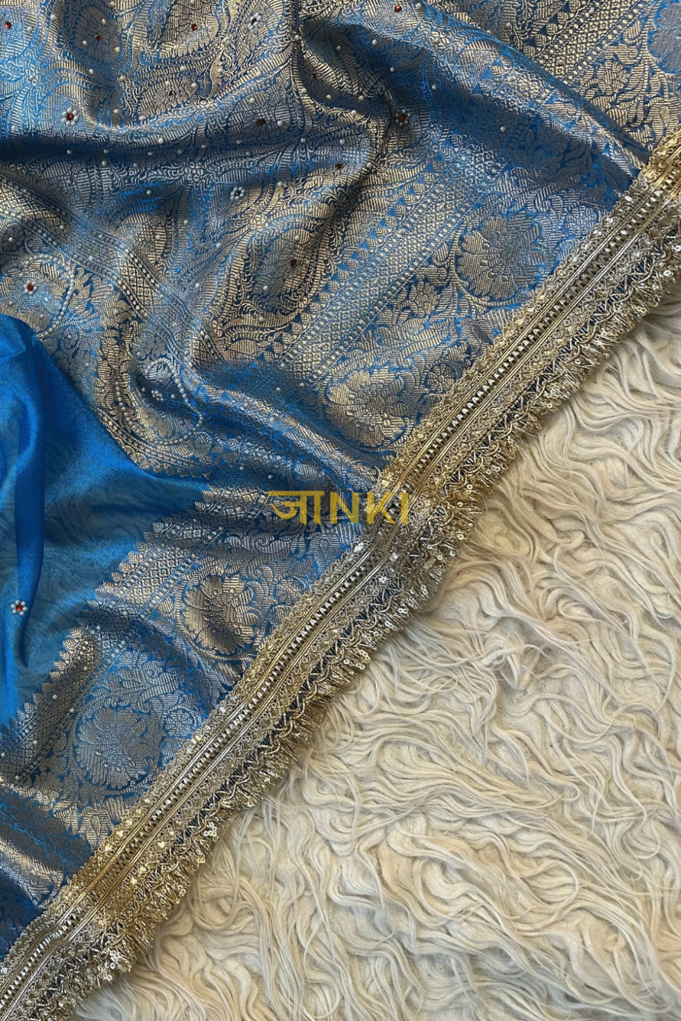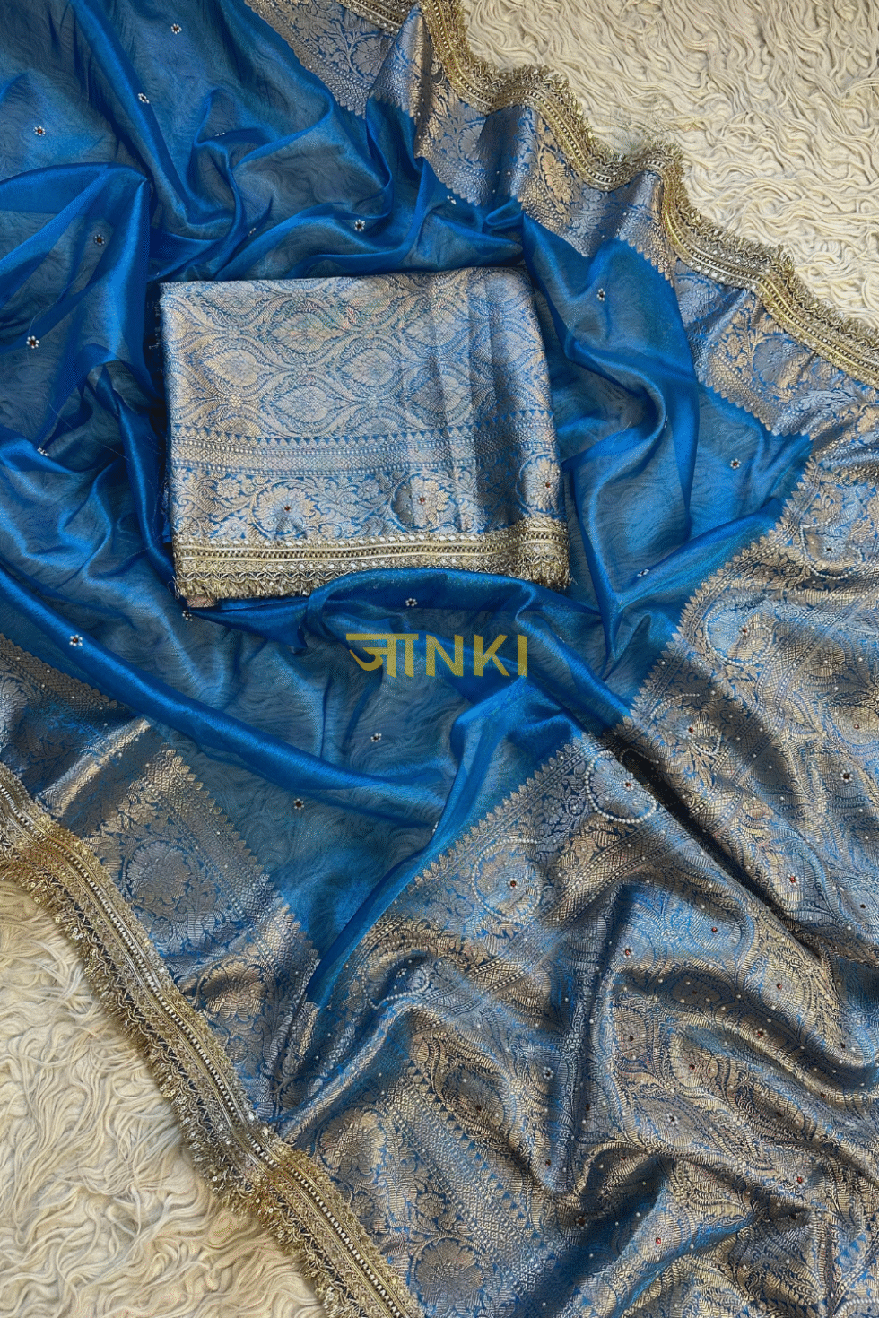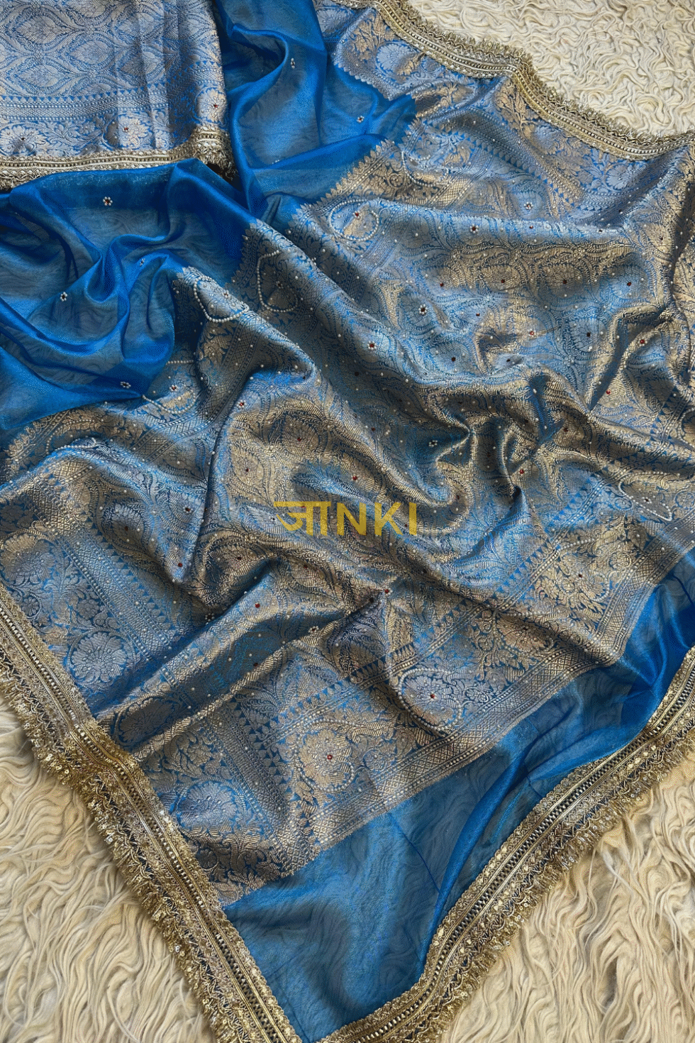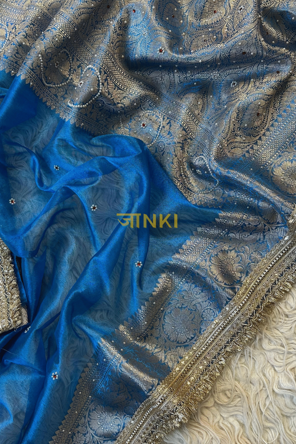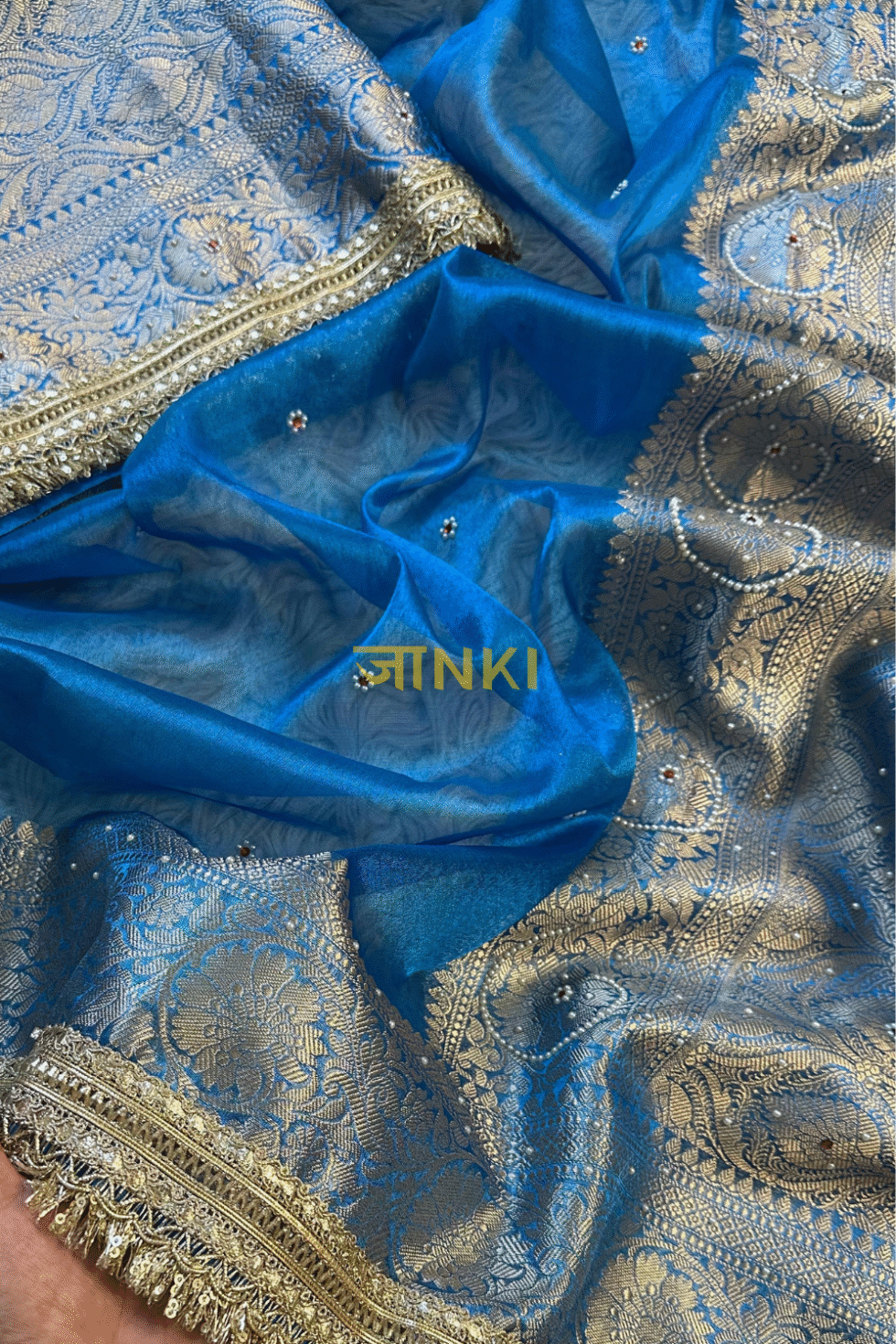 A sky blue Banarasi tissue saree with zari-meenakari buttas, antique-gold border, and ornate fringed pallu — a serene yet regal choice for weddings and festive occasions.