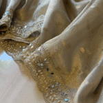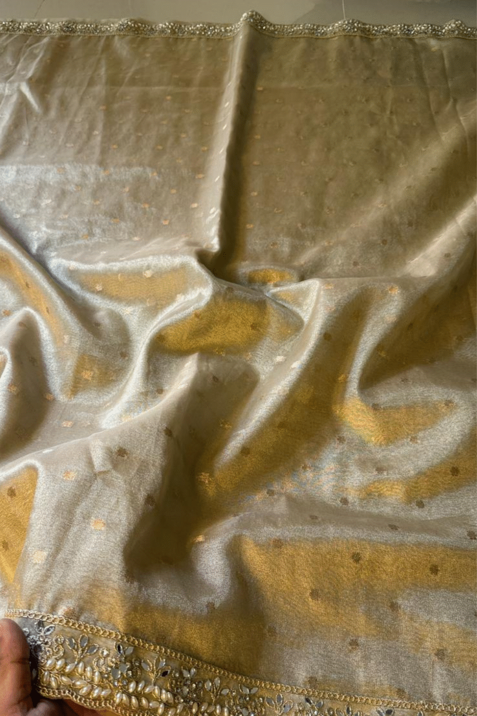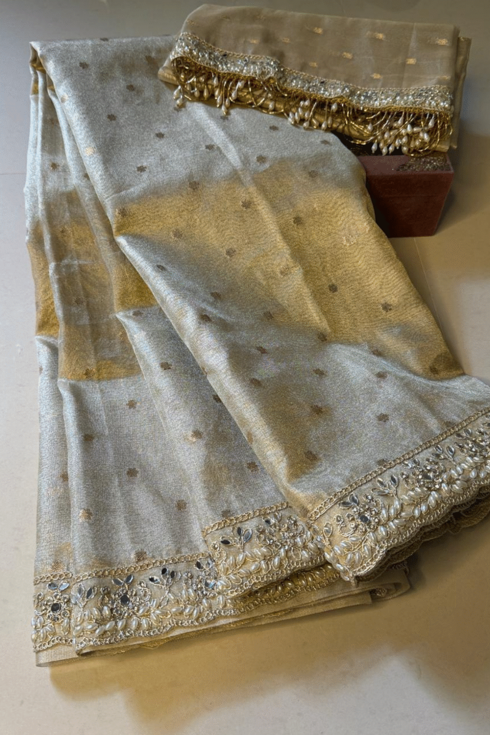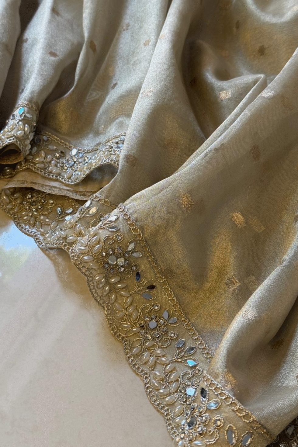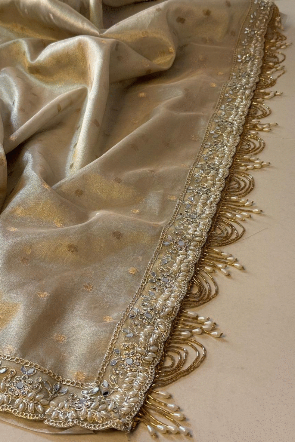 A champagne-gold tissue saree with delicate woven buttas and a beautifully hand-embellished border featuring pearls, sequins, and tassels. Lightweight, luxurious, and perfect for weddings, receptions, and festive occasions.