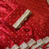 The highlight is the hand-embellished border, intricately adorned with shimmering stones, pearls, sequins, and threadwork. The scalloped detailing and the long dangling pearl tassels make the saree look grand, festive, and truly statement-worthy. It gives the perfect bridal and reception-ready finish while keeping the overall look lightweight.