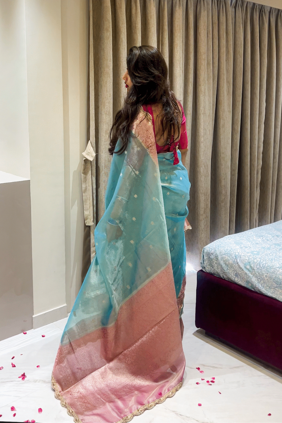 Woven in lustrous Banarasi tissue silk, this saree carries a soft yet grand drape. The fabric has a gentle shimmer that reflects light beautifully, making it ideal for weddings and festive wear while remaining lightweight and easy to carry.