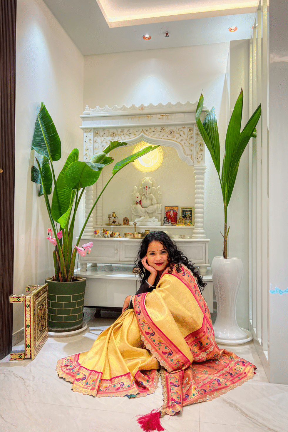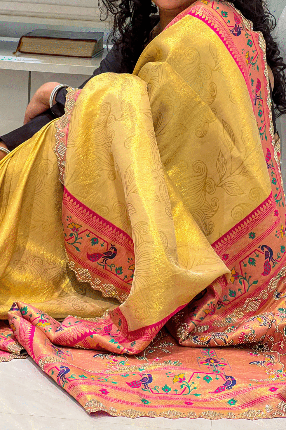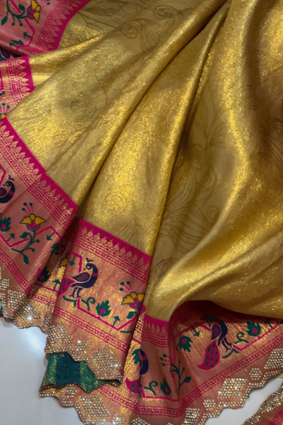 A radiant golden silk saree with elegant printed motifs, highlighted by a deep pink Paithani-inspired zari border and pallu. Paired with a matching blouse, it blends regal charm with timeless tradition—perfect for weddings and festive occasions.