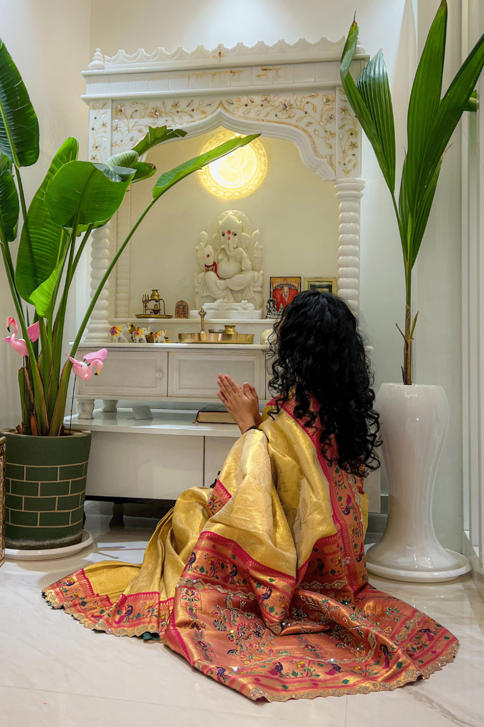 Pair with kundan or temple jewelry, a bold lip color, and a sleek bun or braid to enhance the saree’s royal silk elegance.