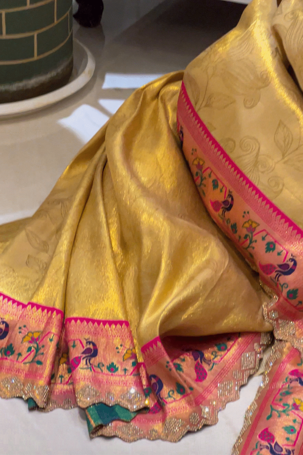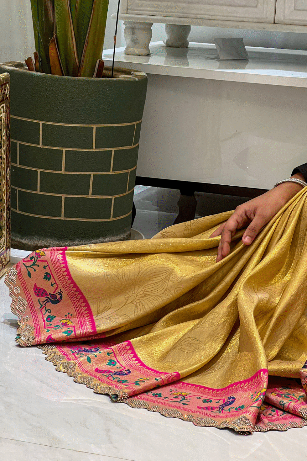 The body features printed motifs that lend a contemporary touch to the luxurious silk. The prints balance the richness of gold with an artistic edge, creating harmony between modern and classic.