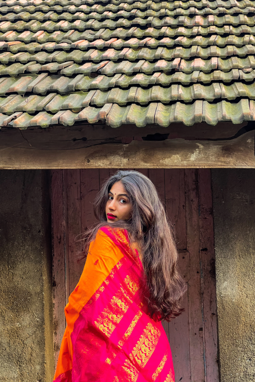 A vibrant pink Paithani border, intricately woven with golden zari and classic floral patterns. The pink against the orange adds a playful yet elegant contrast, full of character and charm.