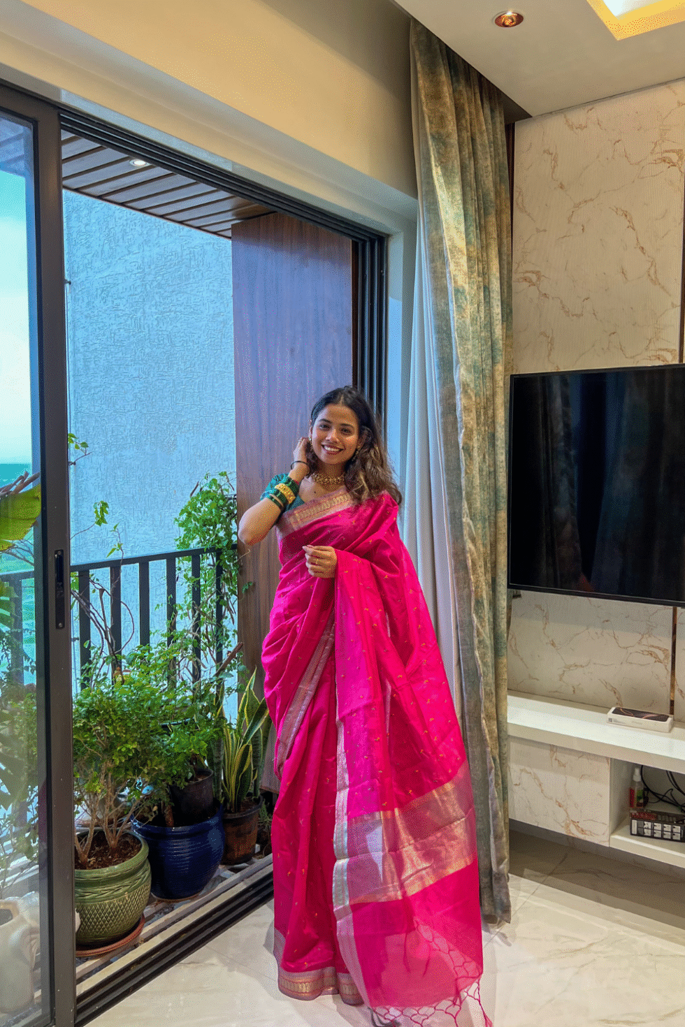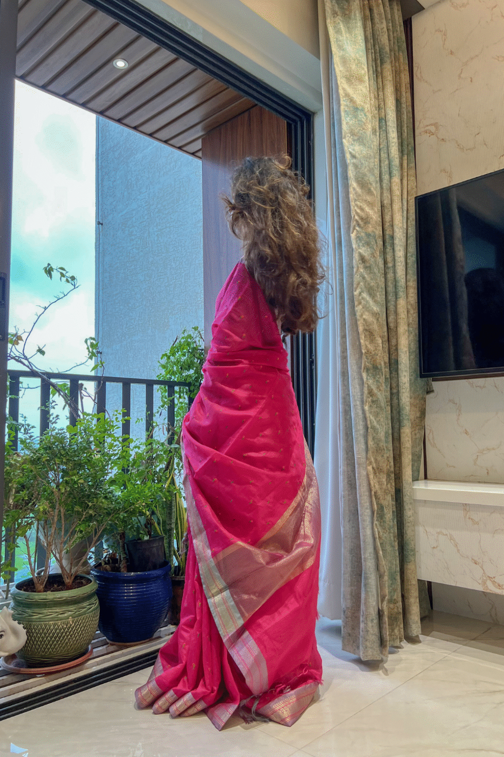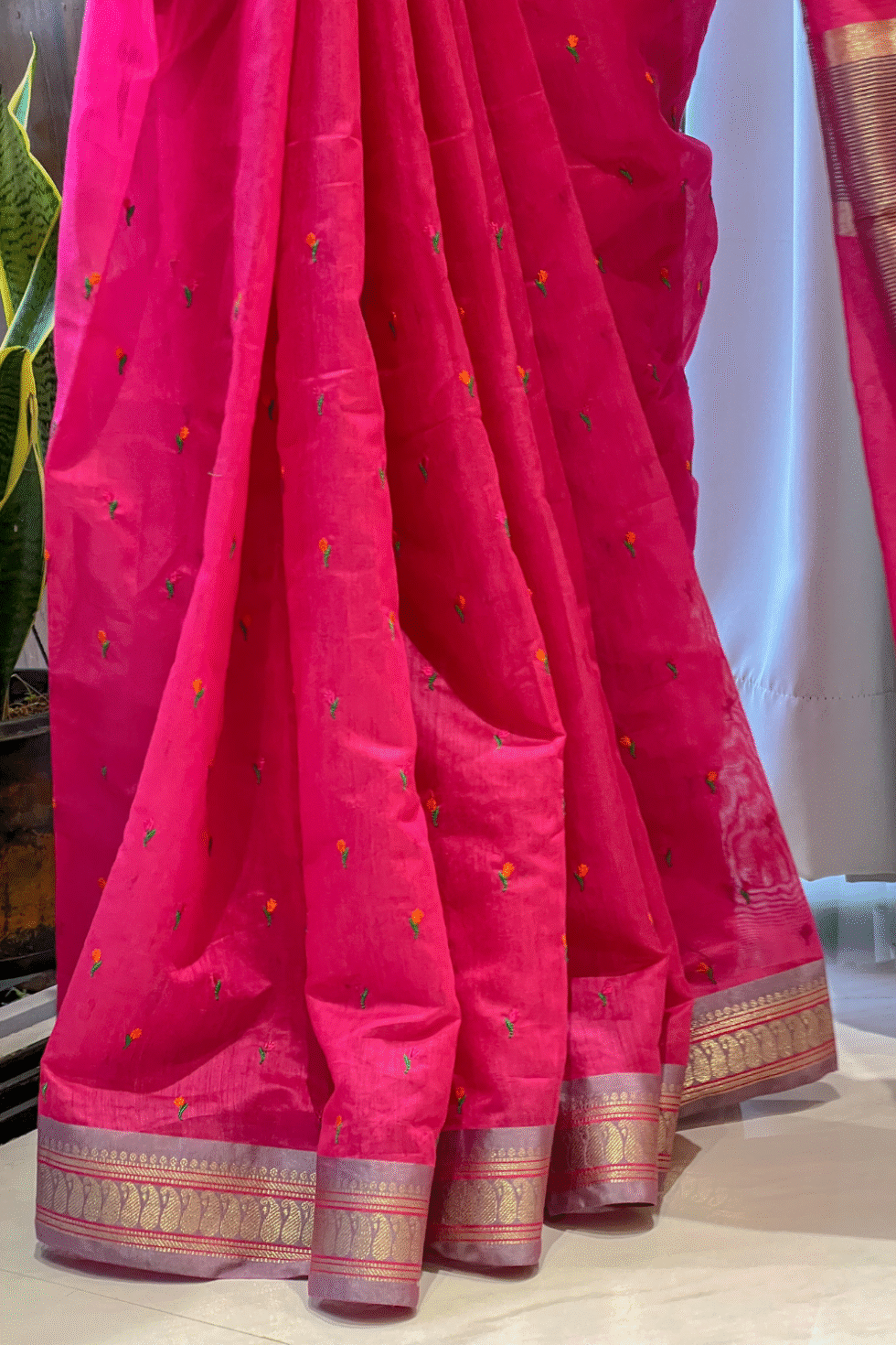 Zari work border: A delicate and intricate zari work border adorns the saree, featuring traditional motifs and patterns that add a touch of elegance.