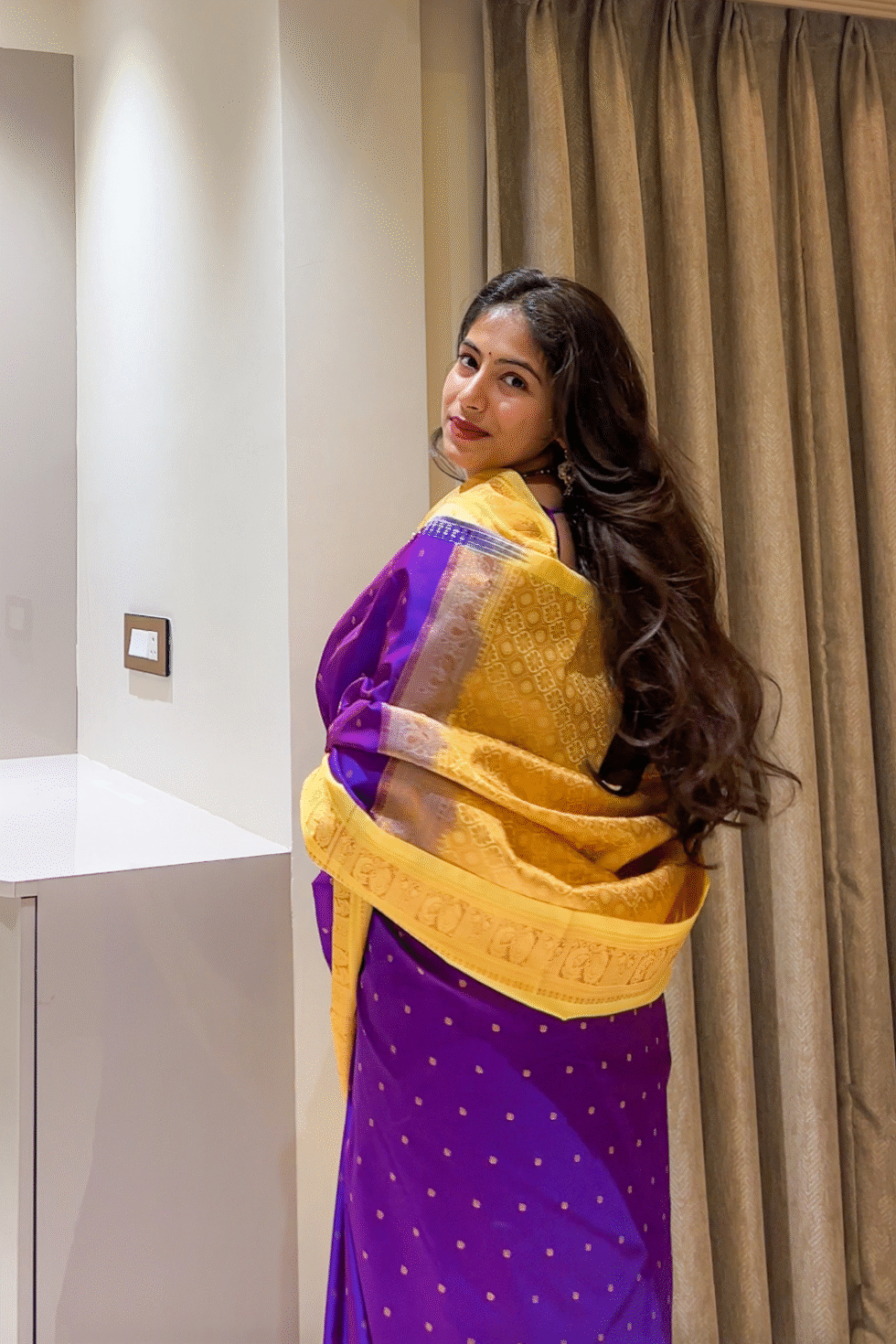 A royal purple Paithani-inspired saree paired with a vibrant yellow pallu and golden zari border. Elegant, traditional, and perfect for weddings and festive occasions.