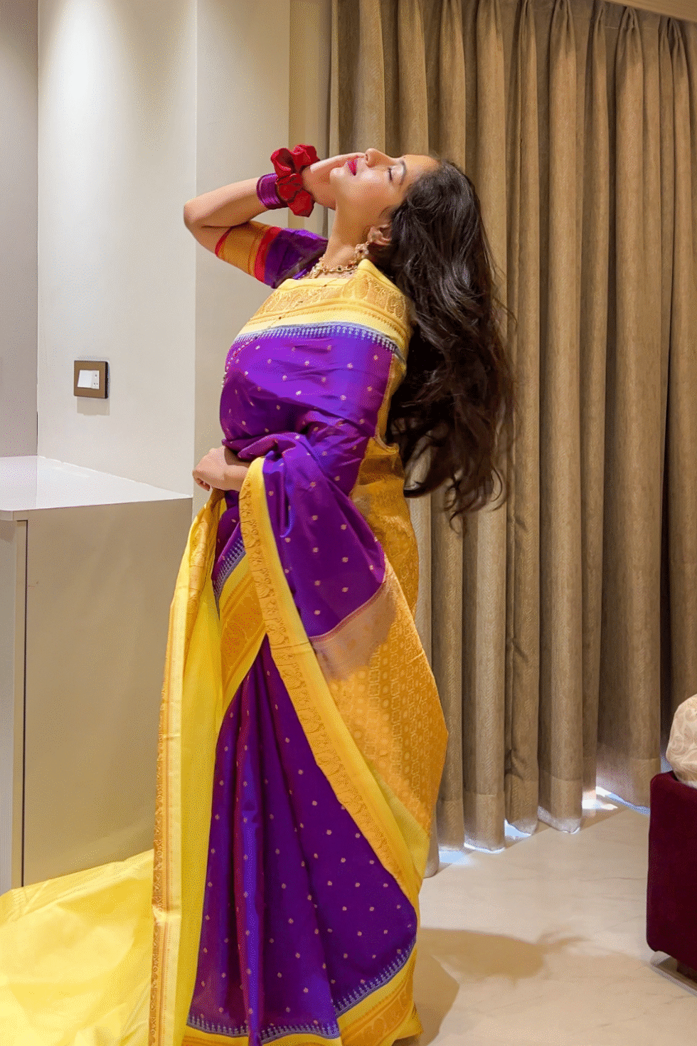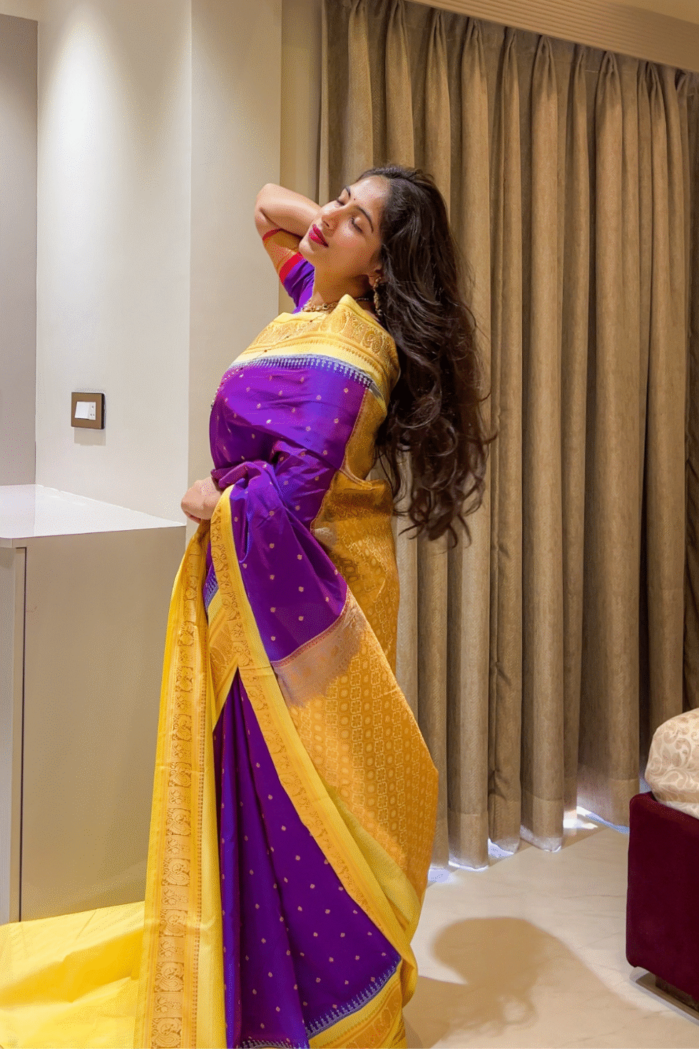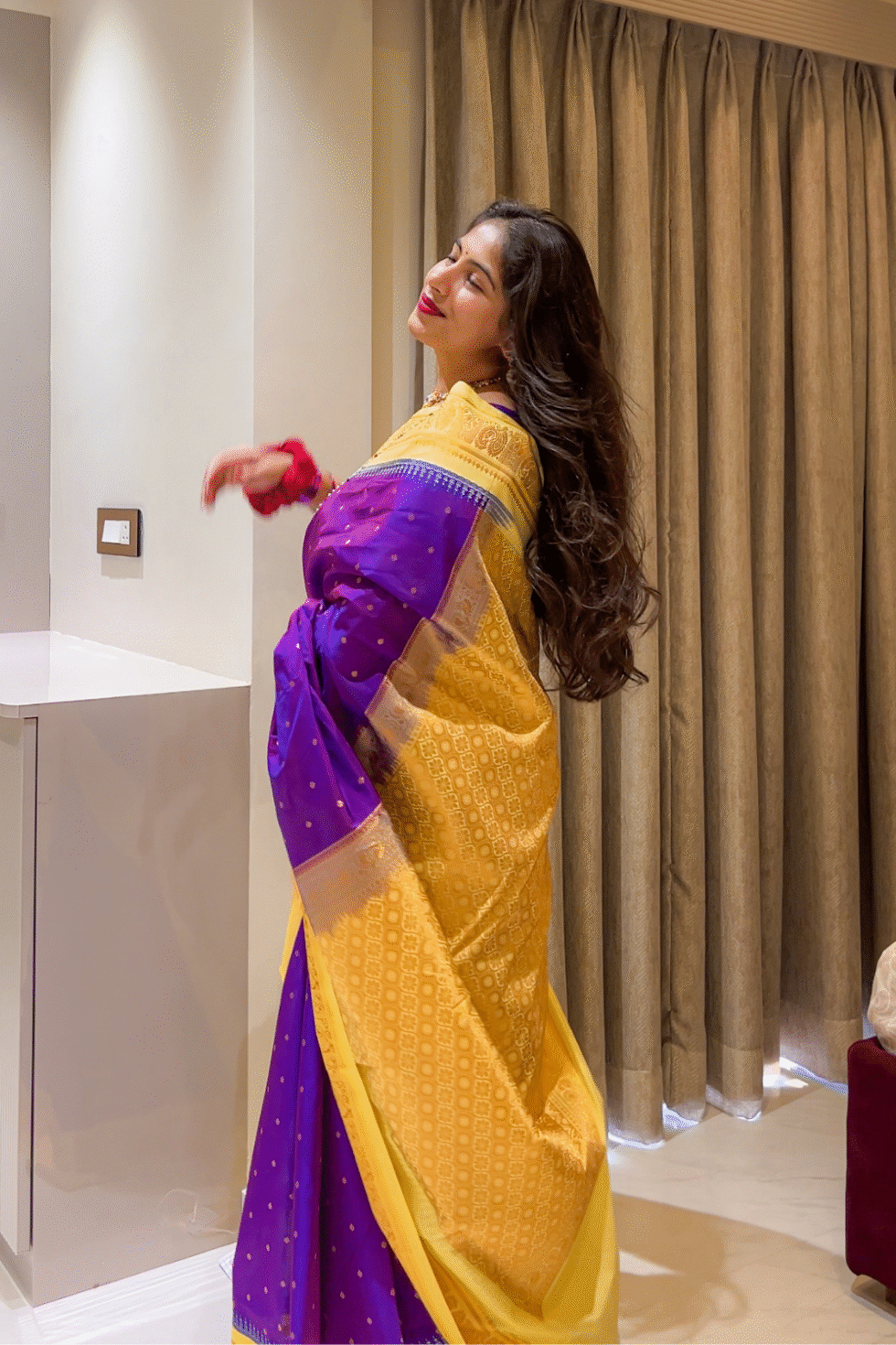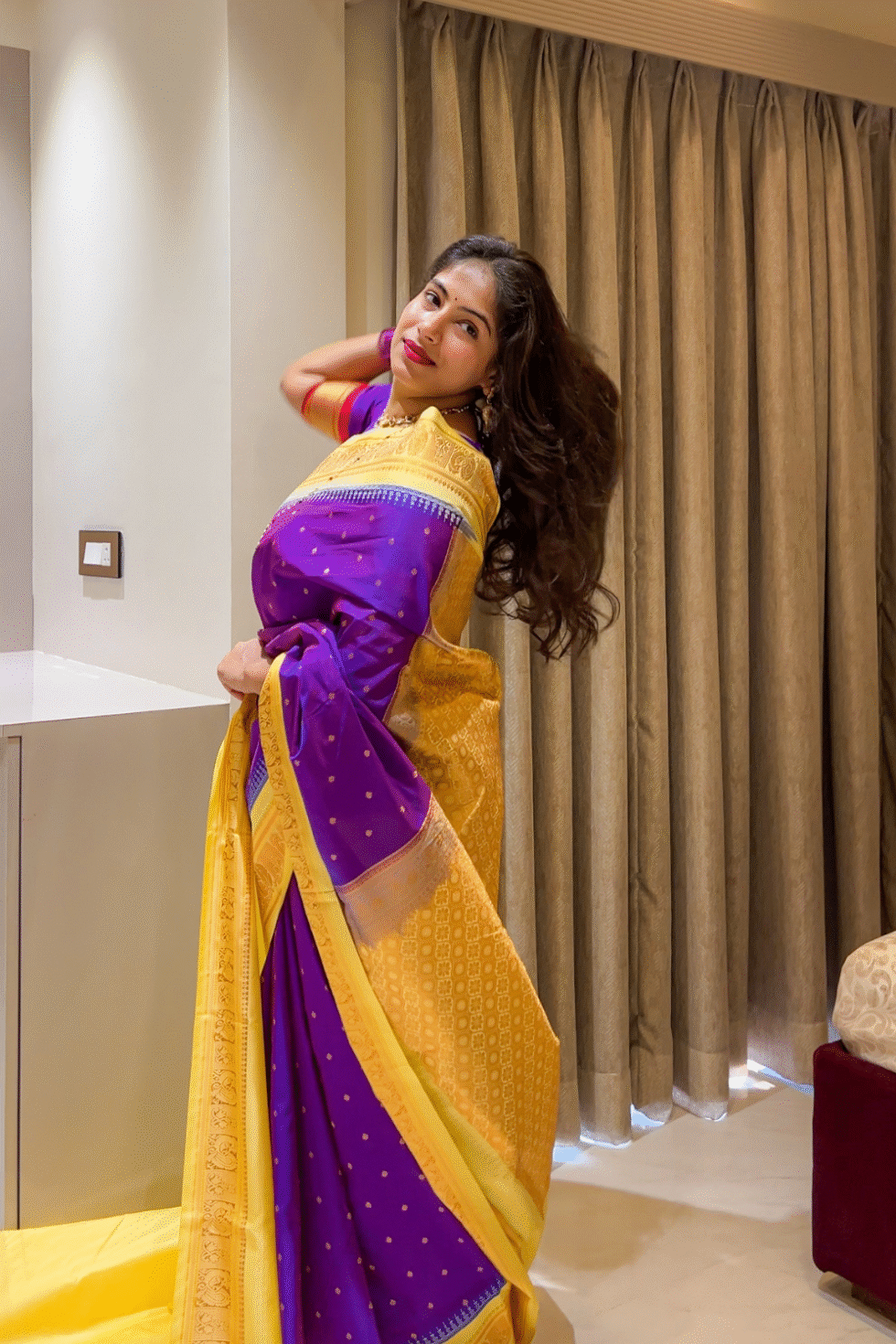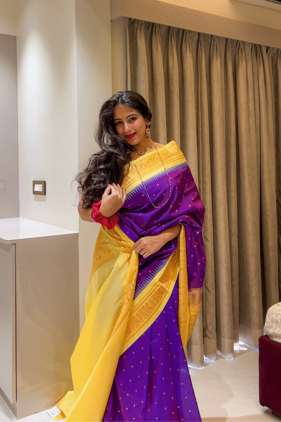 A stunning combination of royal purple paired with a vibrant sunshine yellow pallu and border. This classic Maharashtrian contrast symbolizes prosperity, celebration, and cultural depth.