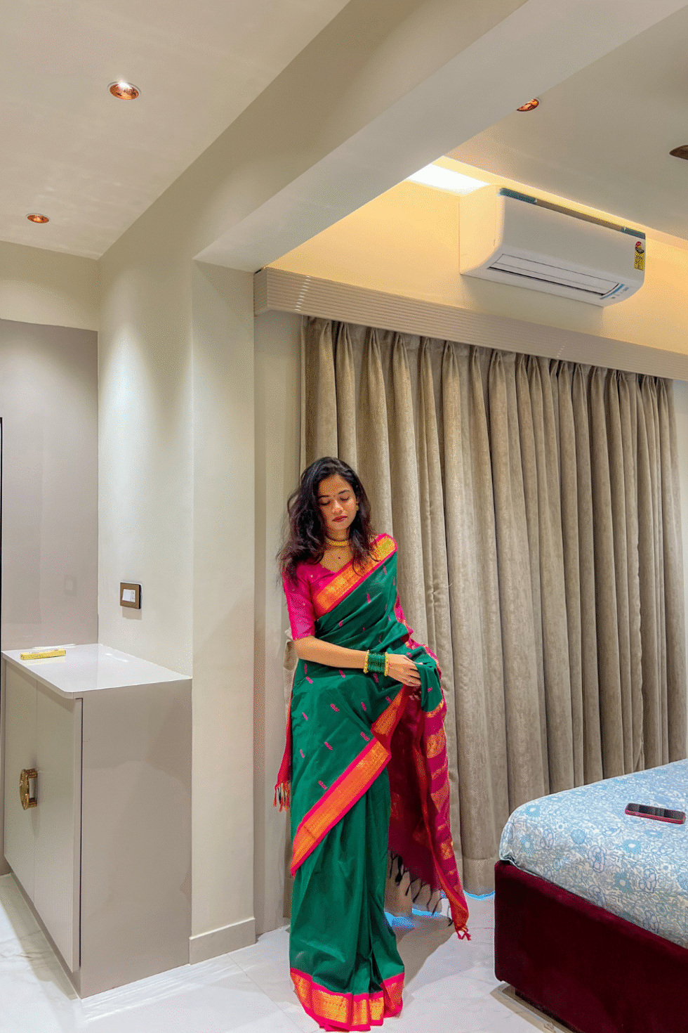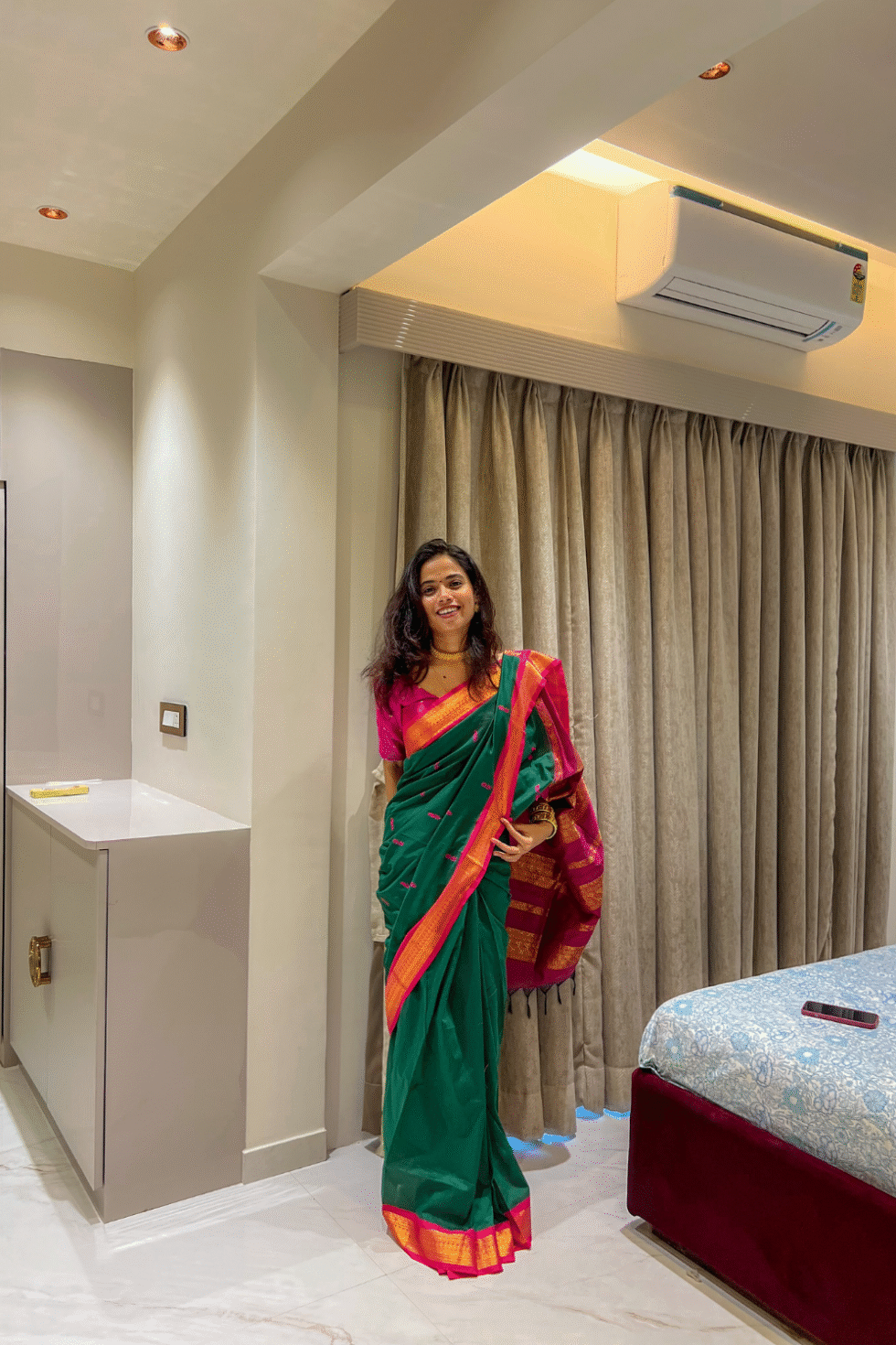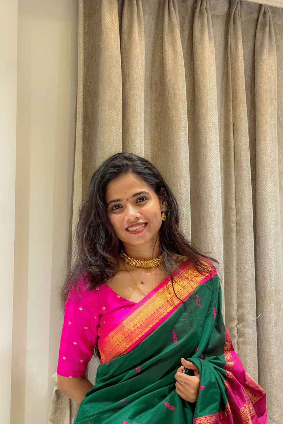 Handwoven in fine cotton, this saree is lightweight, breathable, and comfortable while maintaining a festive charm—perfect for both day and evening functions.