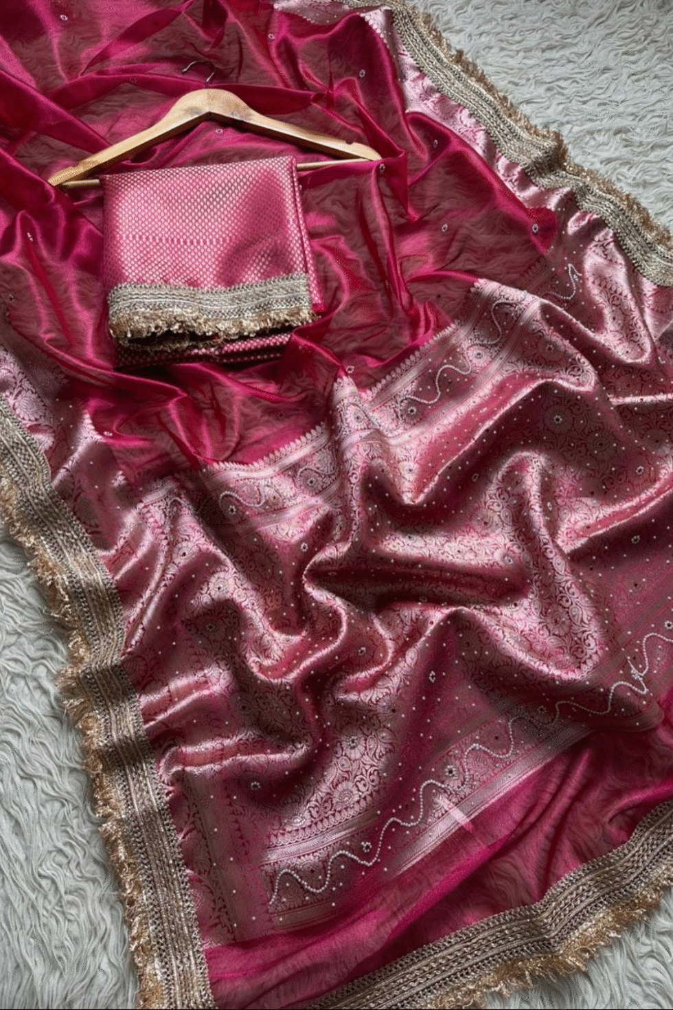 Pure Banarasi Tissue saree in rich rani pink with intricate zari weaving, pearl butti detailing, heavy golden pallu, scalloped zari border with fringes, and a matching woven blouse piece.