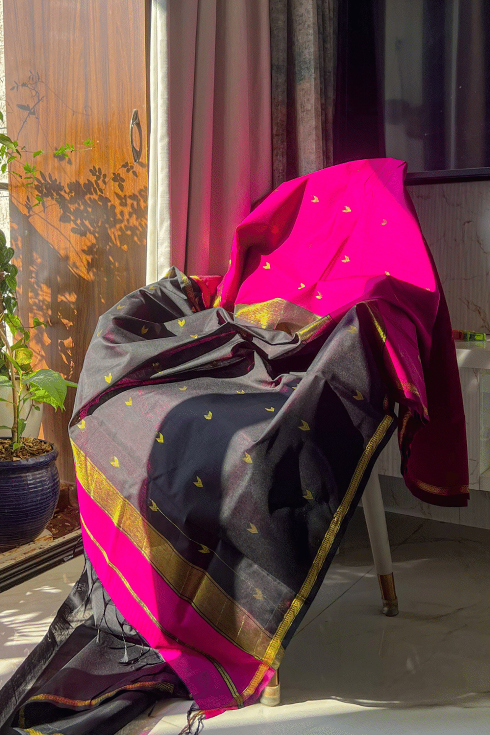 Pallu: Deep BLACK with matching golden arrow motifs, creating a striking contrast with the pink body.