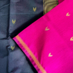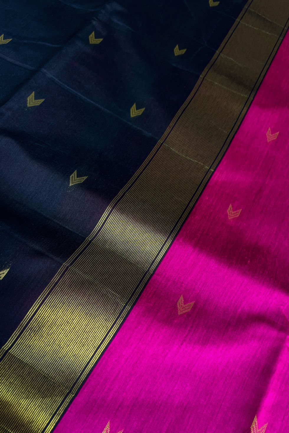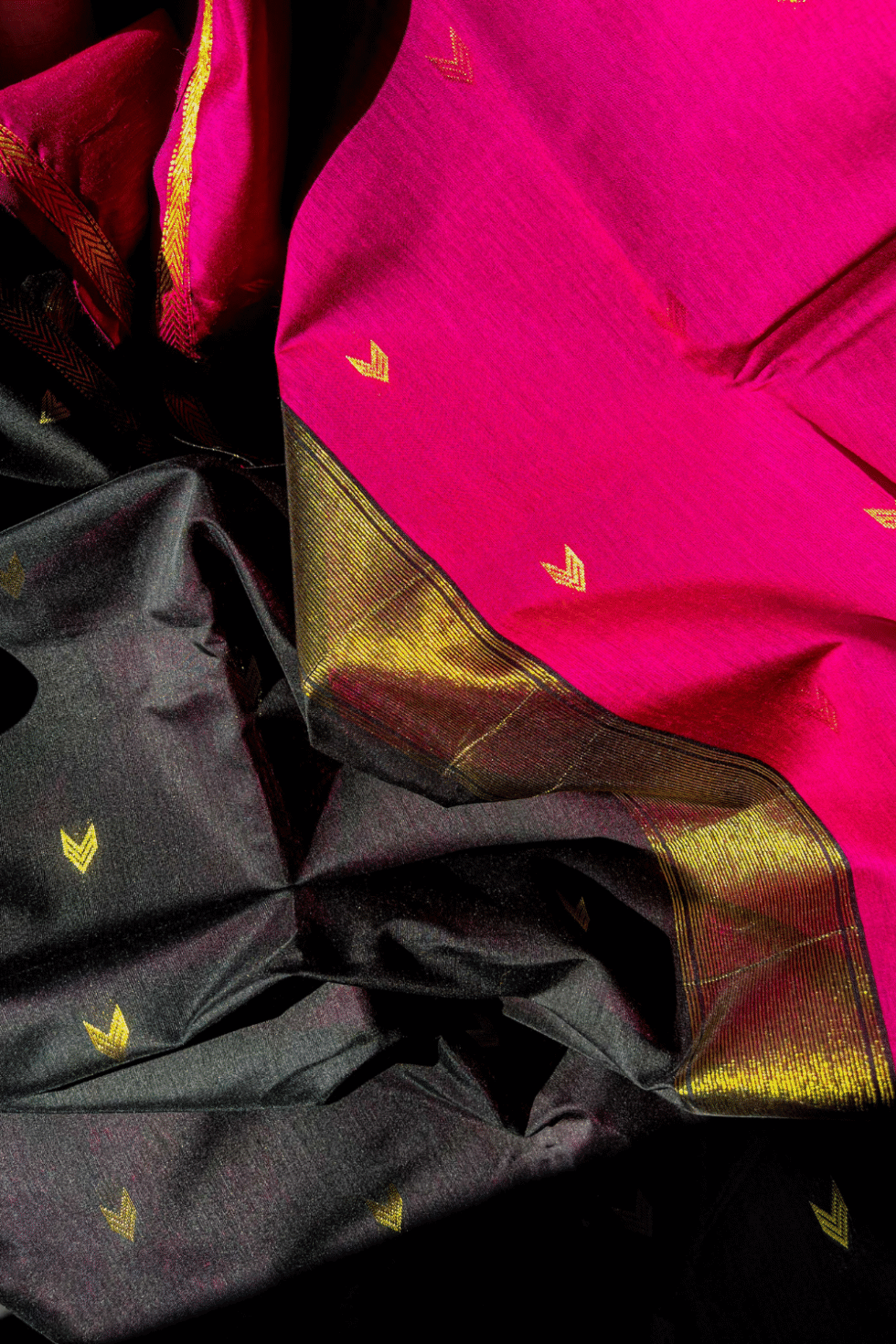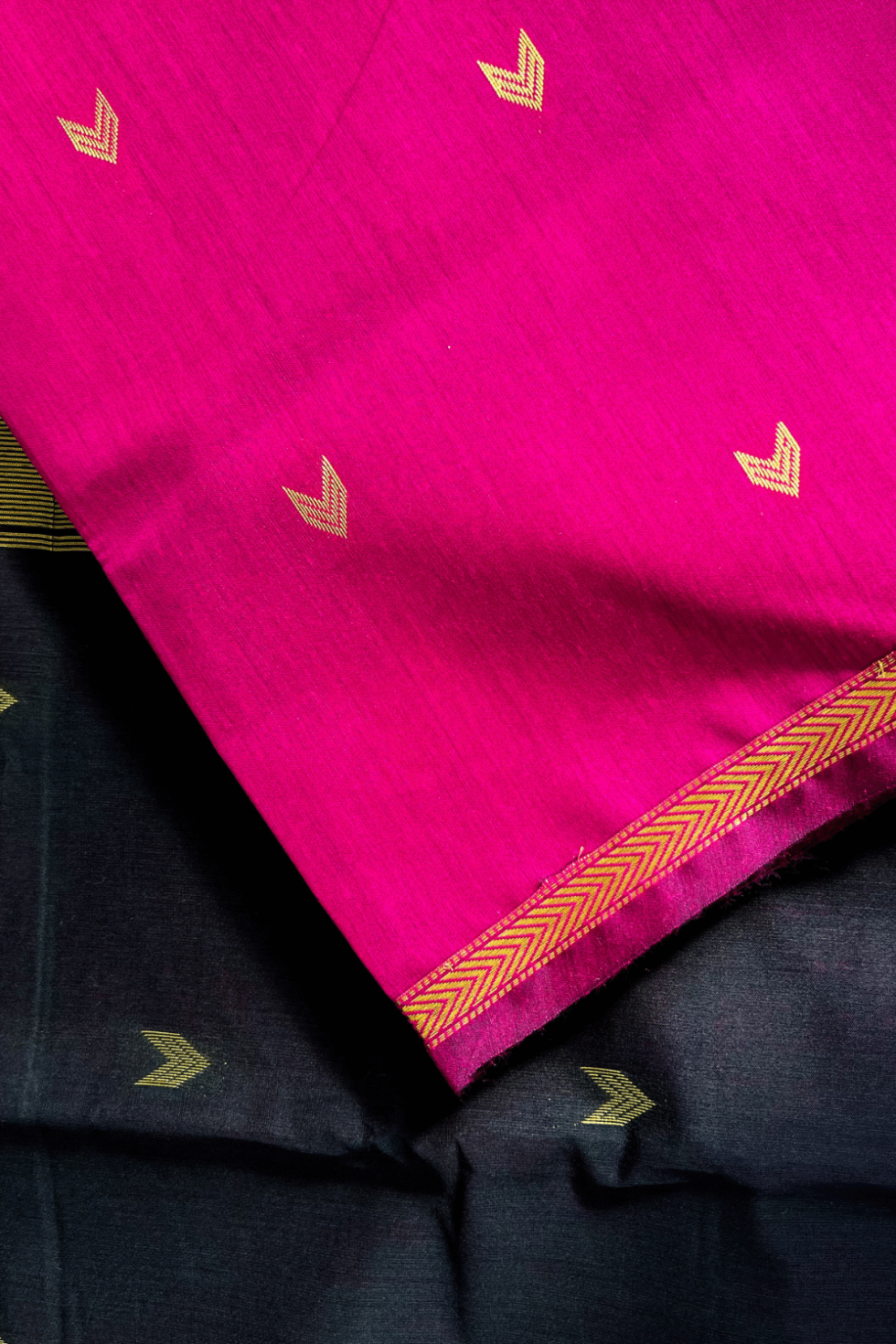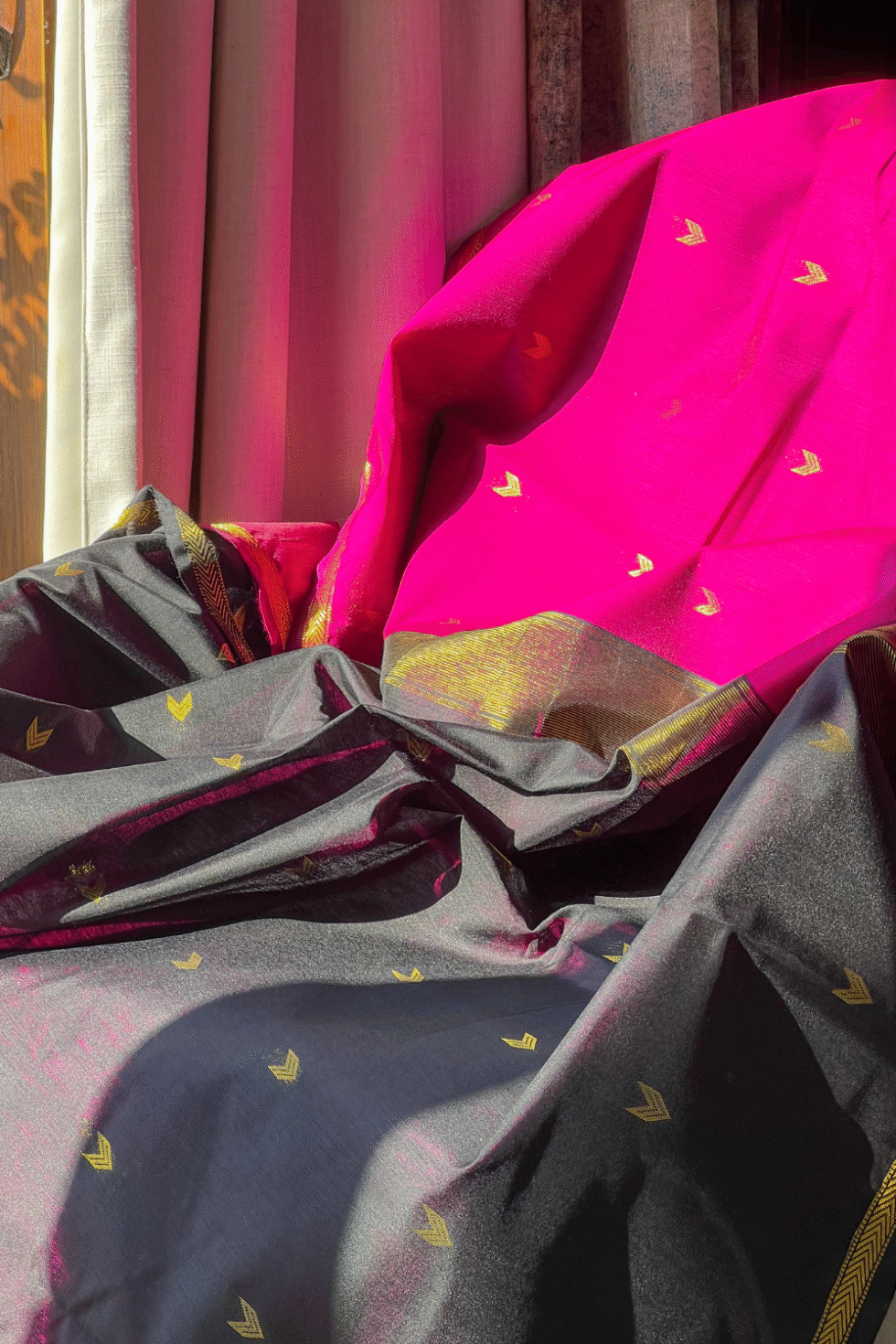 A vibrant fuchsia pink soft cotton-silk blend saree featuring delicate golden arrow motifs and a sleek zig-zag border. The charcoal grey pallu adds a bold festive contrast, making it perfect for Sankranti celebrations and joyful gatherings