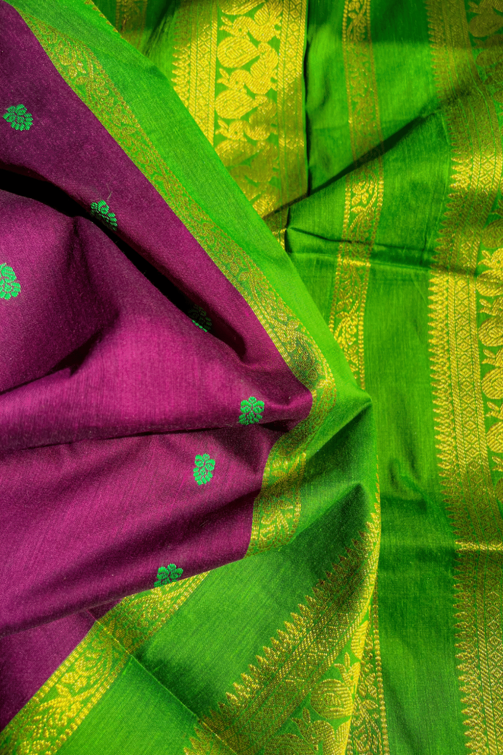 The Paithani green border is intricately woven with golden zari and traditional floral motifs, adding brightness and lushness to the rich purple drape.