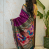 A beautifully woven geometric antique gold border framed by bold magenta edges adds definition and richness. The pallu showcases artistic multicolour woven motifs with abstract traditional patterns, giving the saree a contemporary-meets-classic character.