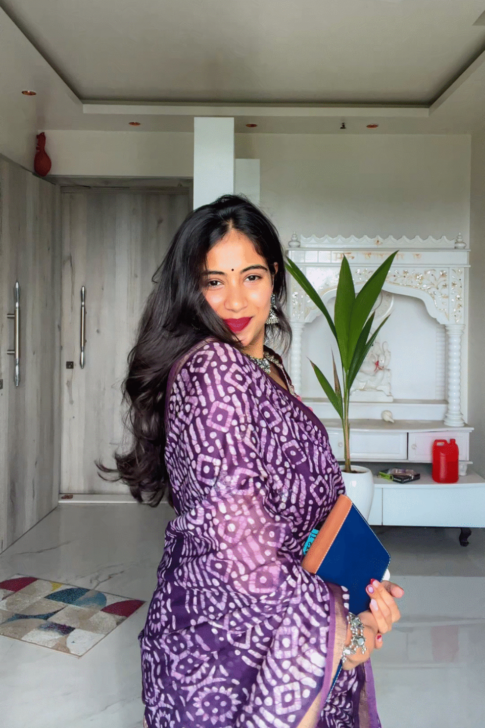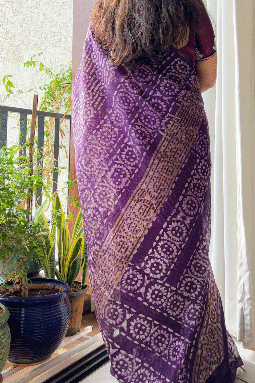 The saree features all-over hand block prints, inspired by traditional Indian motifs that add an artisanal charm to its contemporary simplicity. The subtle print detailing paired with the graceful purple tone makes this piece both understated and timeless.