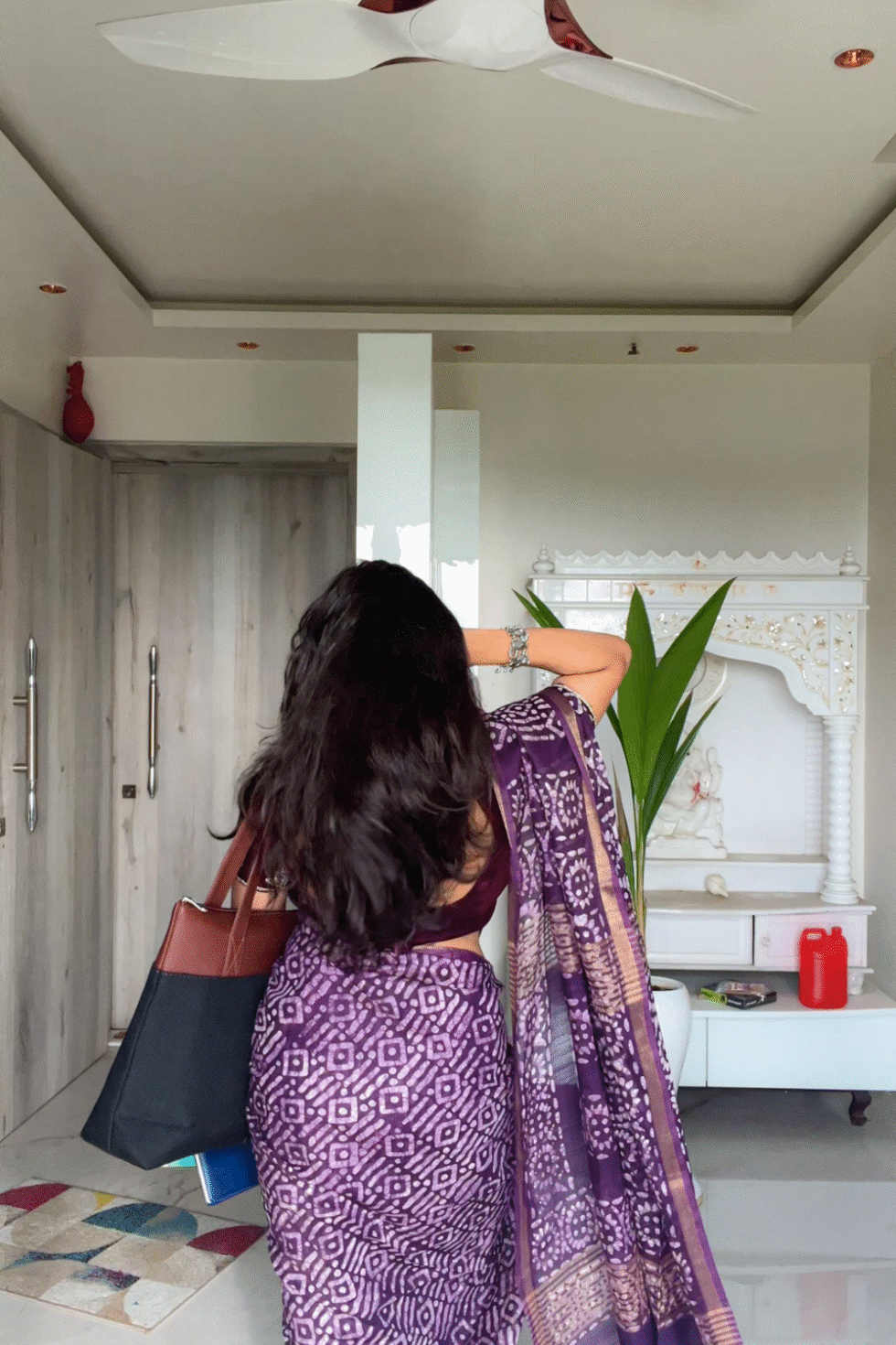 The pallu continues the block print design, creating visual continuity while adding depth and flow to the drape. It’s the kind of subtle detail that makes you look twice.