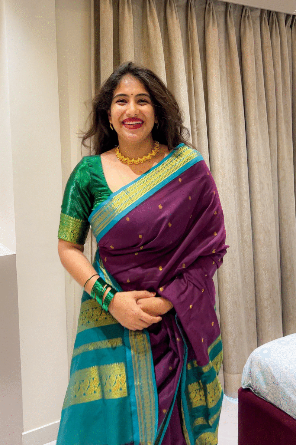 The body comes in a deep plum-purple shade symbolizing richness and poise, beautifully contrasted with a teal green border and pallu woven in golden zari for a vibrant festive appeal.