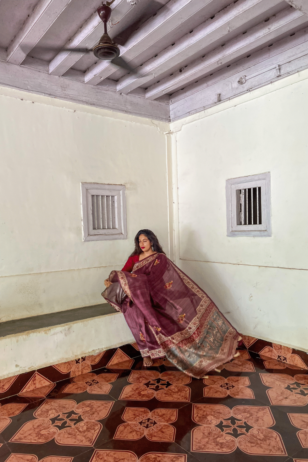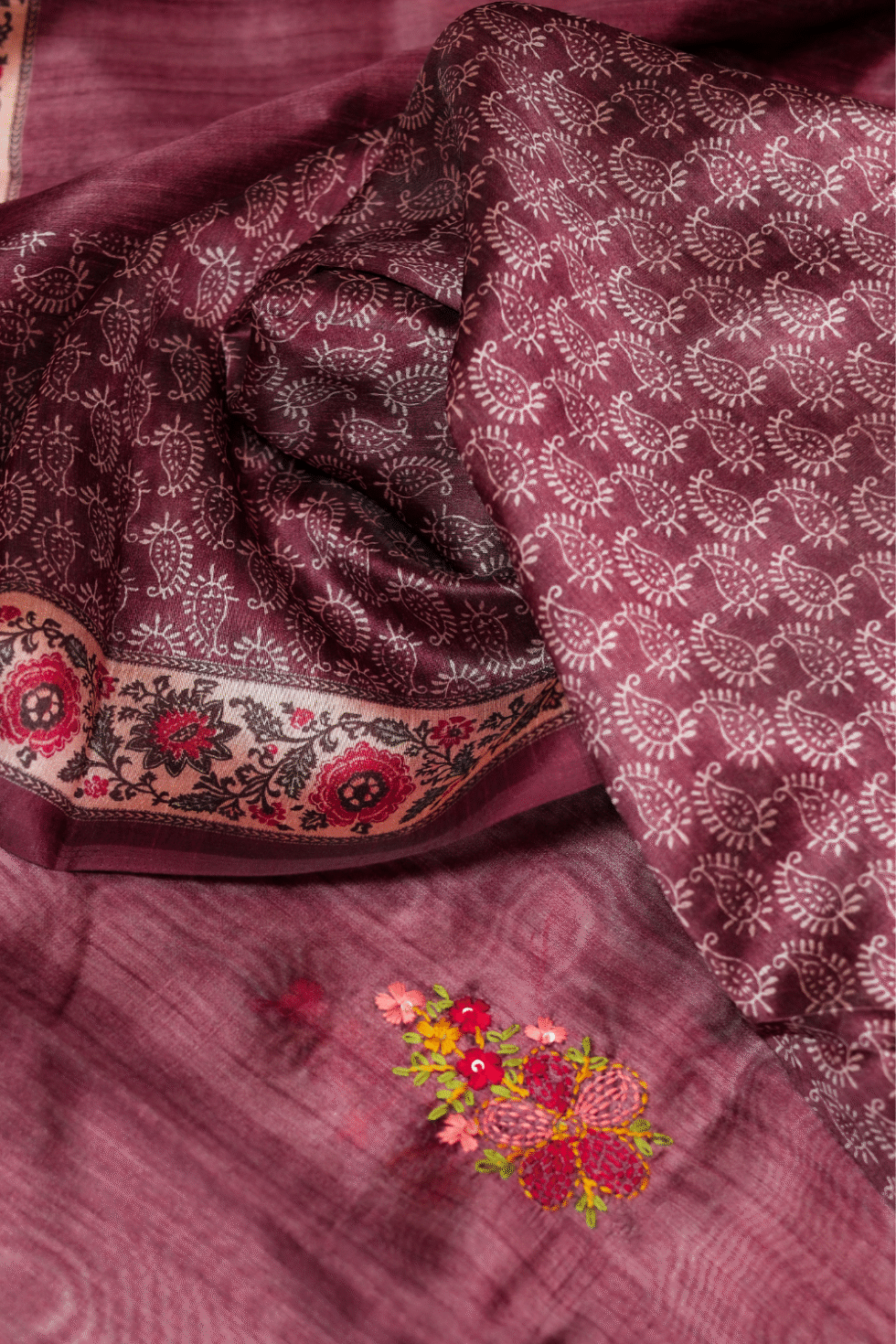 Blouse: The saree comes with a matching Ajrak blouse in the same wine maroon color, perfectly complementing the saree. Ajrak, a traditional block-printing technique, adds a unique and rustic charm to the blouse.