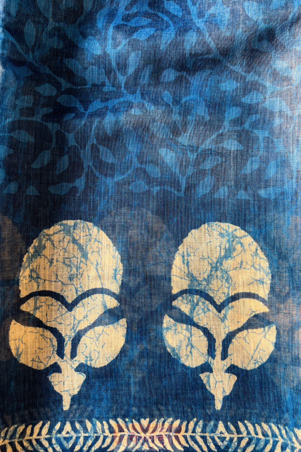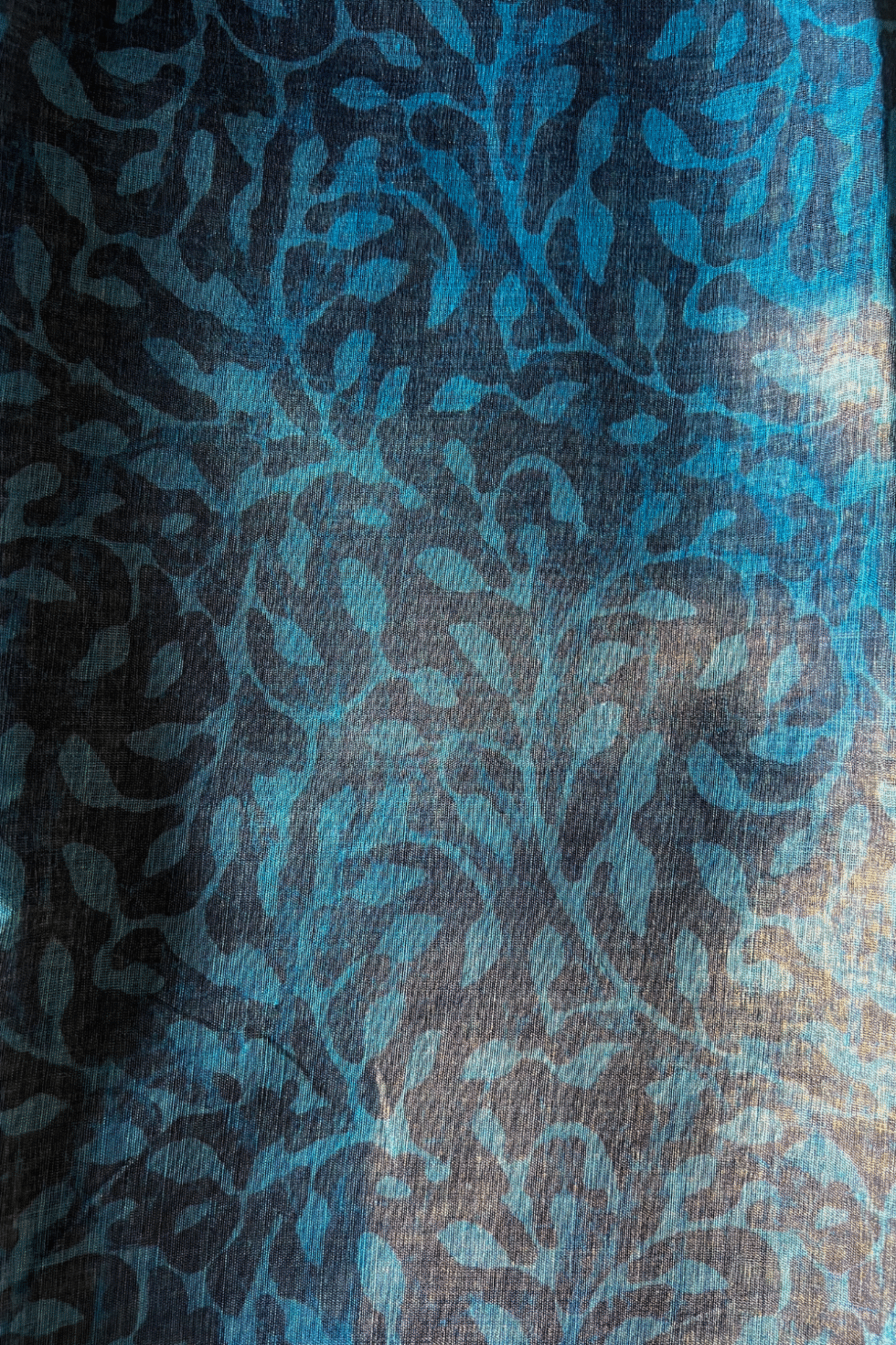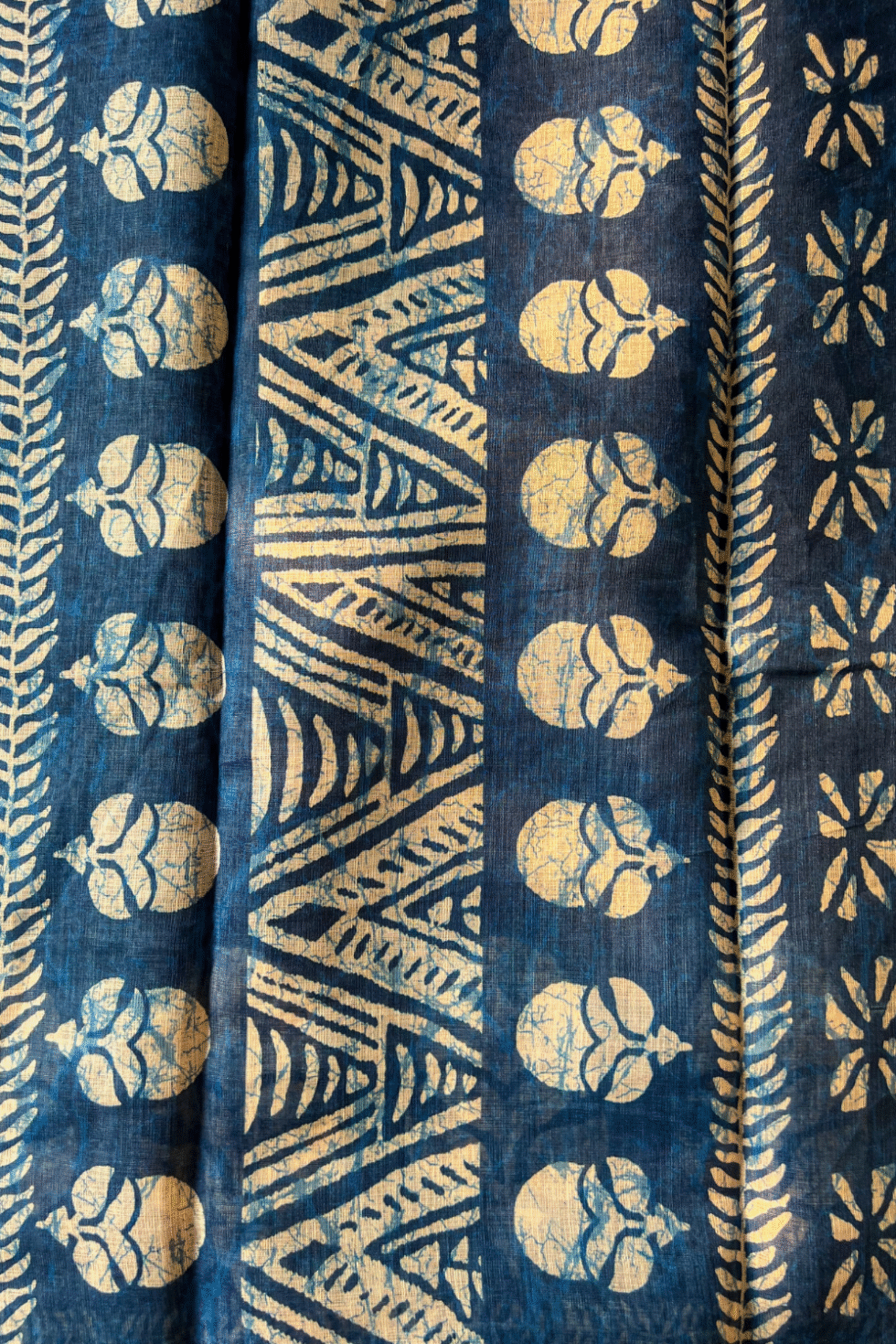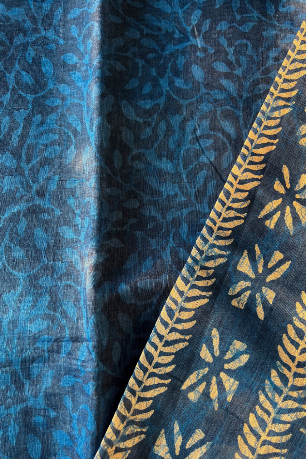 A deep indigo base enhanced with delicate light blue block prints that create a subtle 3D effect, adding depth and dimension to the fabric. The contrast of blue tones brings a refined and sophisticated charm.