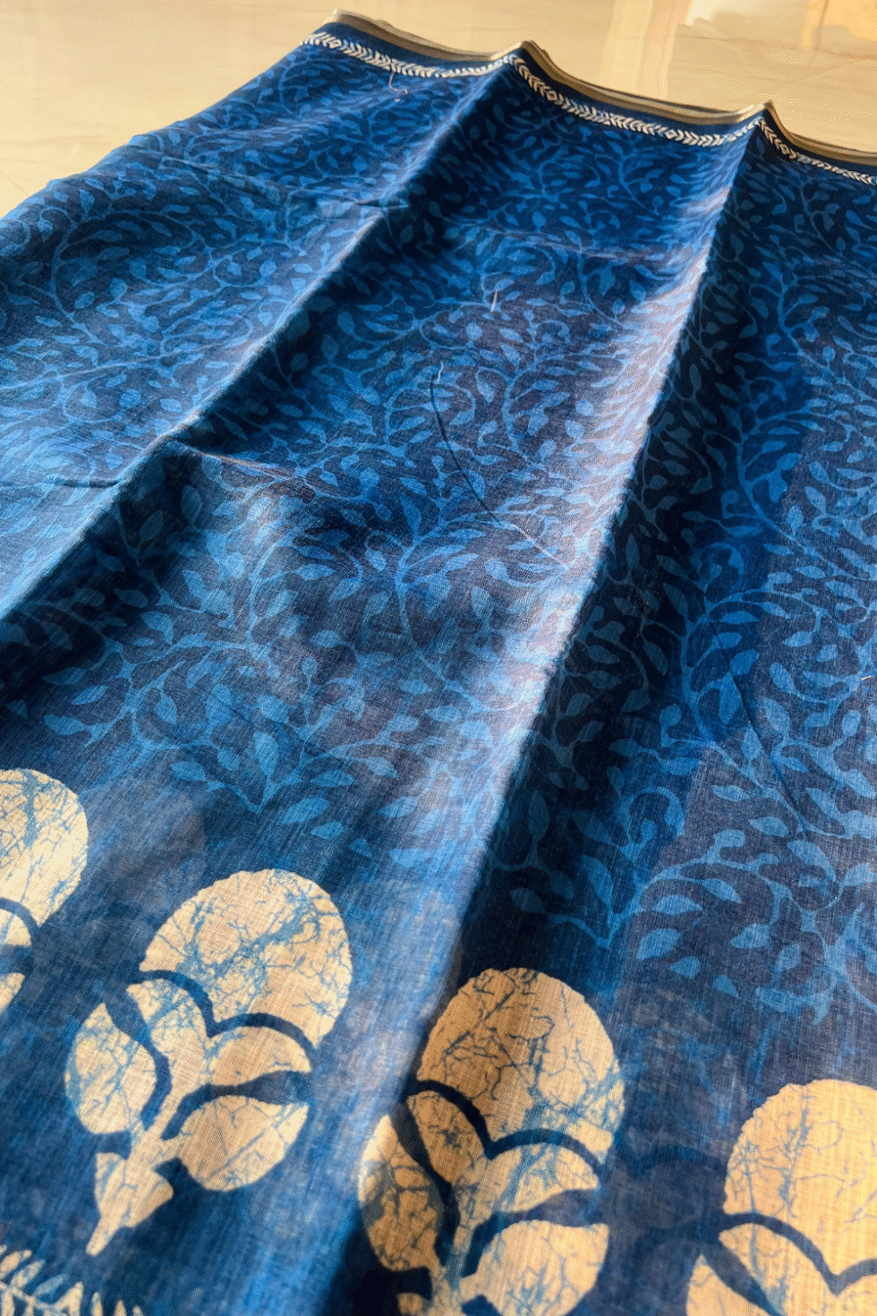 Indigo cotton saree with delicate light blue Jhal block prints creating a 3D effect all over. Lightweight, breathable, and effortlessly elegant — perfect for festive or cultural occasions