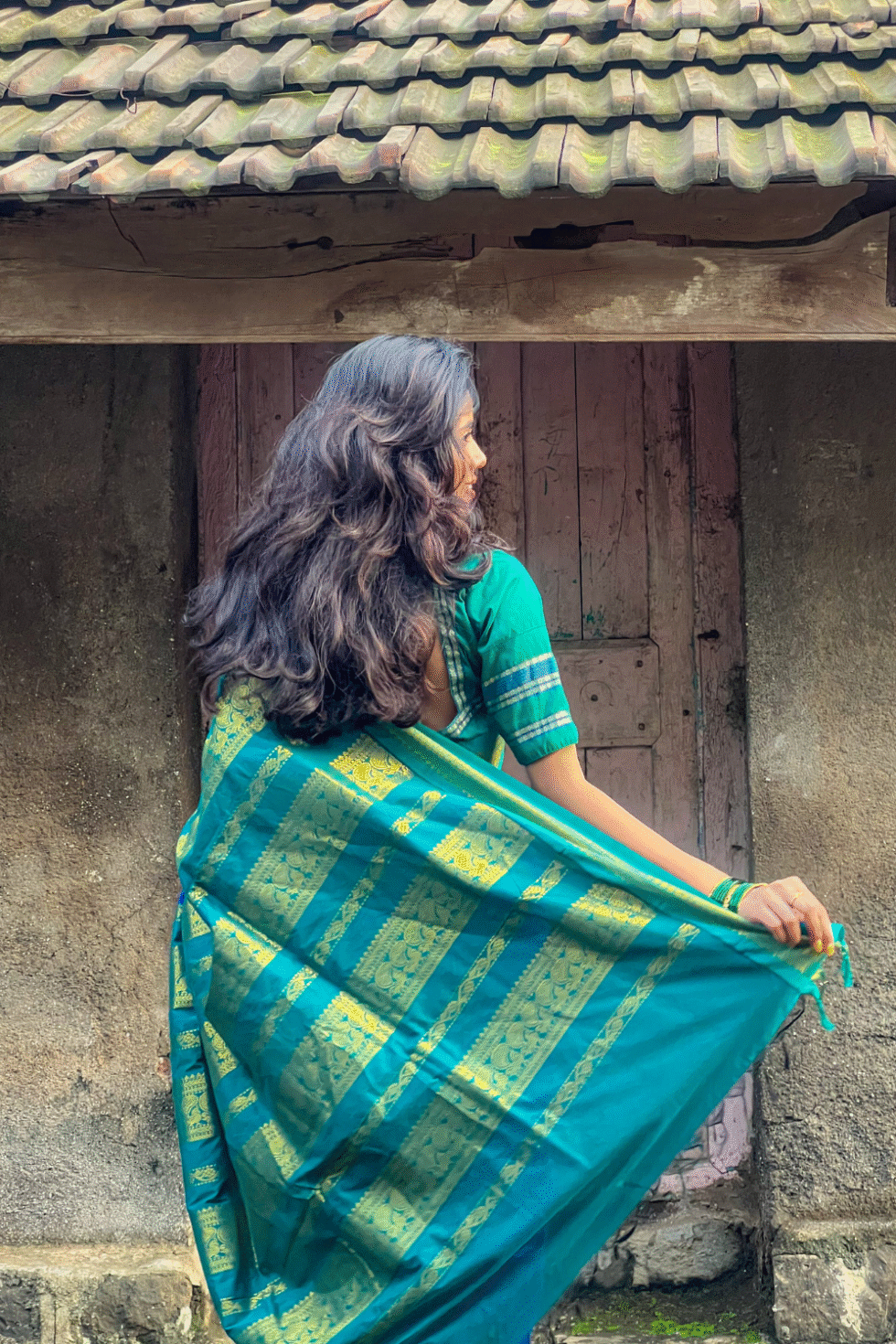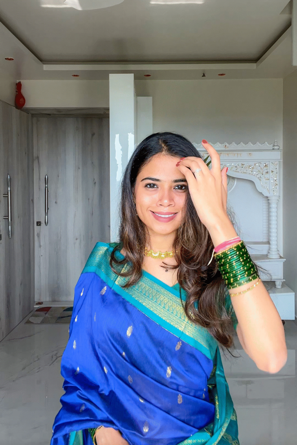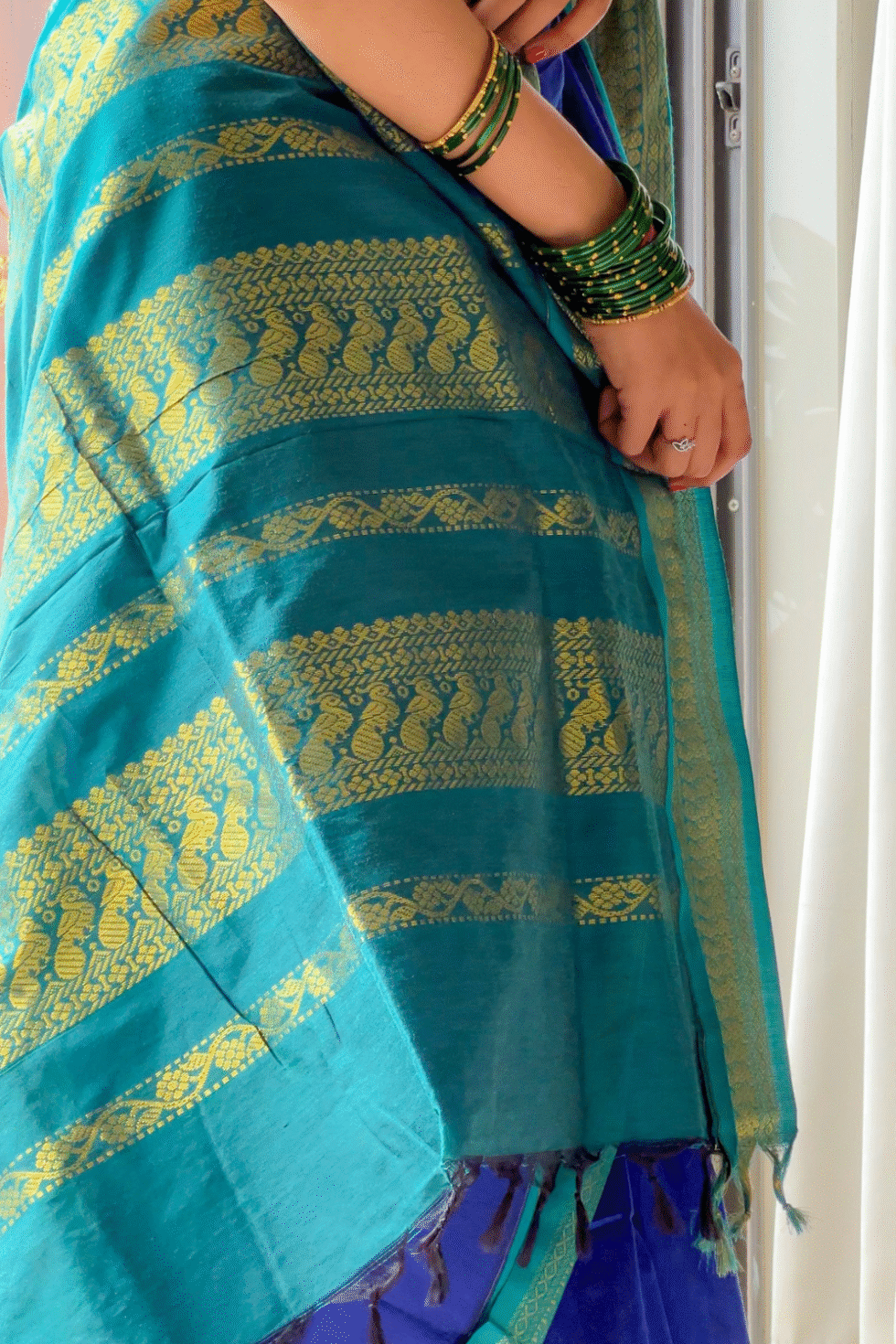 Soft, breathable cotton Paithani fabric—a blend of comfort and tradition. Perfect for all-day wear while still looking elegant and polished.