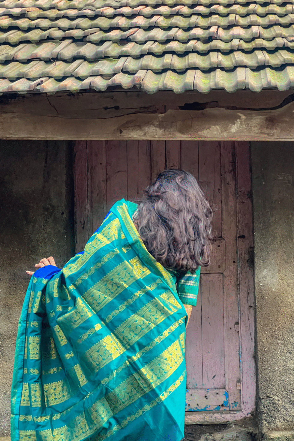 A beautifully woven contrast Paithani border in rama green, enriched with golden zari and traditional floral patterns. The vibrant green border stands out against the blue body, making the saree visually striking.