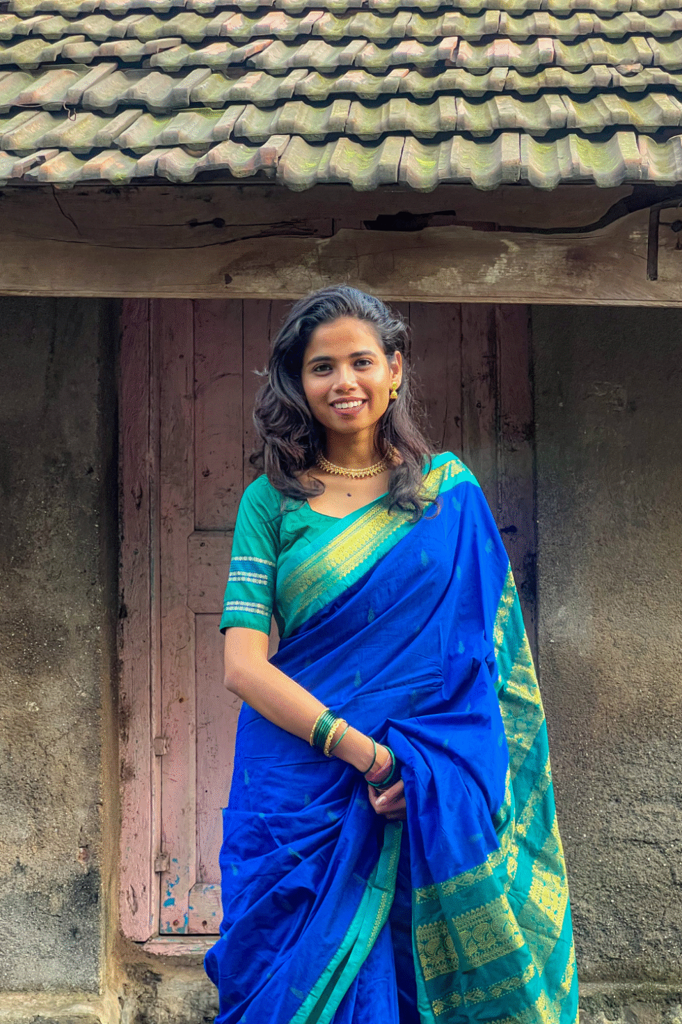 A graceful cotton Paithani saree in rich blue, adorned with delicate butis and finished with a striking rama green contrast Paithani border. Comes with a matching blouse piece. Lightweight, elegant, and rooted in tradition – perfect for festive mornings or office celebrations.
