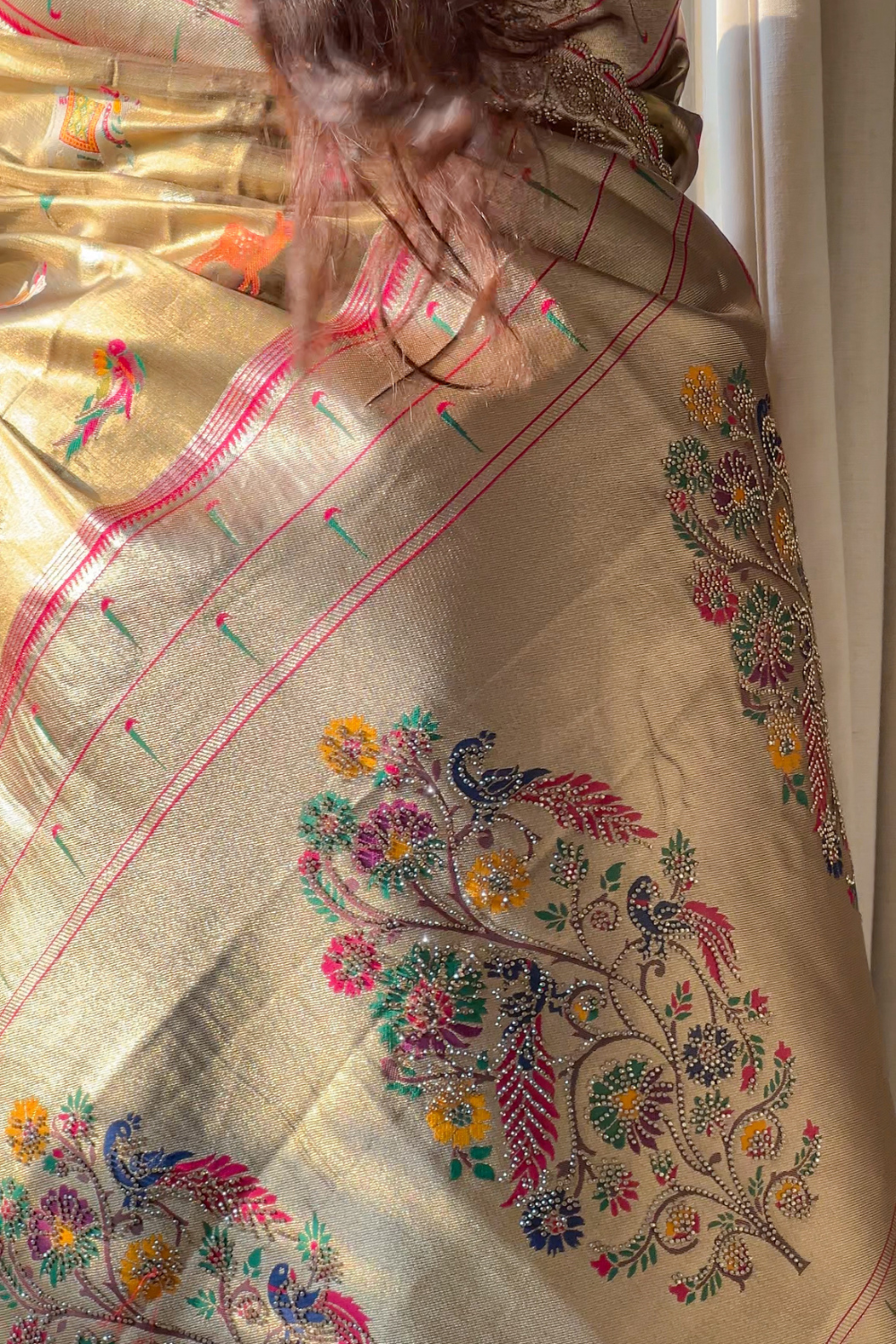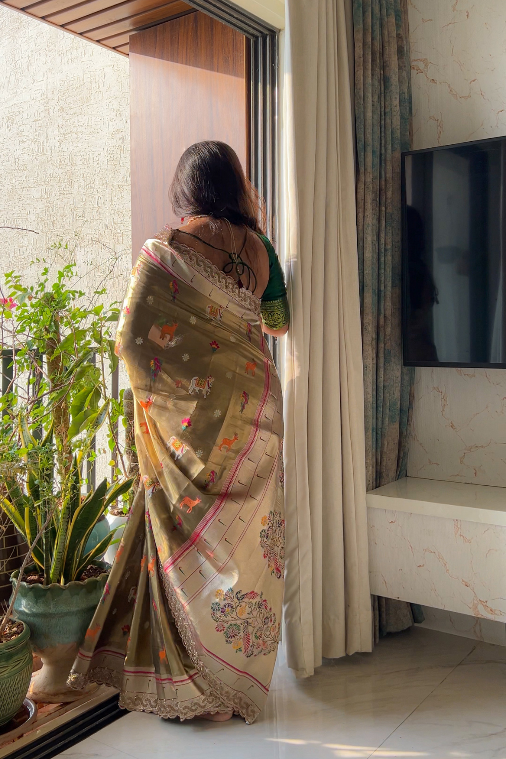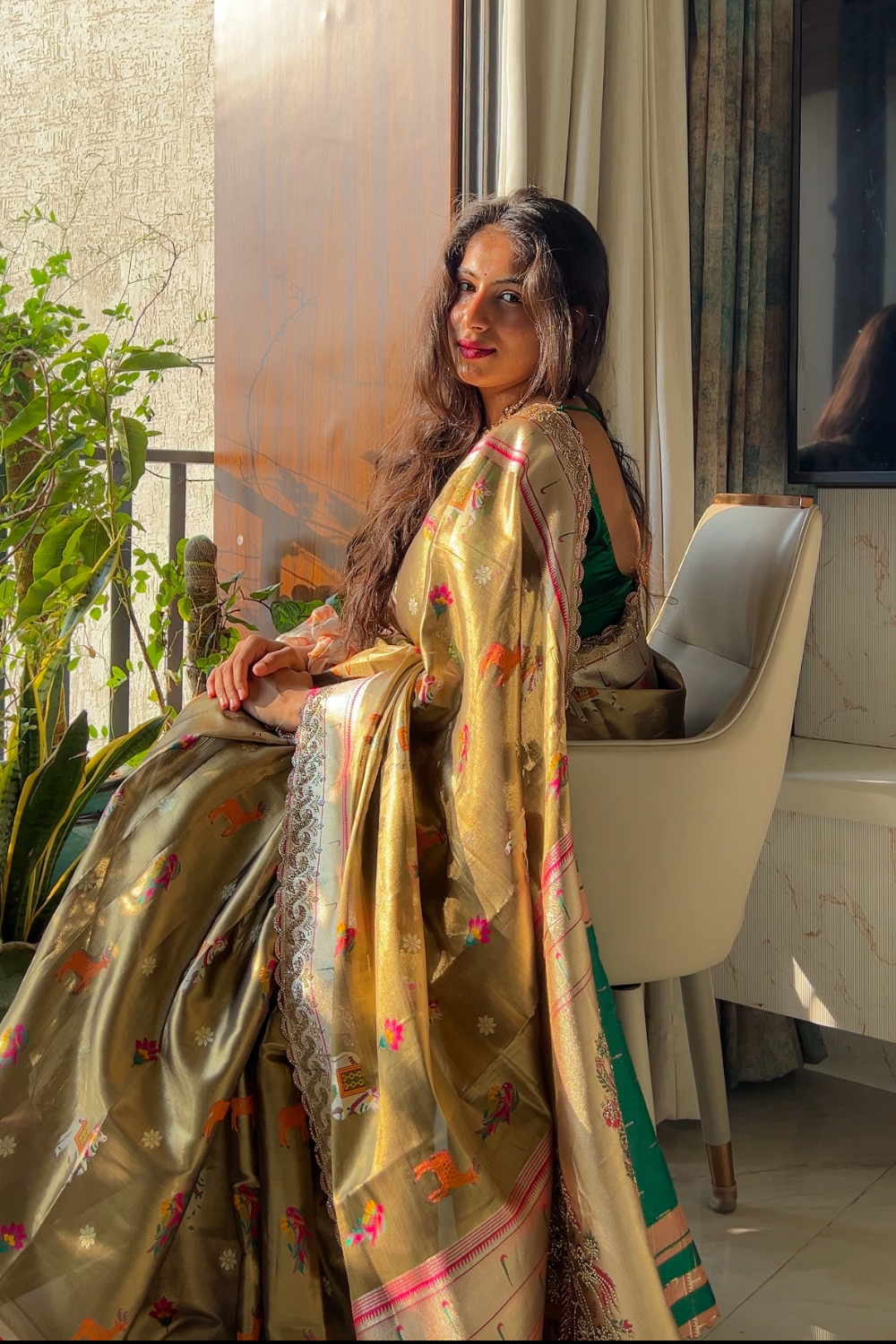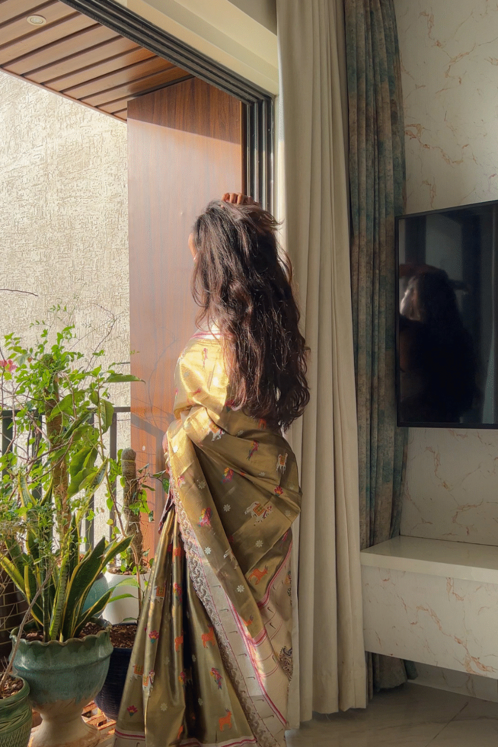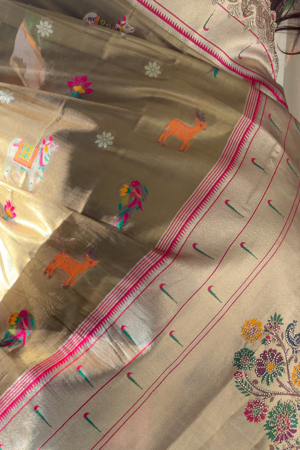A golden tissue silk saree adorned with royal animal motifs—horses, elephants, and floral buttas—all brought alive with colourful weaving. Finished with a pink-edged antique lace border and a contrasting pink blouse.