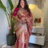 A golden tissue silk saree adorned with royal animal motifs—horses, elephants, and floral buttas—all brought alive with colourful weaving. Finished with a pink-edged antique lace border and a contrasting pink blouse.
