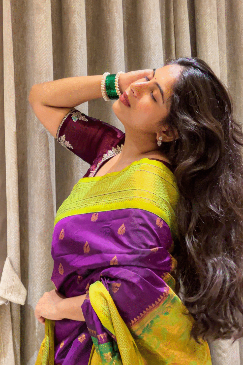 Finely woven premium silk Paithani, known for its soft sheen, durability, and heirloom value.