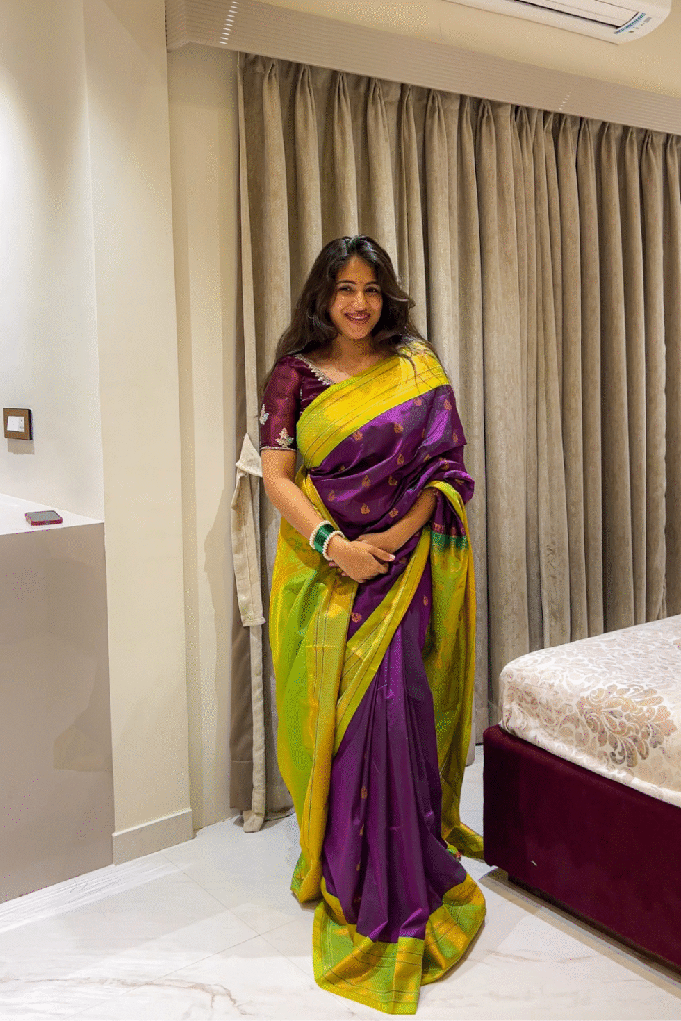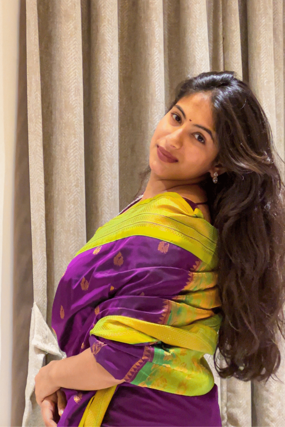 A rich brinjal purple body paired with a subtle yet regal mehndi green border and golden zari highlights. This earthy yet royal combination makes it a unique and traditional masterpiece.