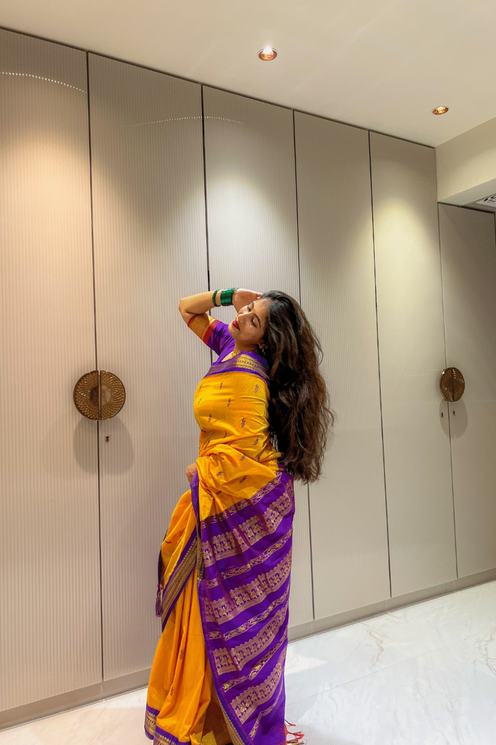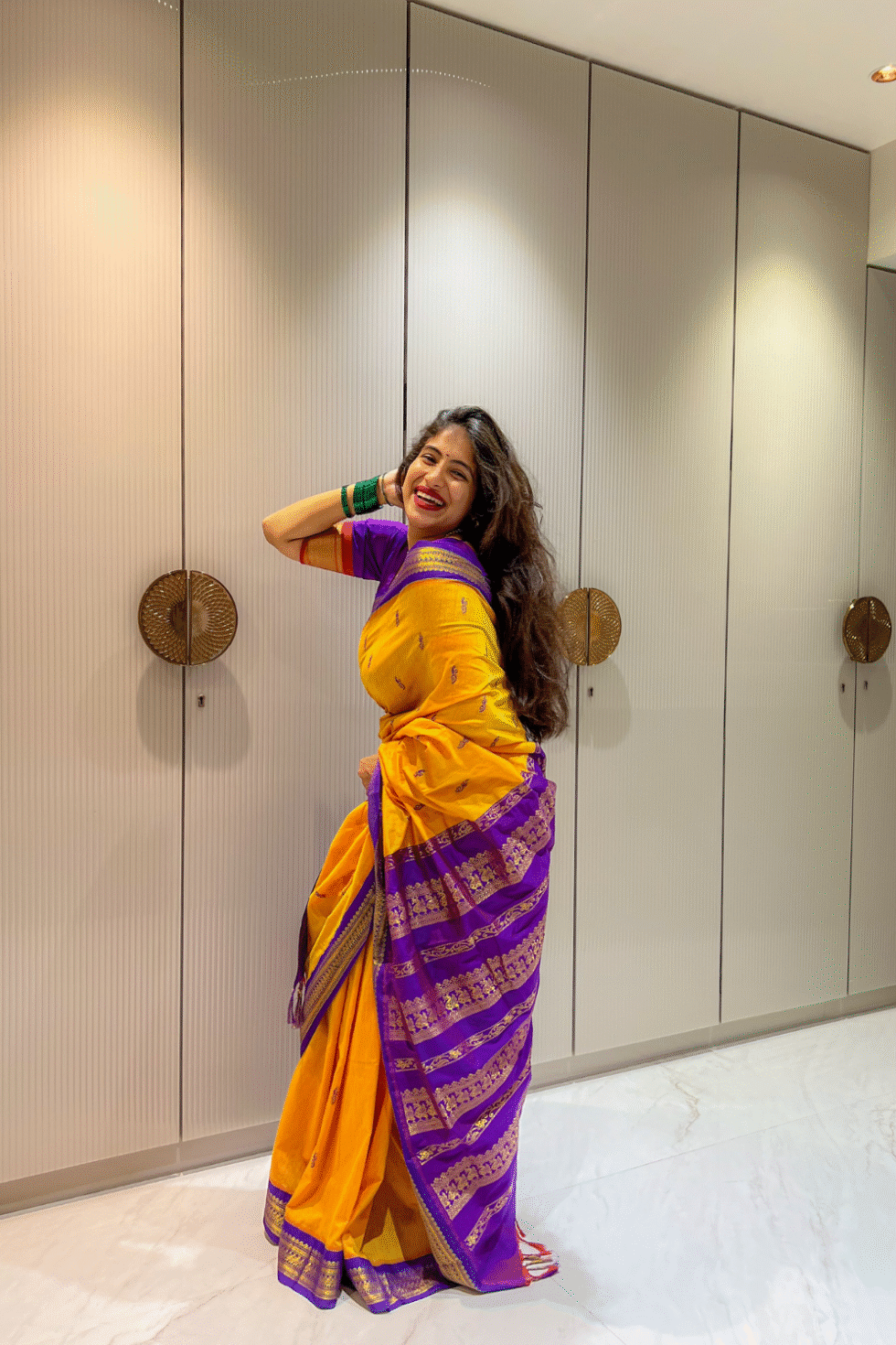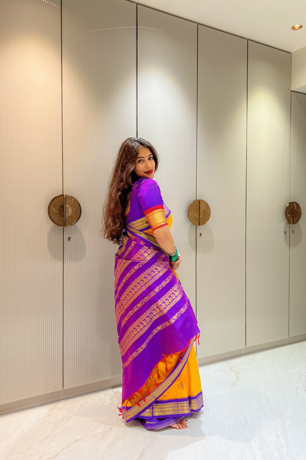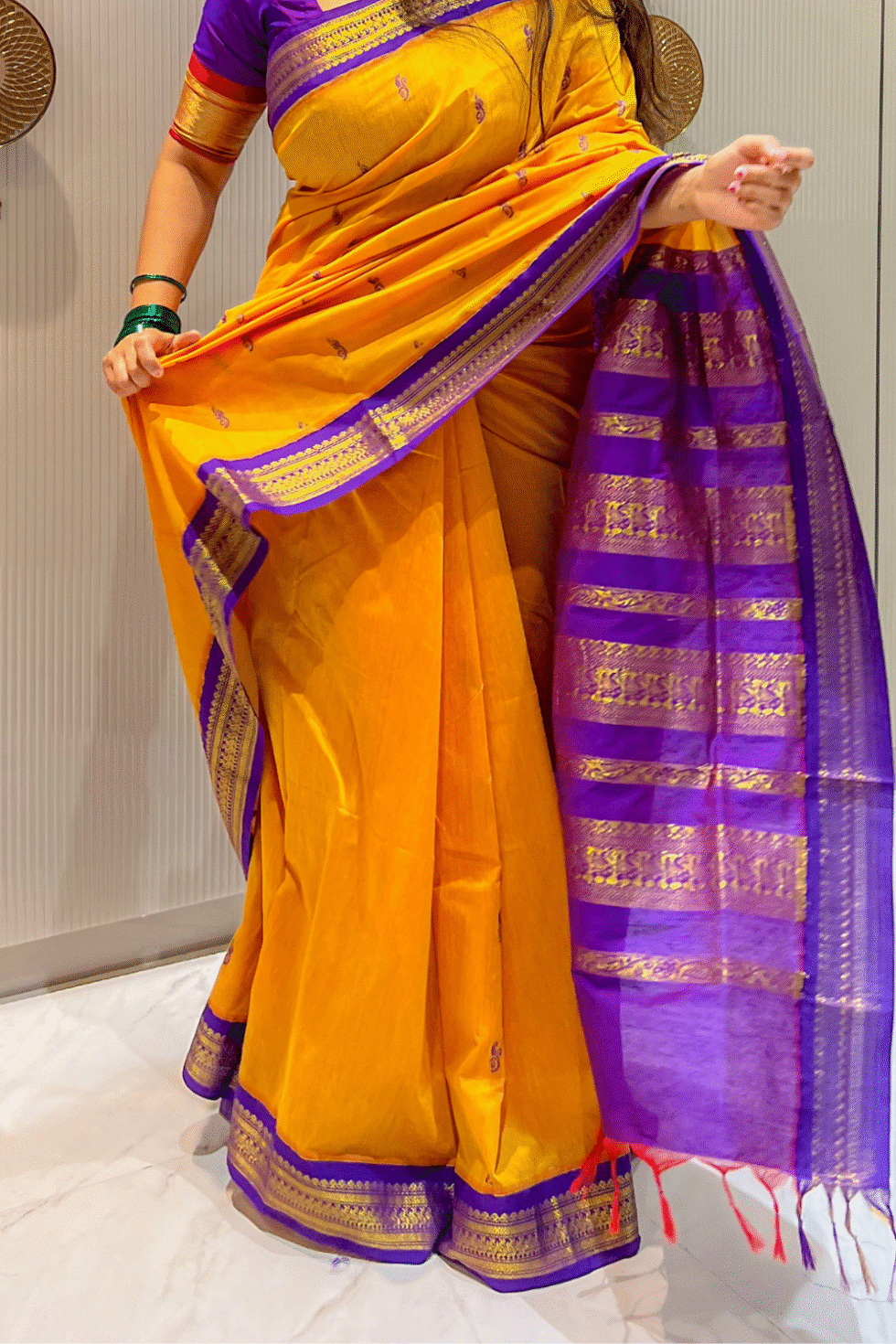 Pair with temple gold jewelry, jasmine gajra, and bangles in purple and yellow for a striking festive look. A bright bindi and bold kajal will add to the traditional charm.