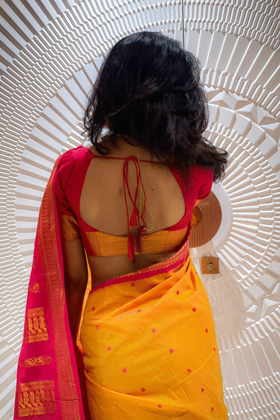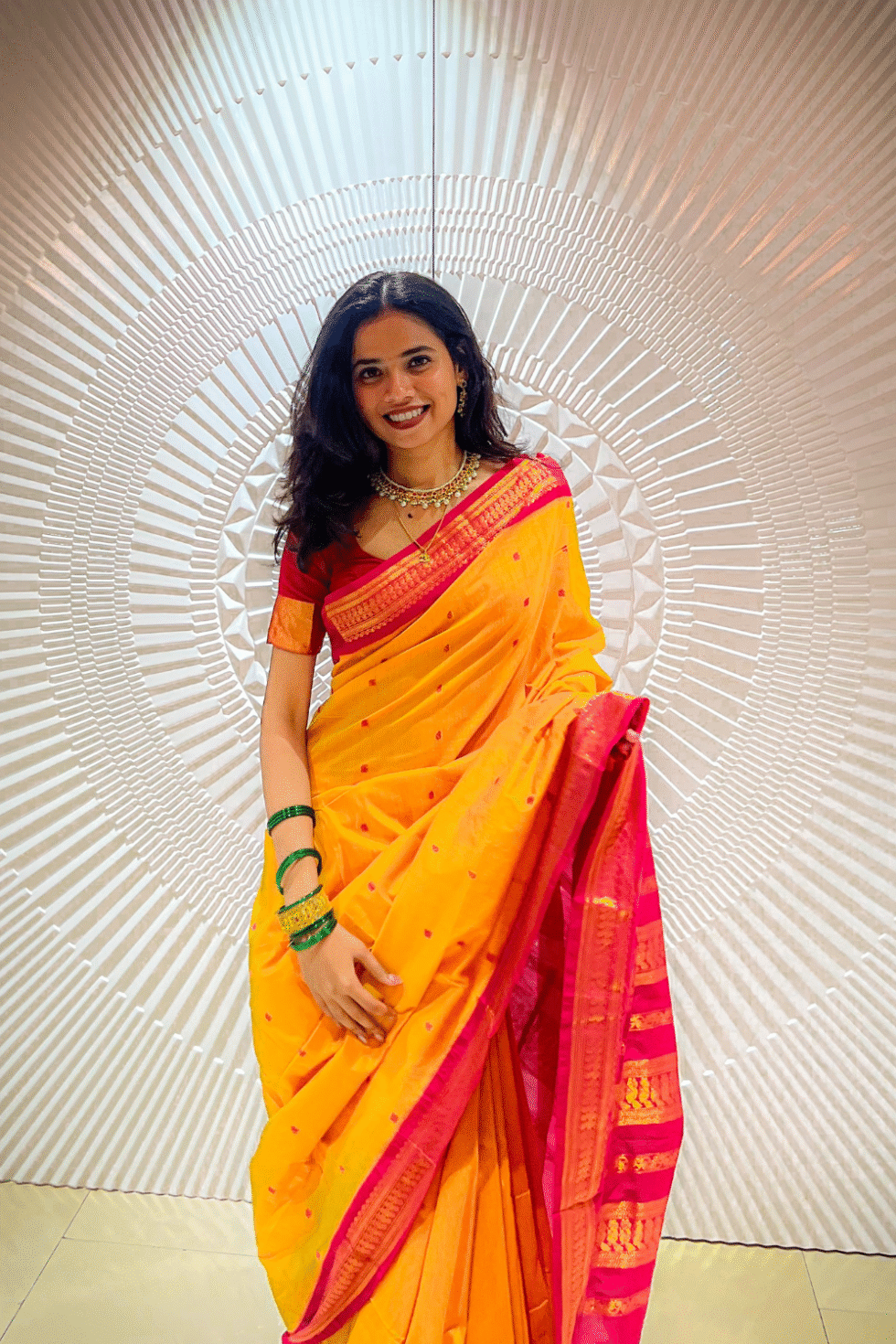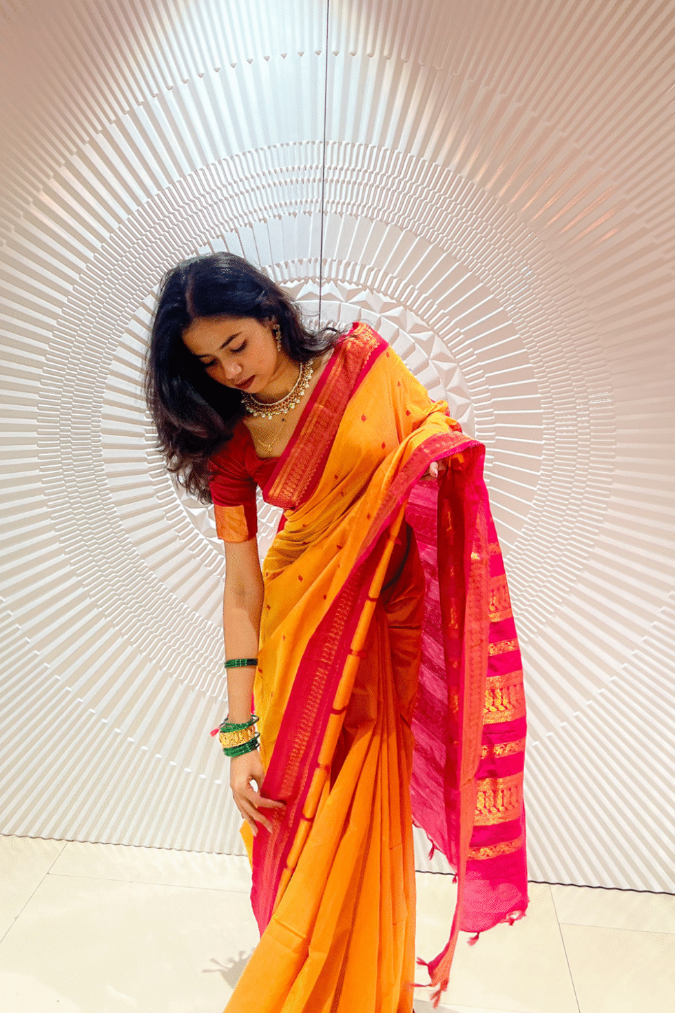 Soft, breathable cotton Paithani fabric—a blend of comfort and tradition. Perfect for all-day wear while still looking elegant and polished.