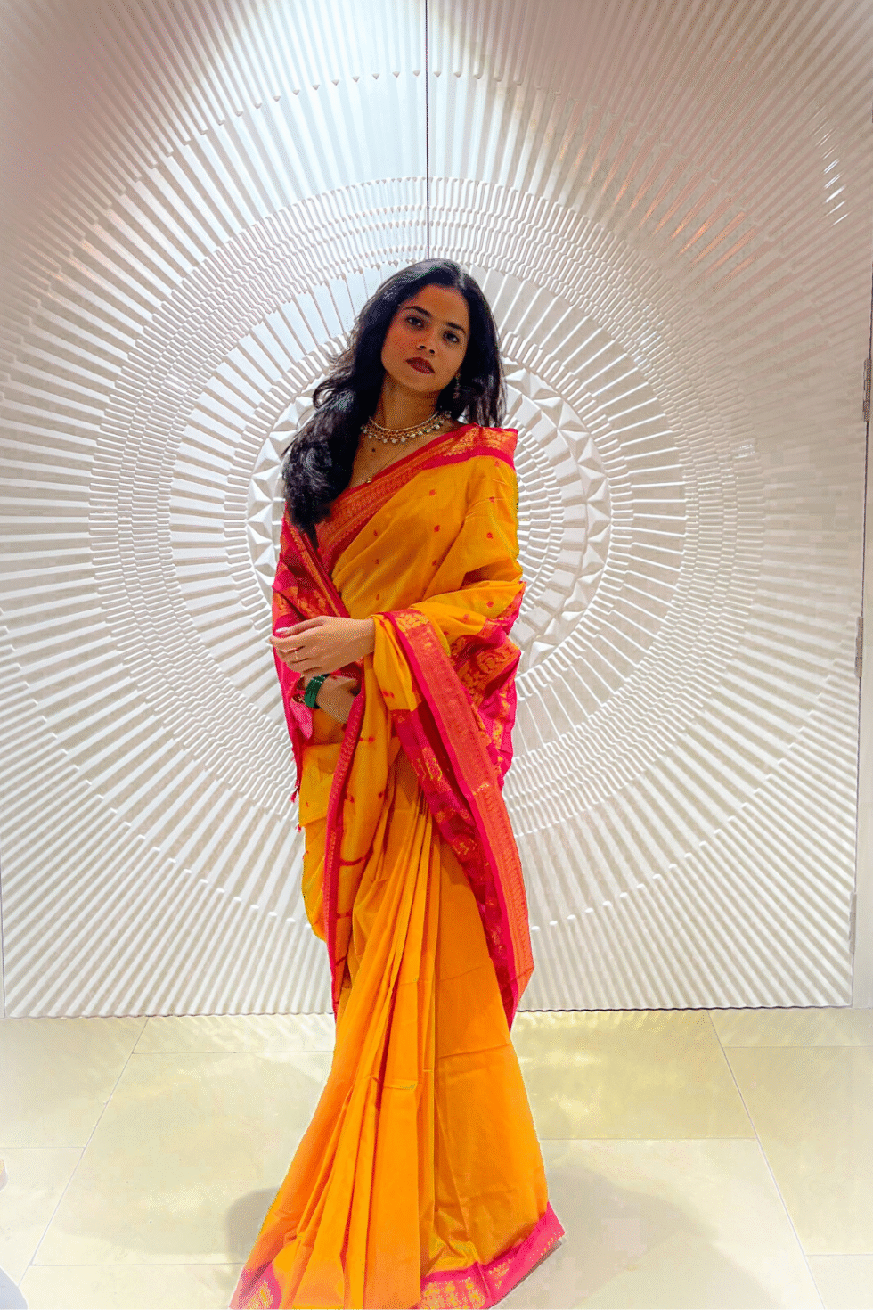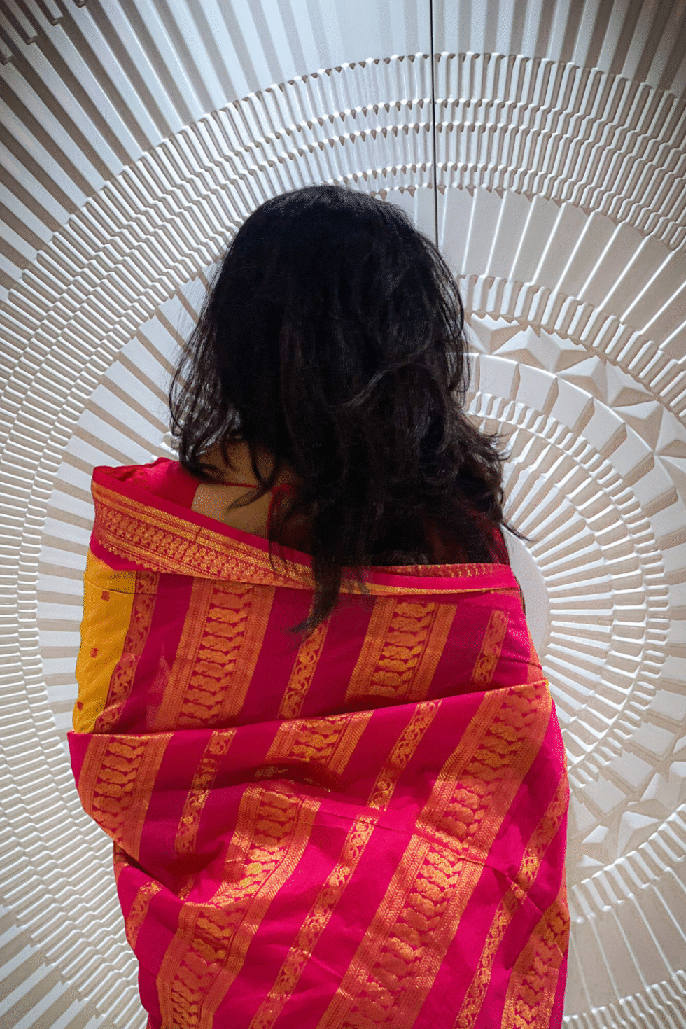 A vibrant pink Paithani border, intricately woven with golden zari and classic floral patterns. The pink against the yellow adds a playful yet elegant contrast, full of character and charm.