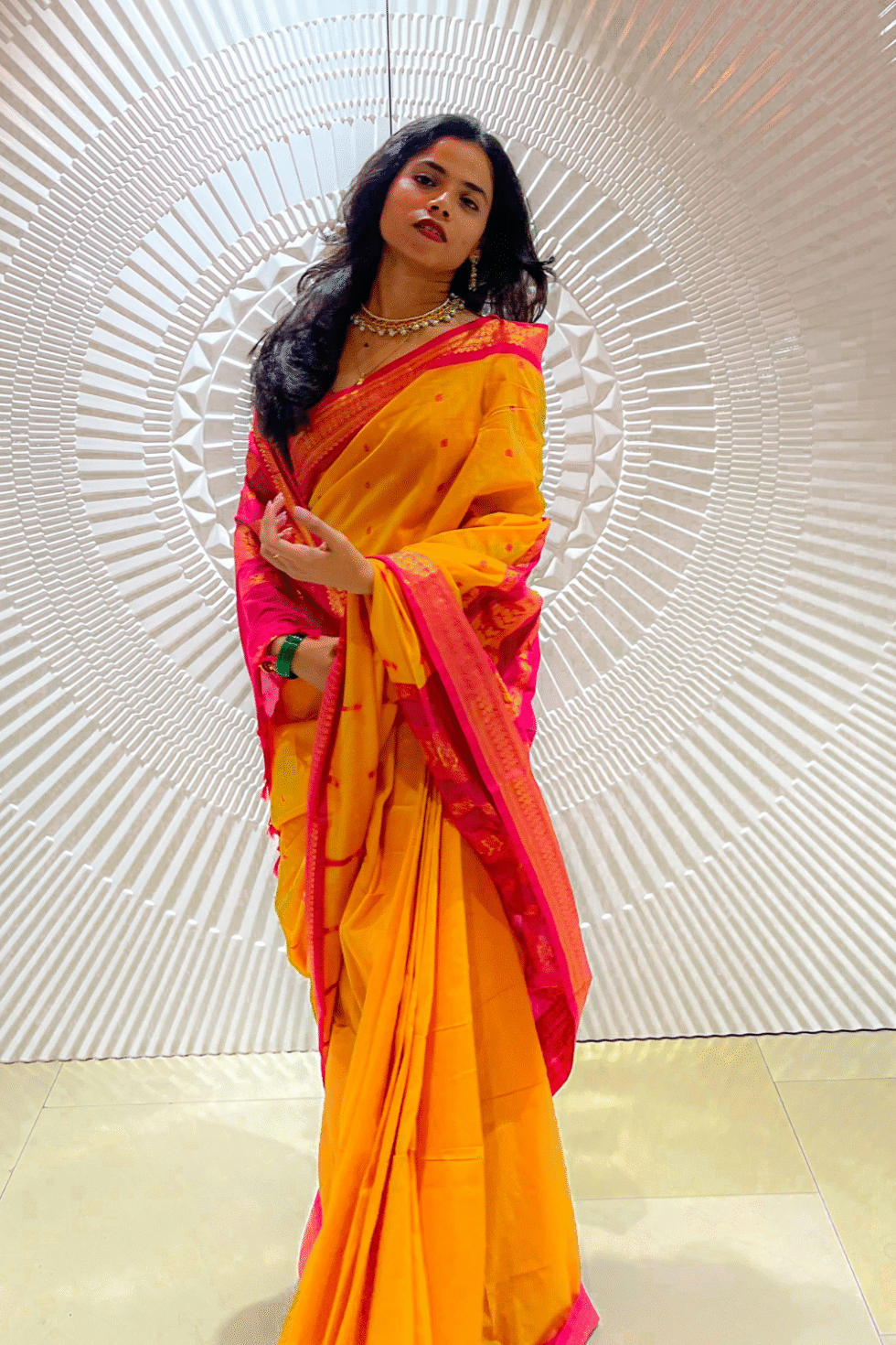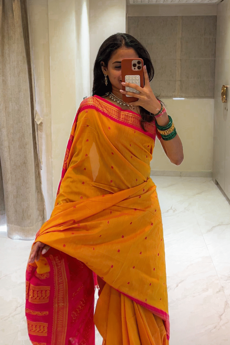 A vibrant yellow cotton Paithani saree with a rich pink zari border—lightweight, breathable, and rooted in tradition. Perfect for pujas, festive mornings, and cultural celebrations.