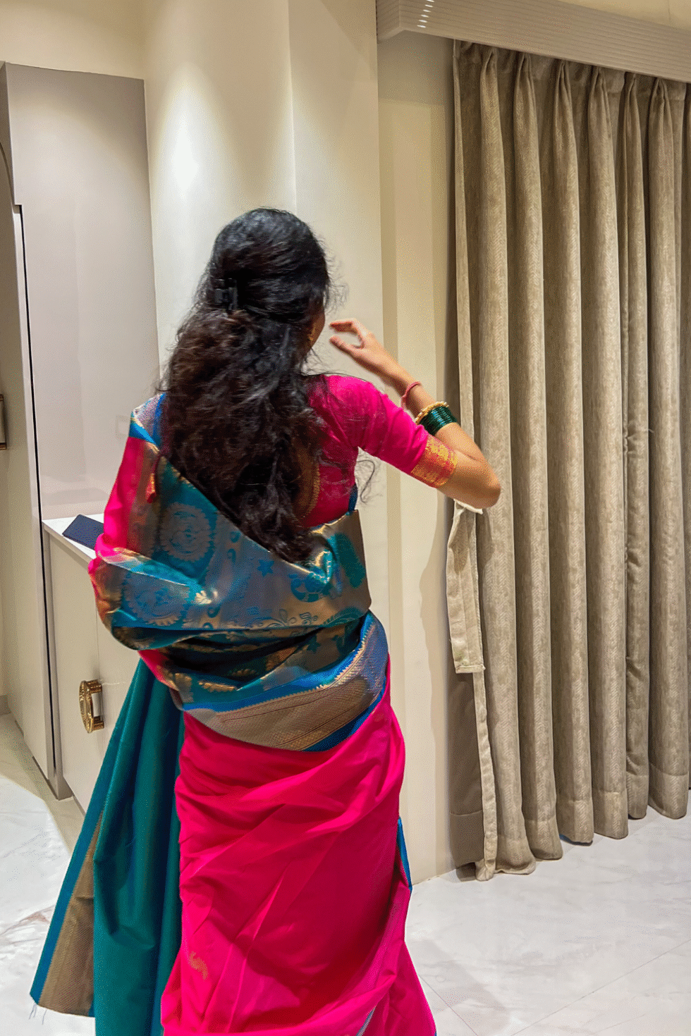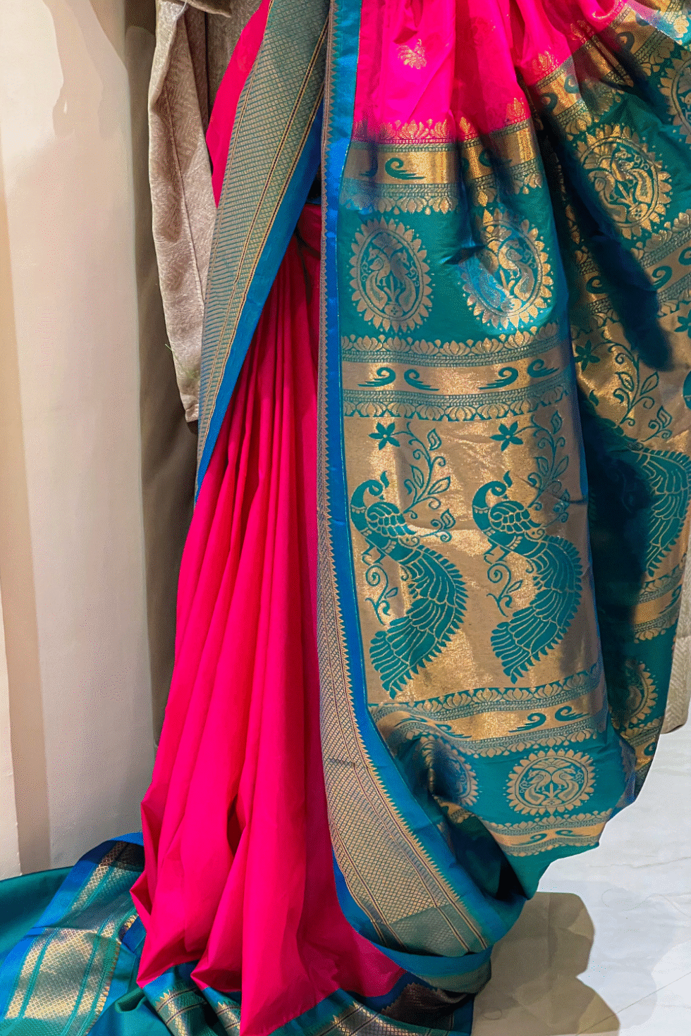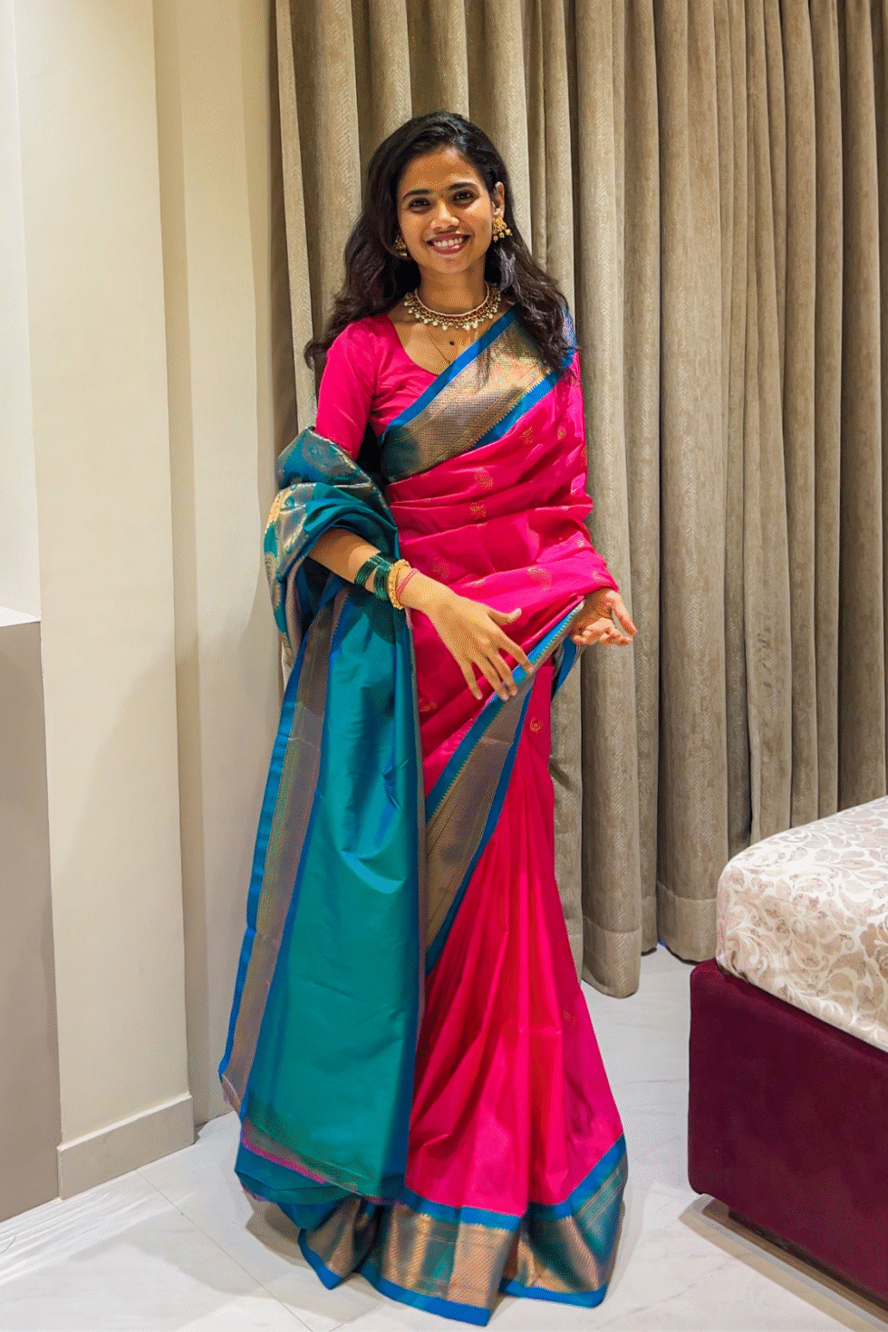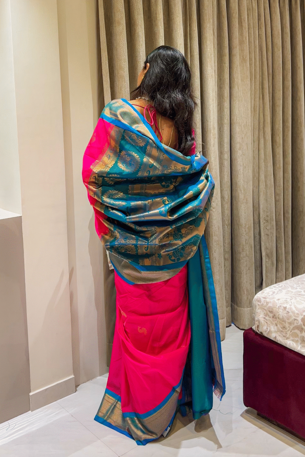 A vibrant pink body balanced with a royal blue border and golden zari accents — a striking mix of tradition and grandeur.
