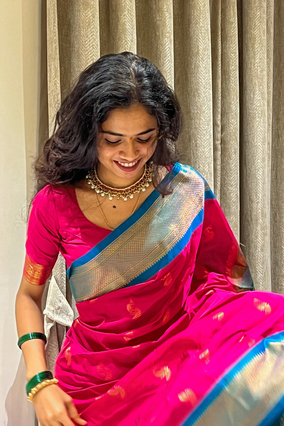 Pink Paithani silk with a royal blue-gold zari border & heritage pallu. Festive, bold, and perfect for grand occasions.