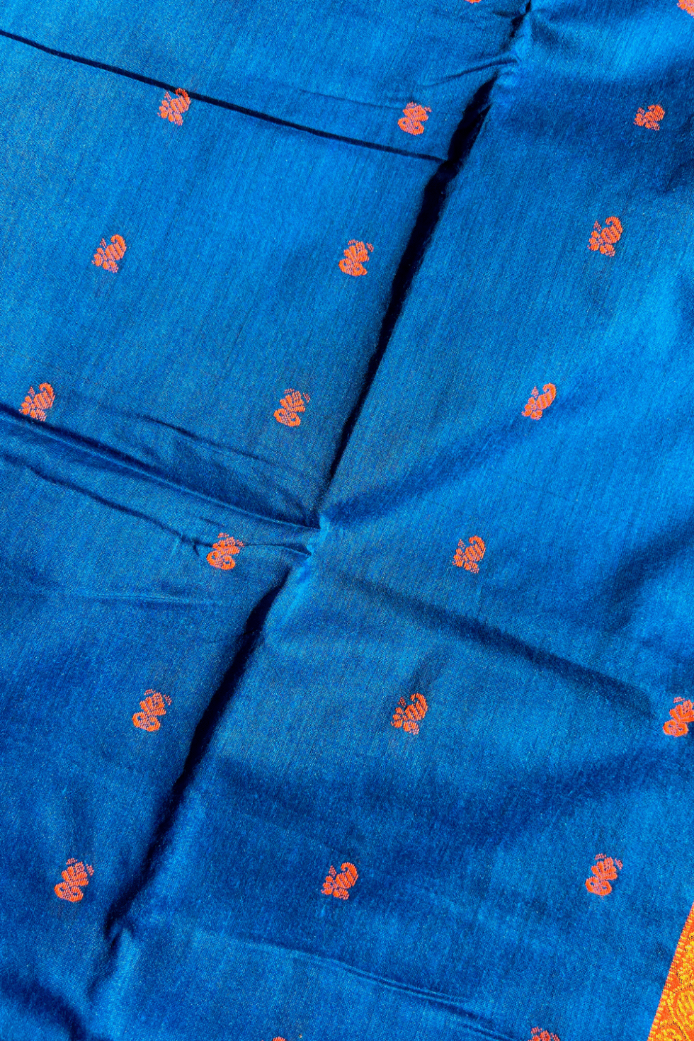 This sky blue cotton Paithani saree features dainty butis and a bold orange zari border, blending calm elegance with festive energy. The detailed pallu and matching blouse enhance its charm. Ideal for haldi functions, poojas, or vibrant day events. Style with gold jewelry and a fresh braid for a radiant traditional look
