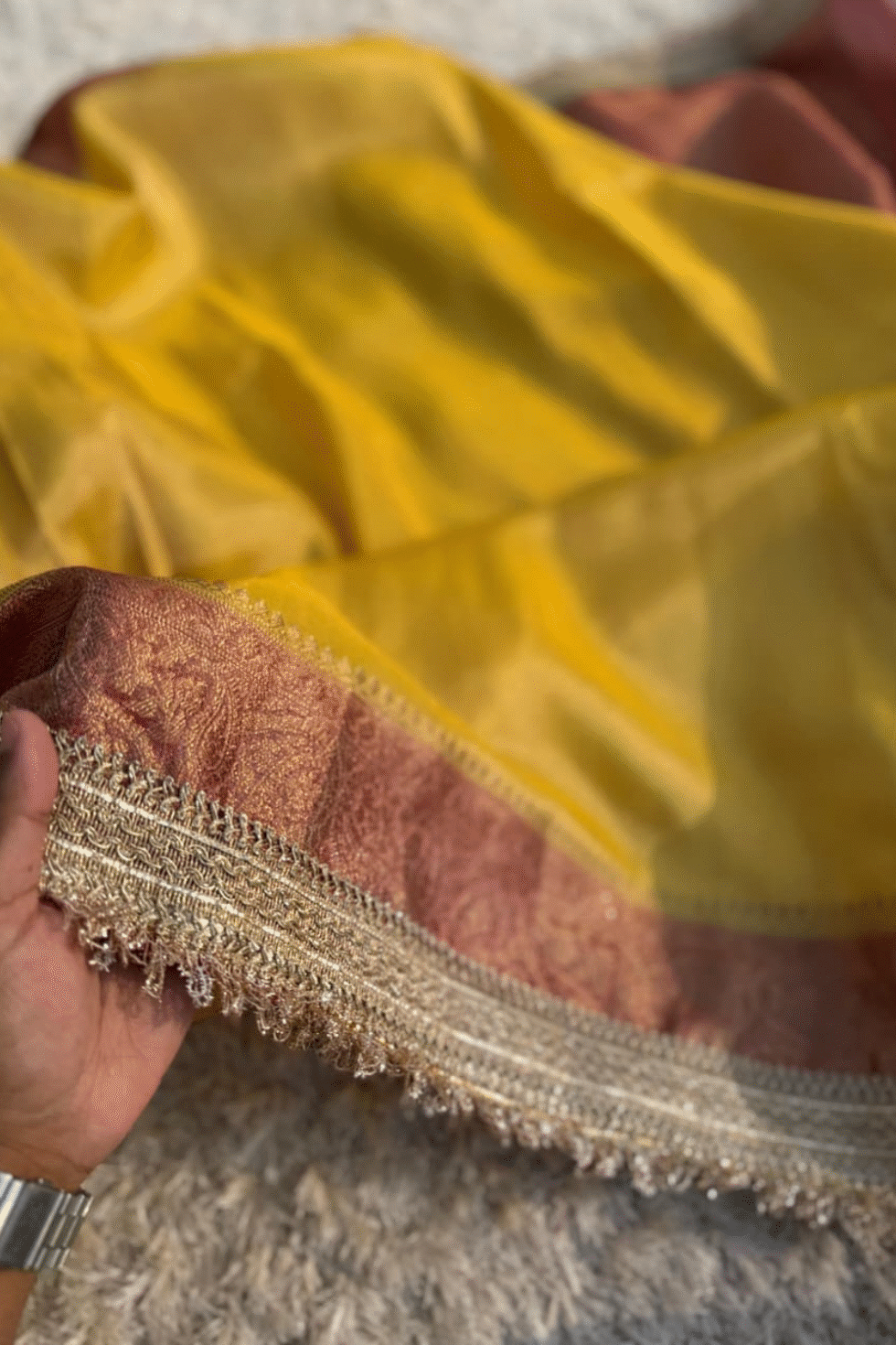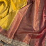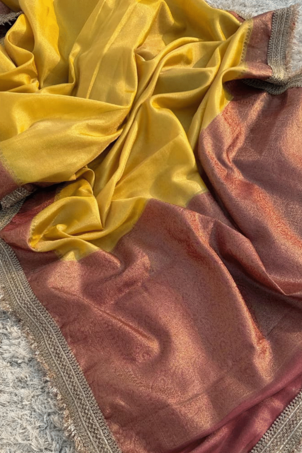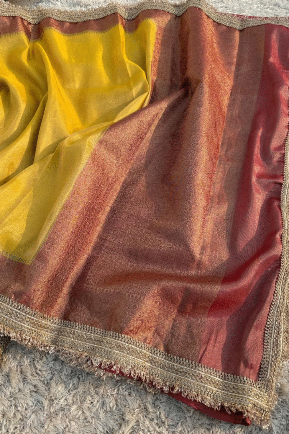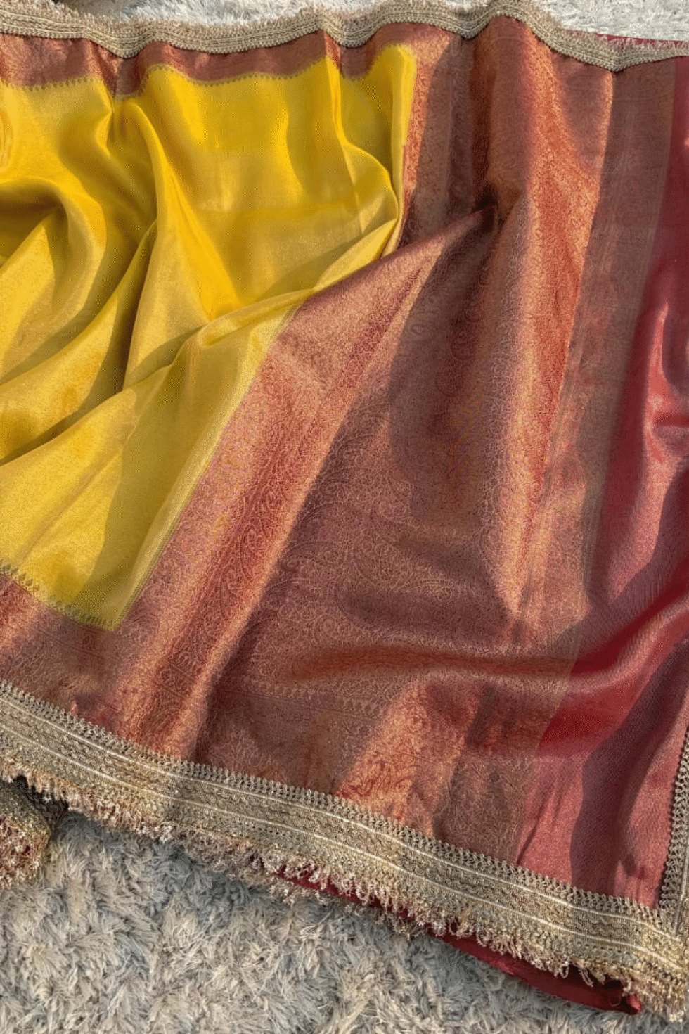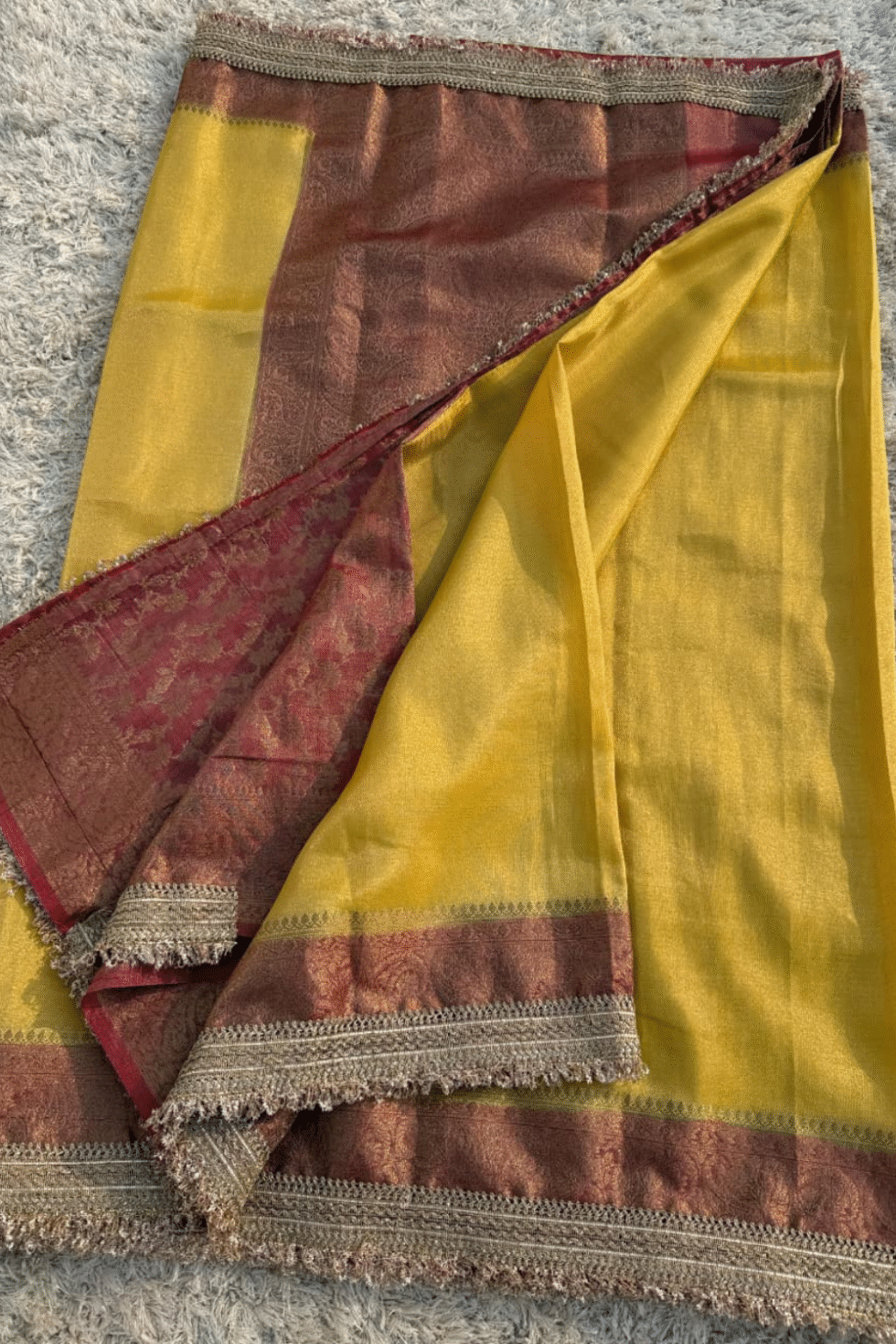 A radiant yellow and deep maroon tissue Banarasi saree woven with antique zari, rich borders, and a lightweight festive drape. Perfect for weddings, haldi, puja ceremonies, and traditional celebrations.