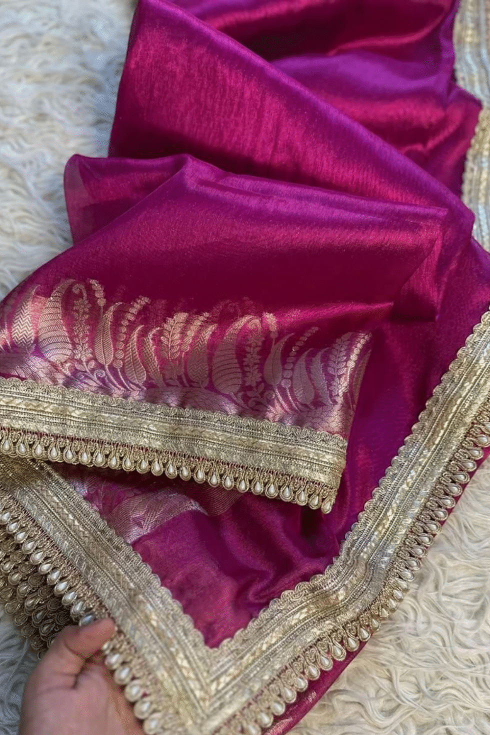 A luxurious drape crafted in soft, lightweight silk-blend tissue, this saree shines with a gentle, luminous glow — almost like rose-gold light melting into soft pink. The fabric feels smooth, airy, and feather-light, giving you elegance without weight. Perfect for long functions where comfort and beauty must go hand in hand.