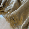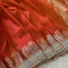 The saree features a rich golden zari border that stands out with regal elegance. The beautifully woven Banarasi pallu enhances the drape with heritage charm and premium detailing. Not too loud, not too minimal — just the right amount of grandeur, ideal for wedding wear.