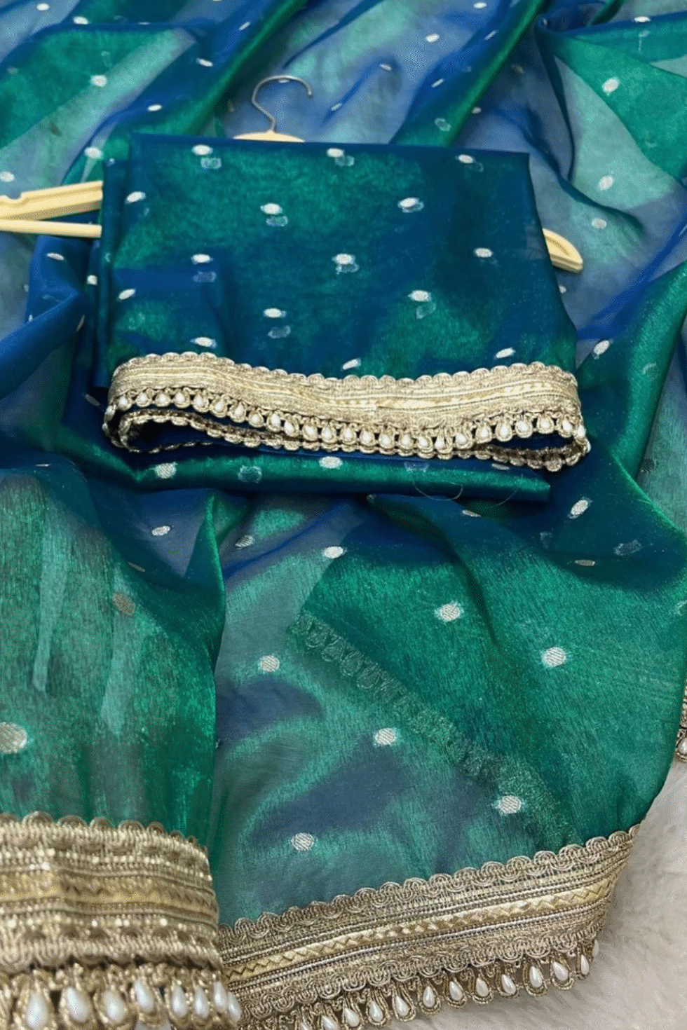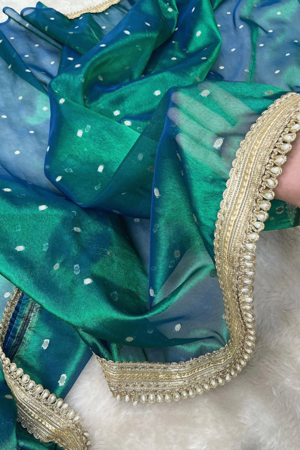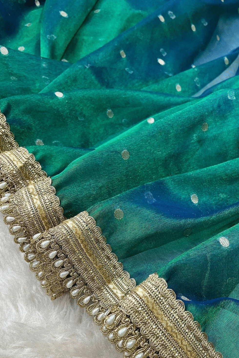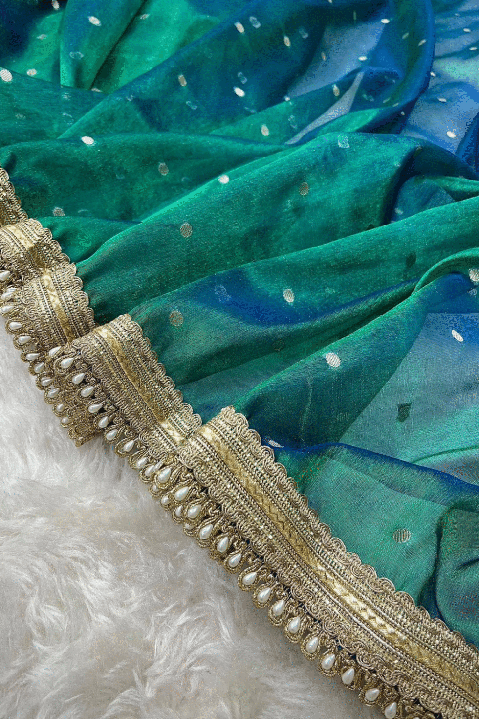 A dual-tone emerald–teal Banarasi tissue saree adorned with gold buttas and a handcrafted pearl border — lightweight, luminous, and perfect for wedding elegance.