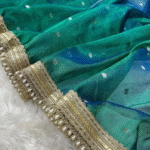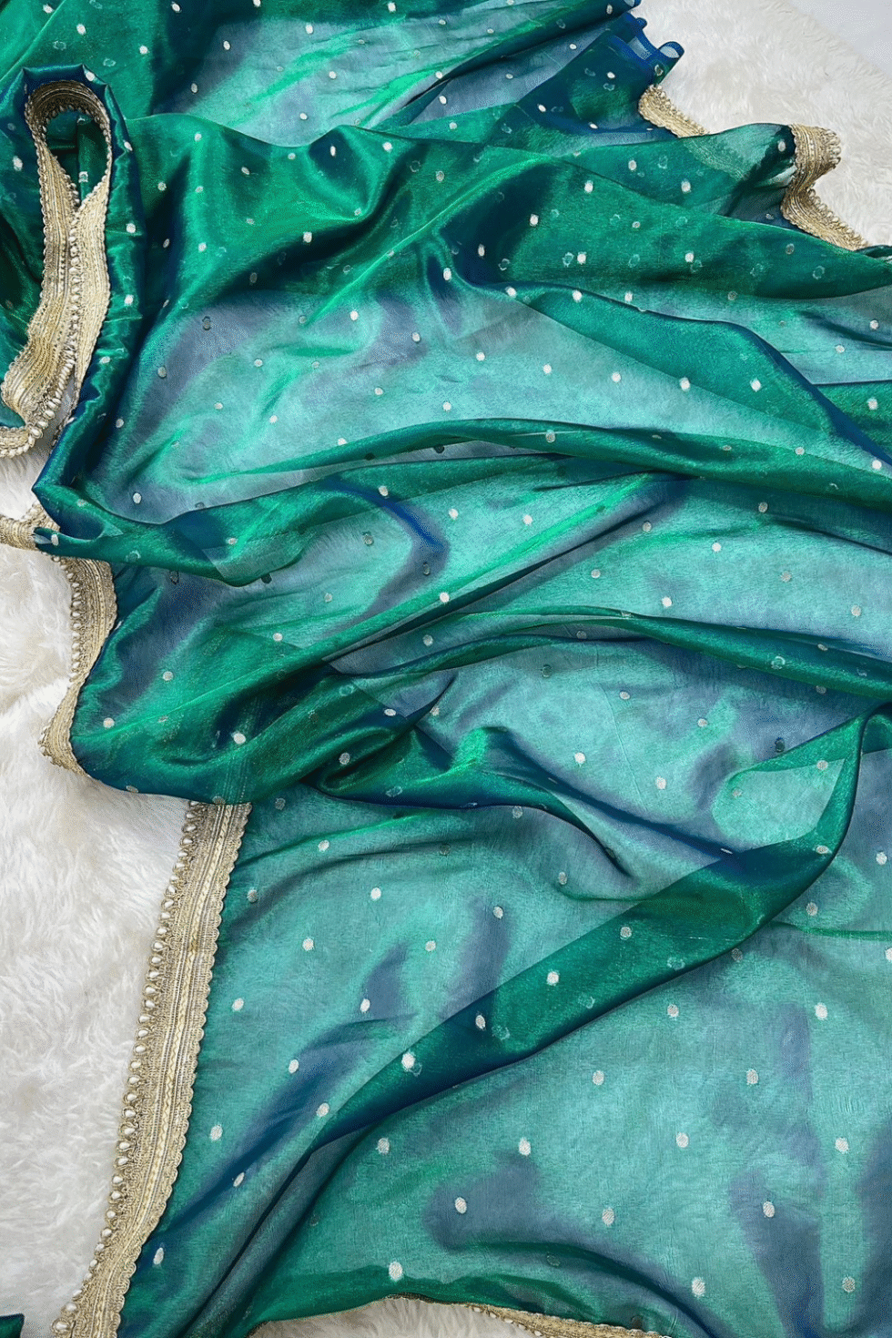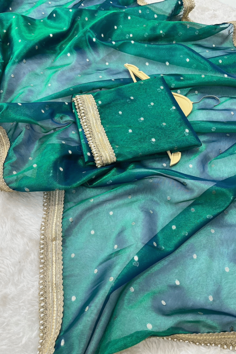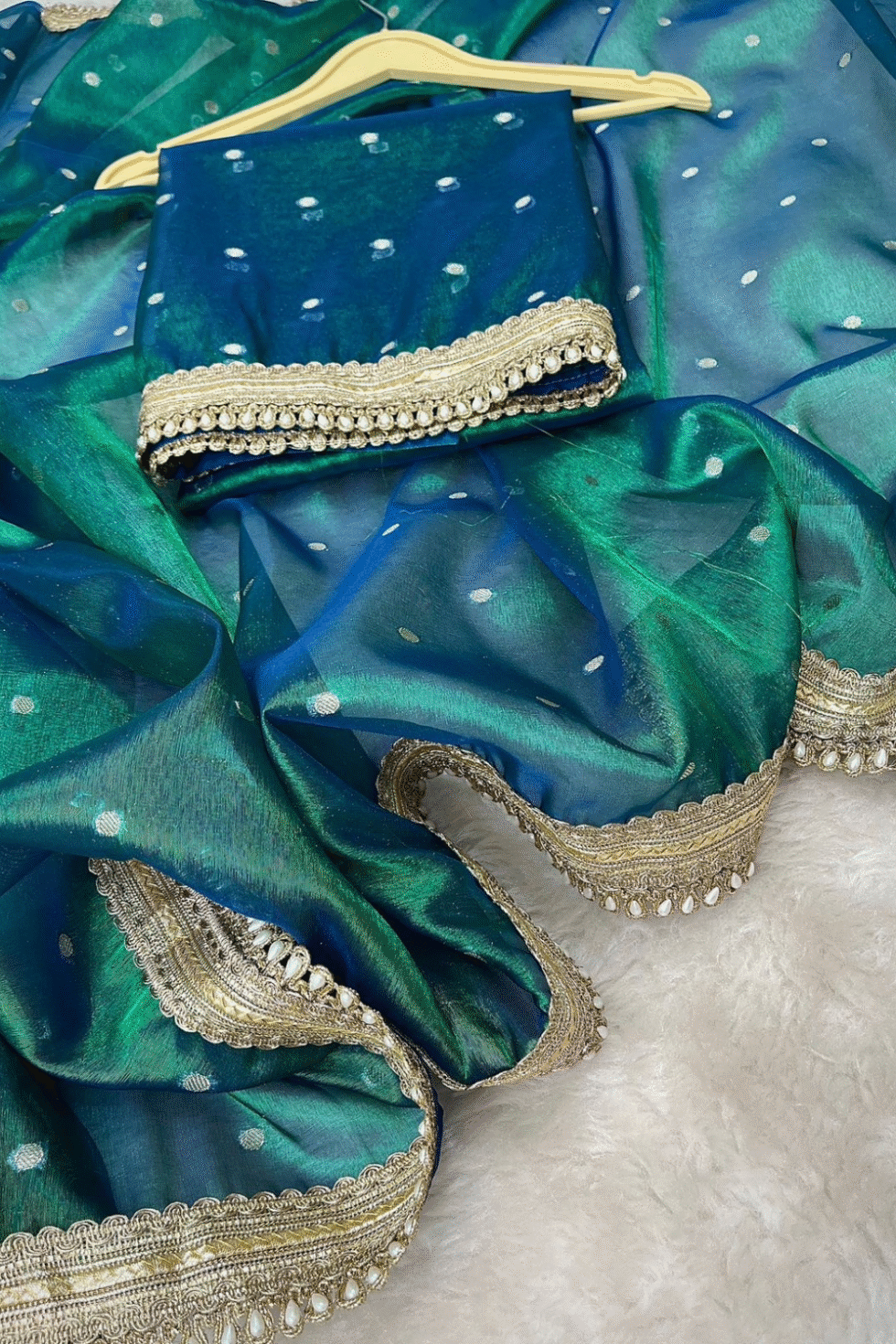 A dual-tone emerald–teal Banarasi tissue saree adorned with gold buttas and a handcrafted pearl border — lightweight, luminous, and perfect for wedding elegance.