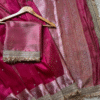 Pure Banarasi Tissue Silk — known for its sheer finish, lightweight feel, and the natural metallic sheen that gives a festive, royal glow.