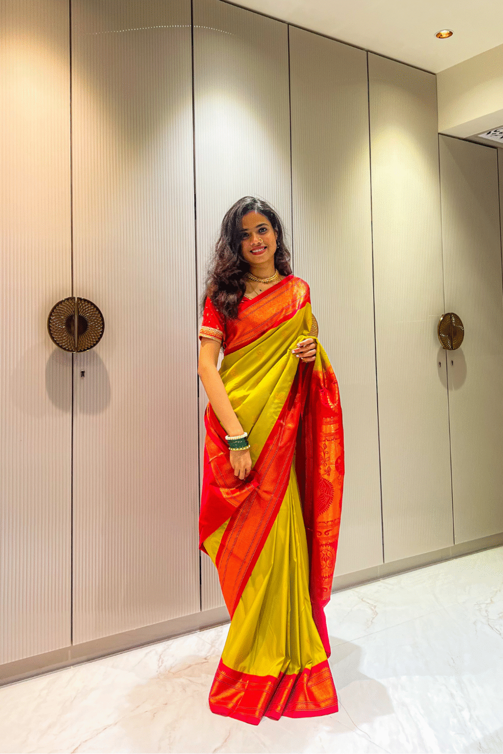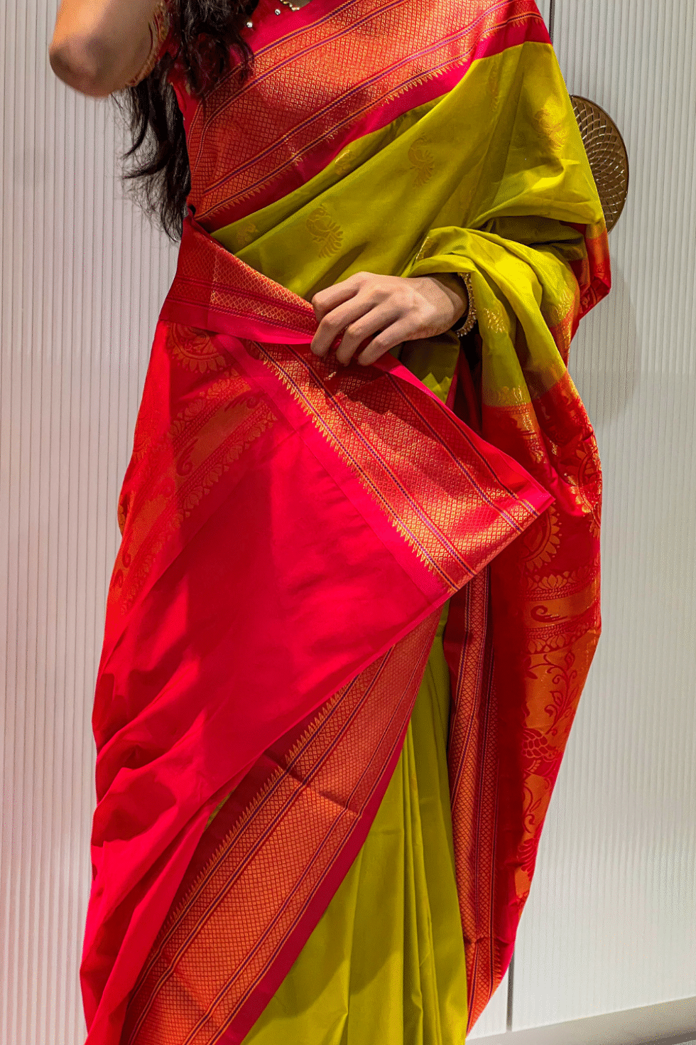 Vibrant mehendi green silk saree with bold red-gold zari border and pallu. A festive classic, perfect for weddings and traditional occasions.
