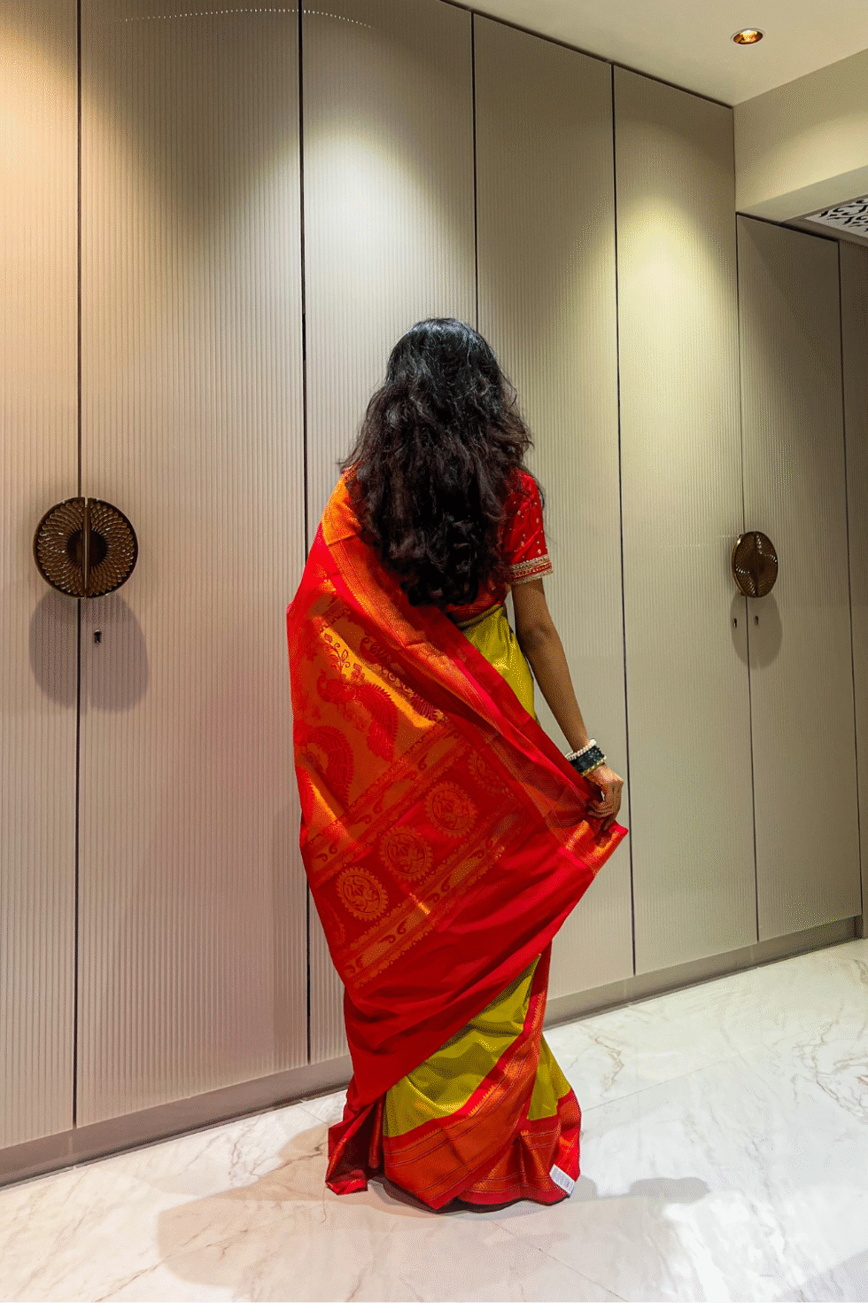 Pure silk saree, prized for its lustrous texture and graceful fall — a true heirloom piece.