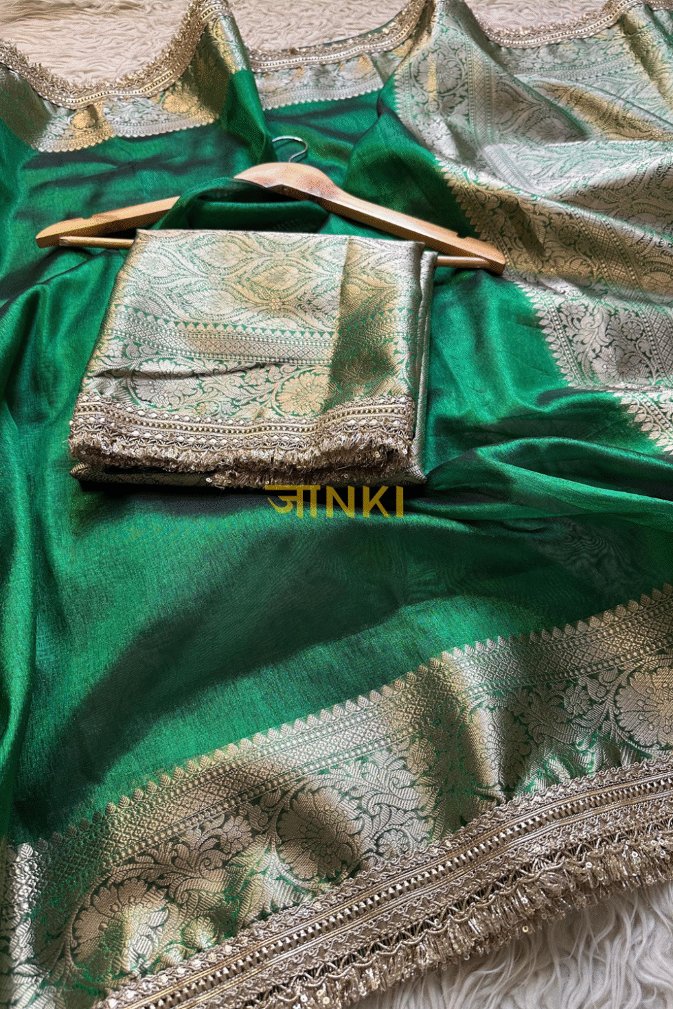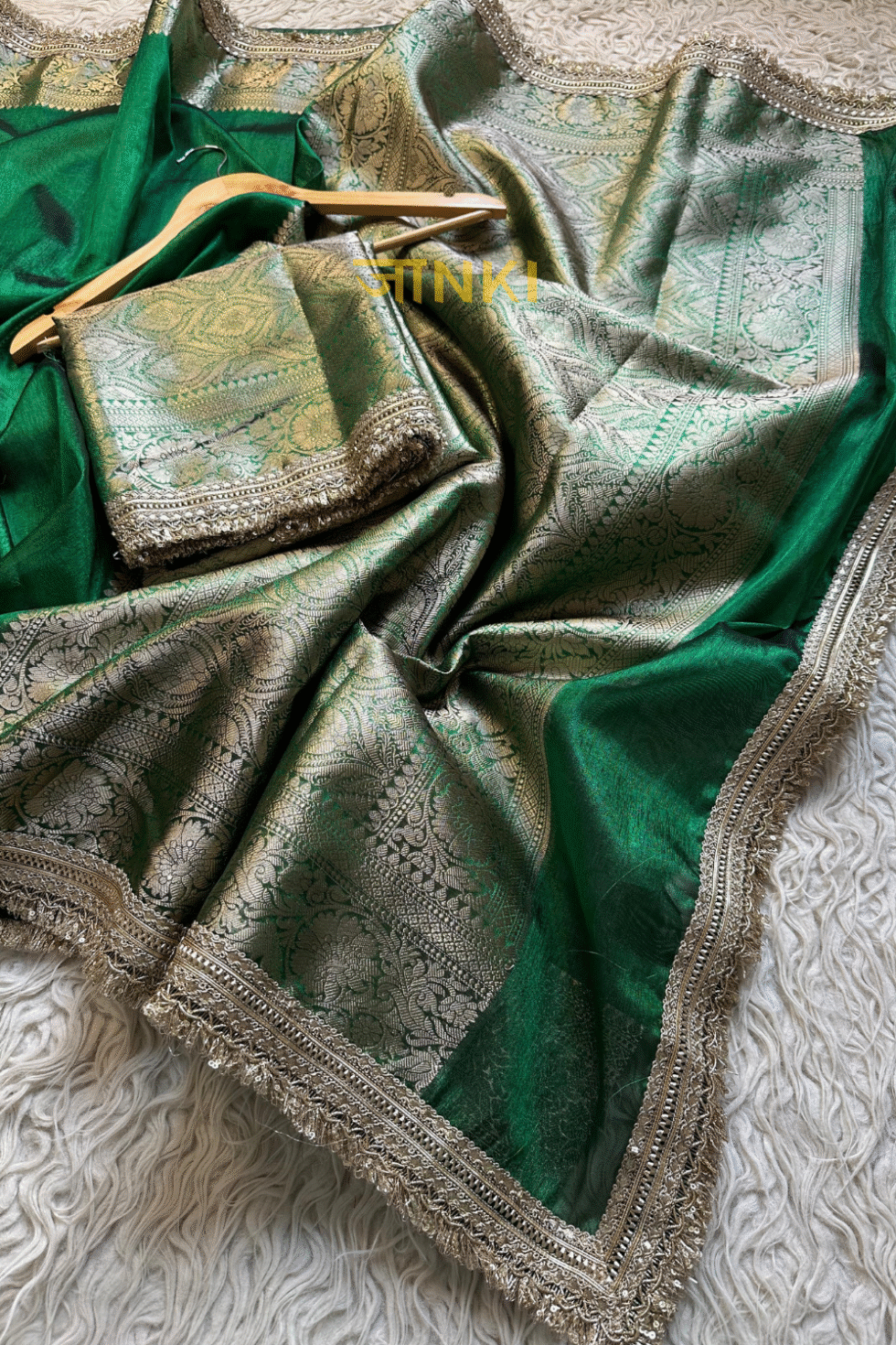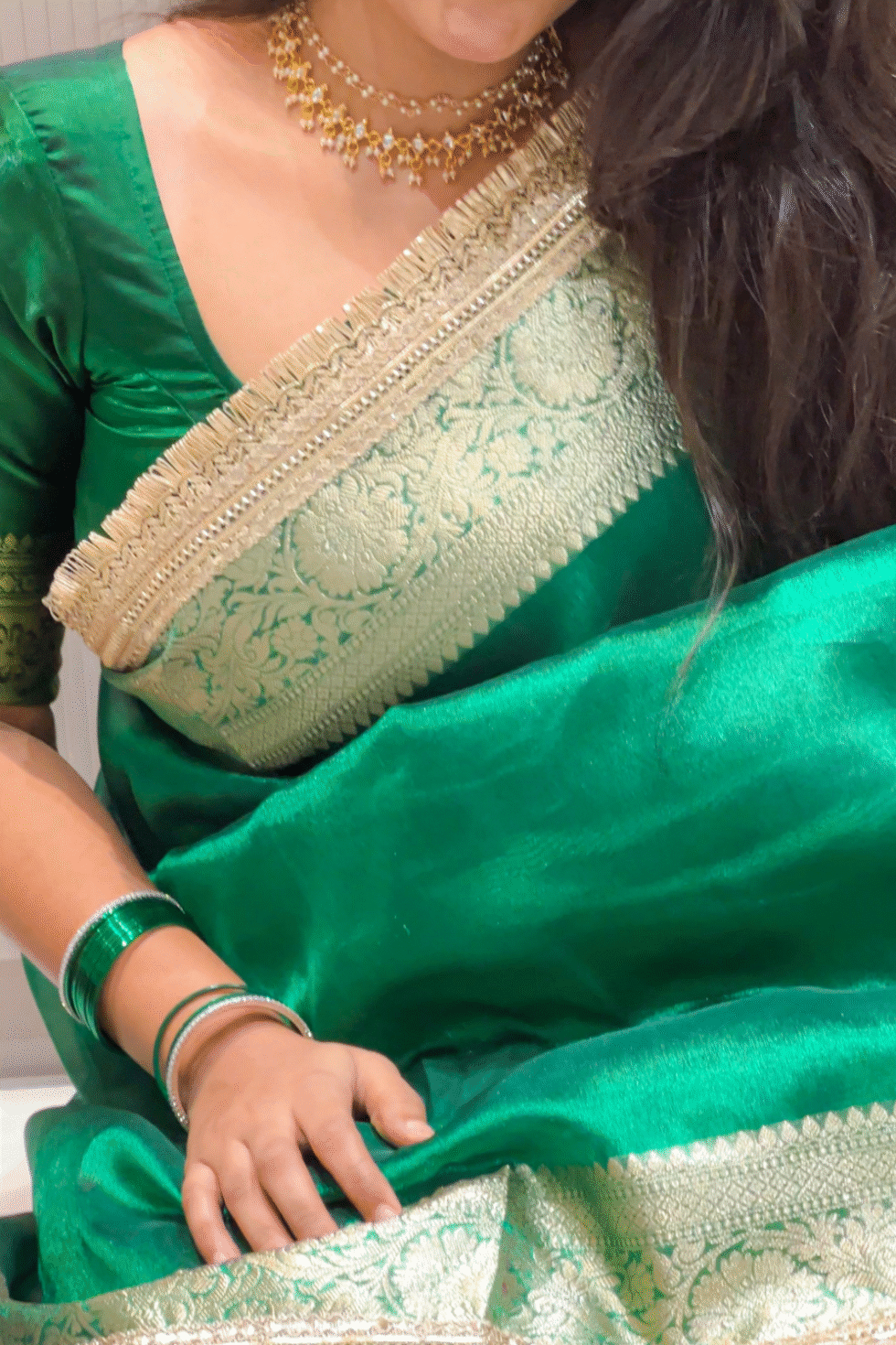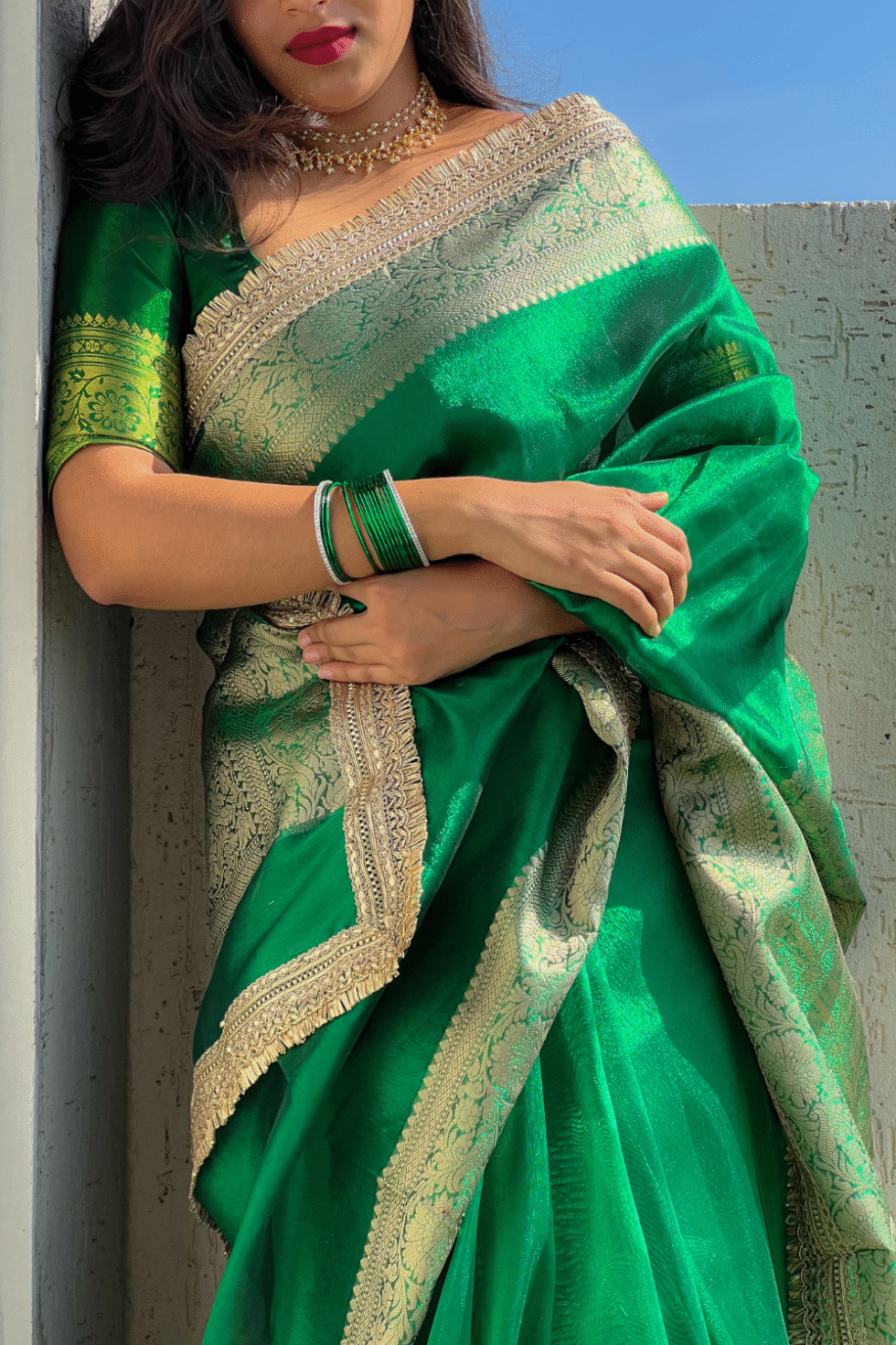 An elegant emerald green Banarasi tissue silk saree with intricate golden zari weaving all over. Finished with a broad floral border and a grand pallu, this saree is perfect for weddings, receptions, and festive celebrations.