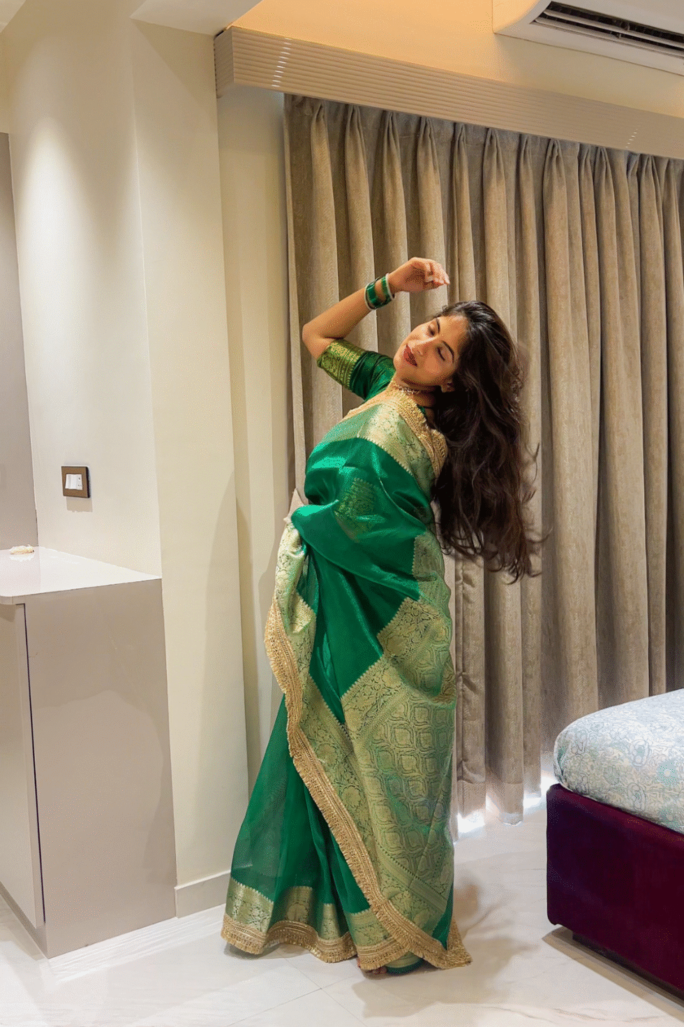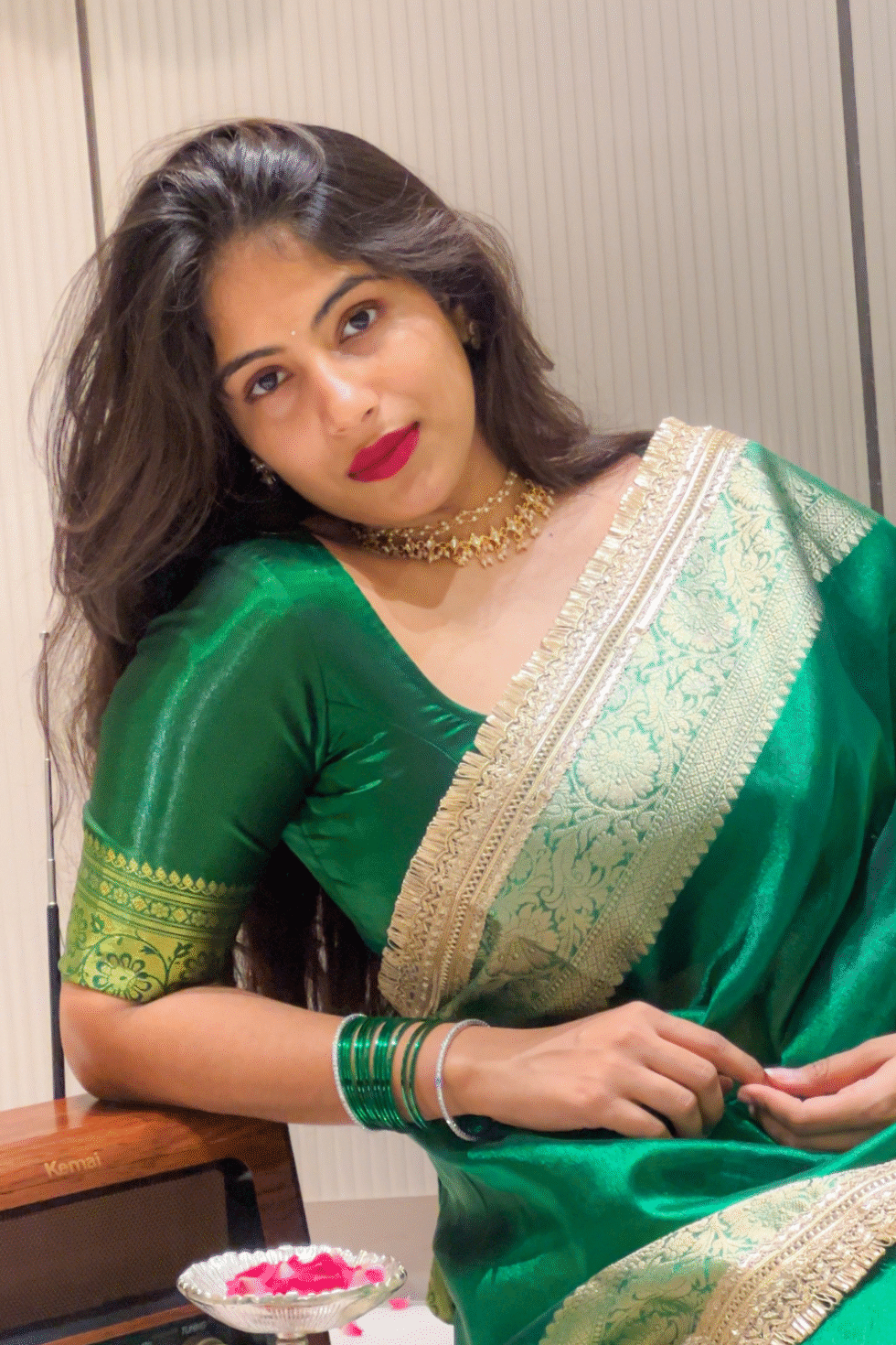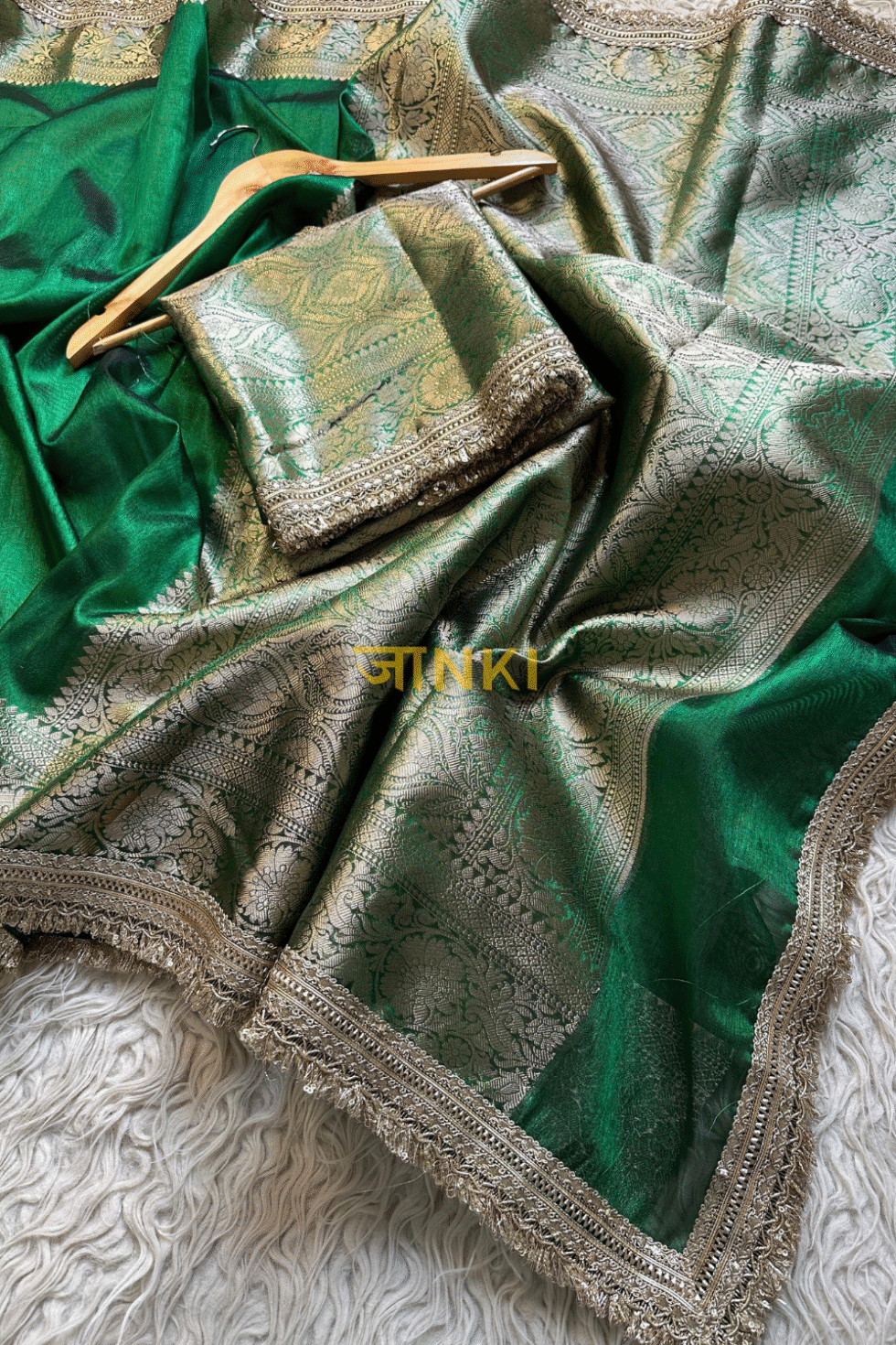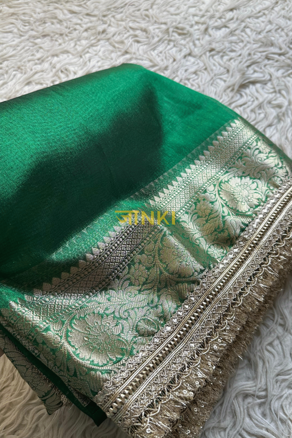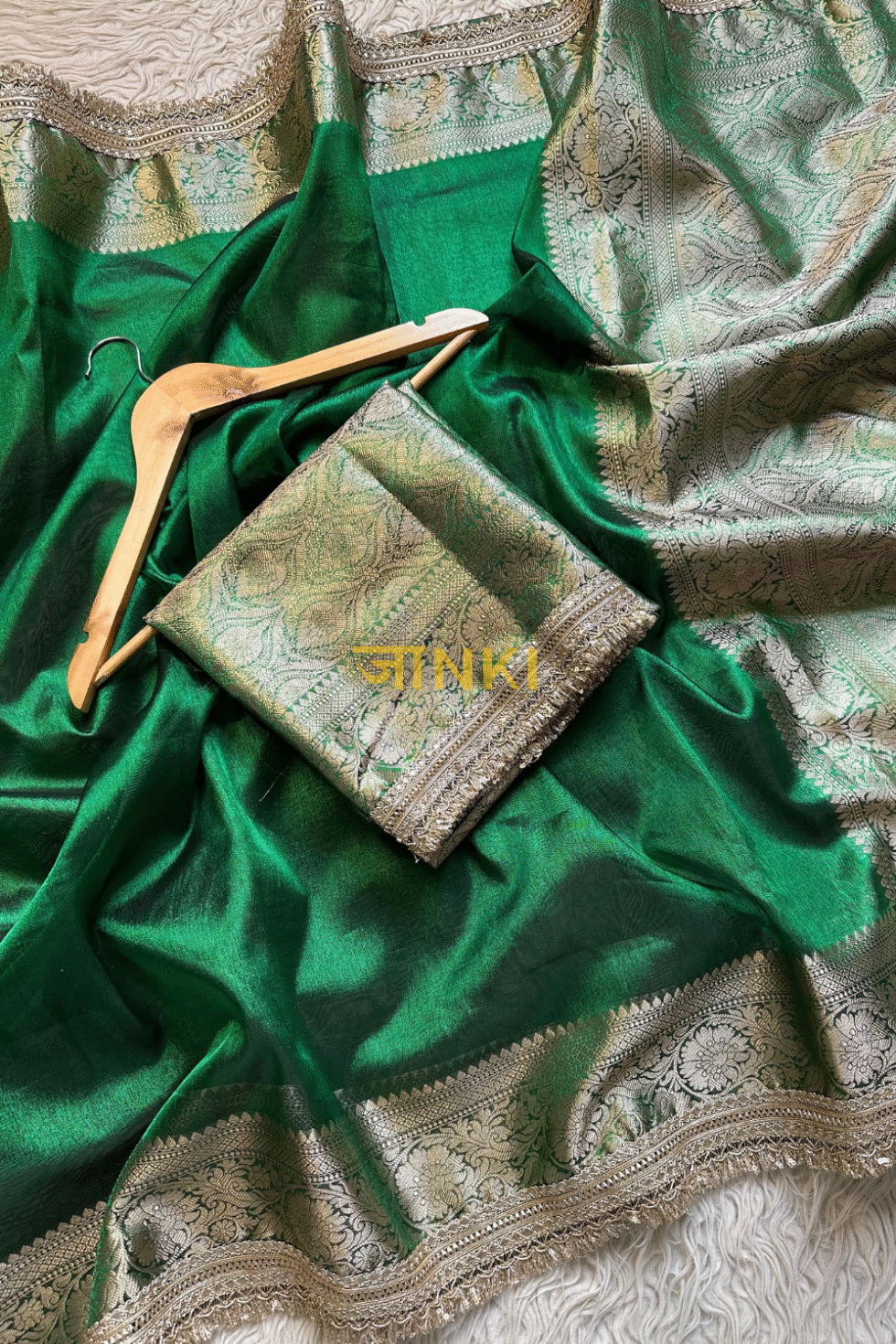 An elegant emerald green Banarasi tissue silk saree with intricate golden zari weaving all over. Finished with a broad floral border and a grand pallu, this saree is perfect for weddings, receptions, and festive celebrations.