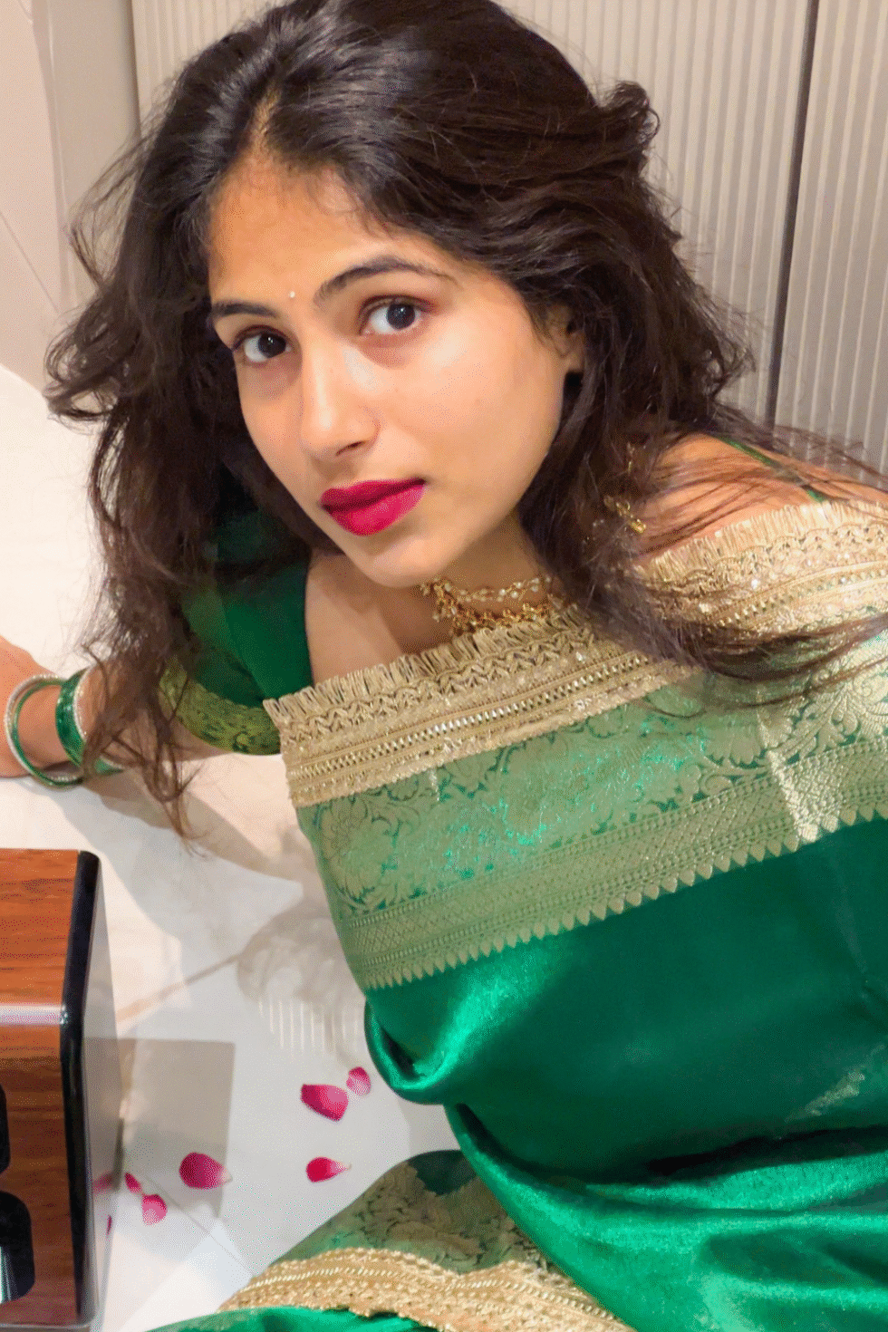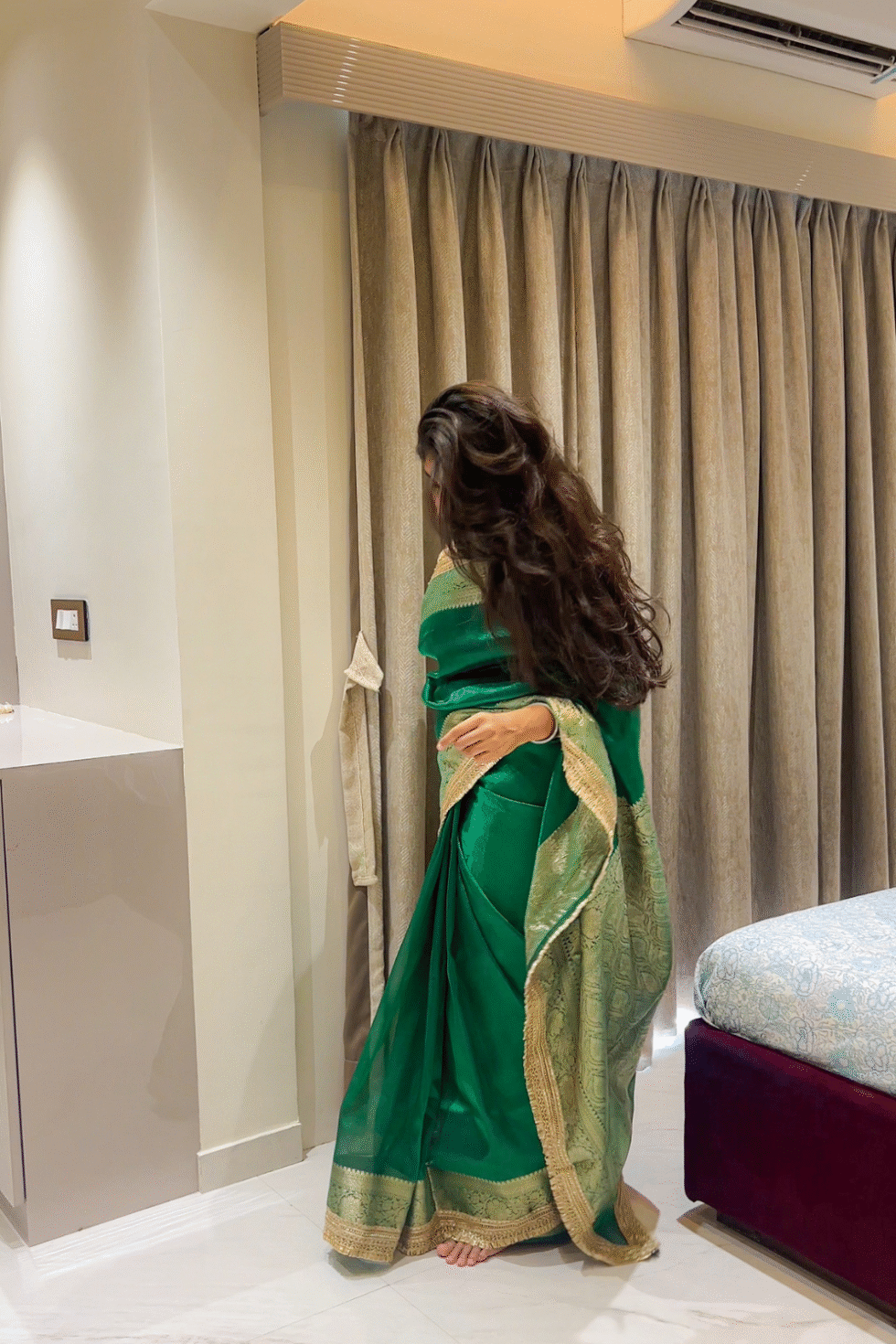 A rich emerald green base paired with all-over antique golden zari weaving. The combination feels both classic and royal, symbolizing prosperity, tradition, and elegance.