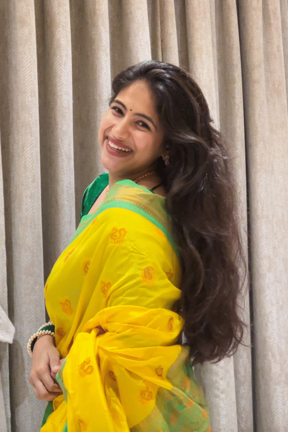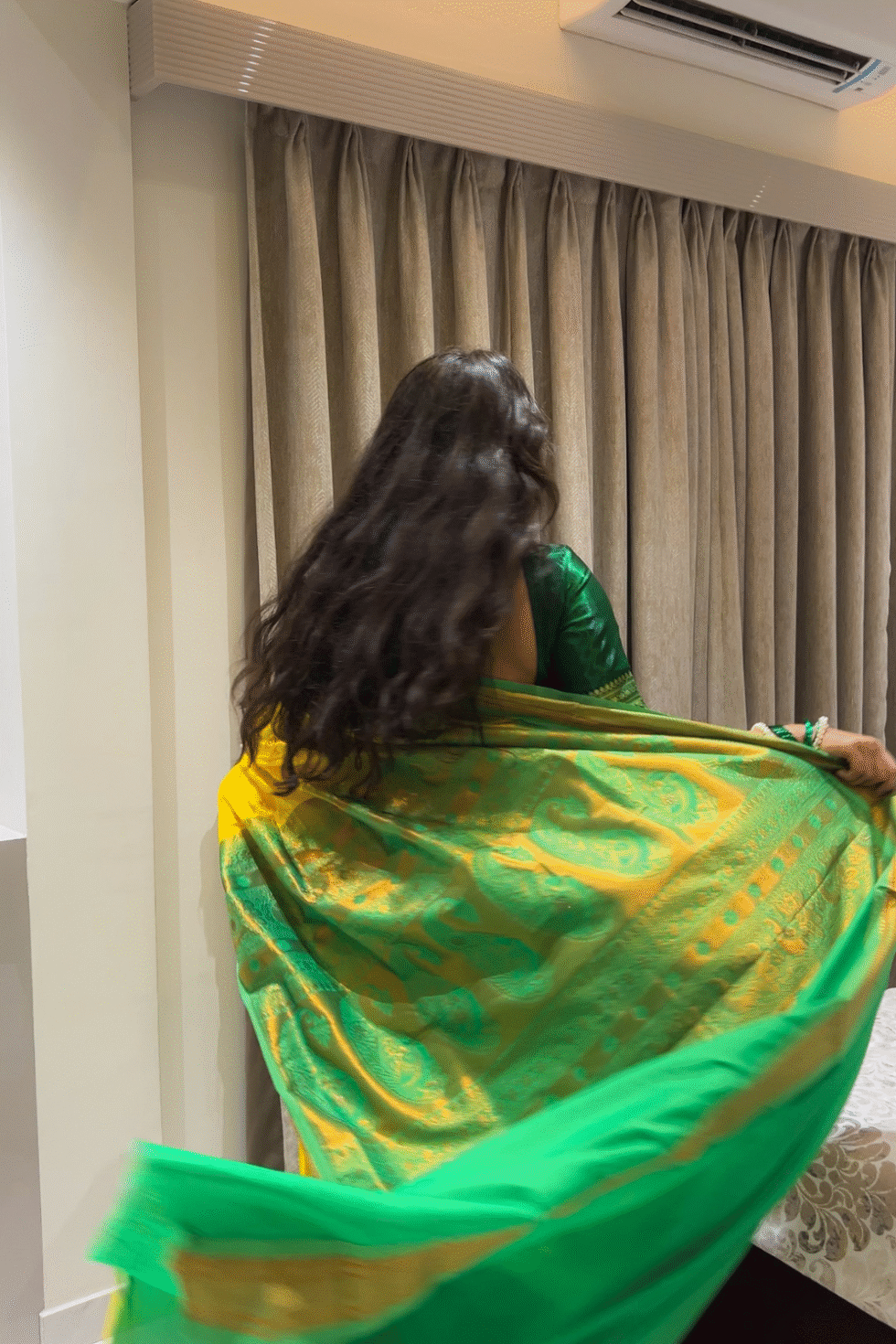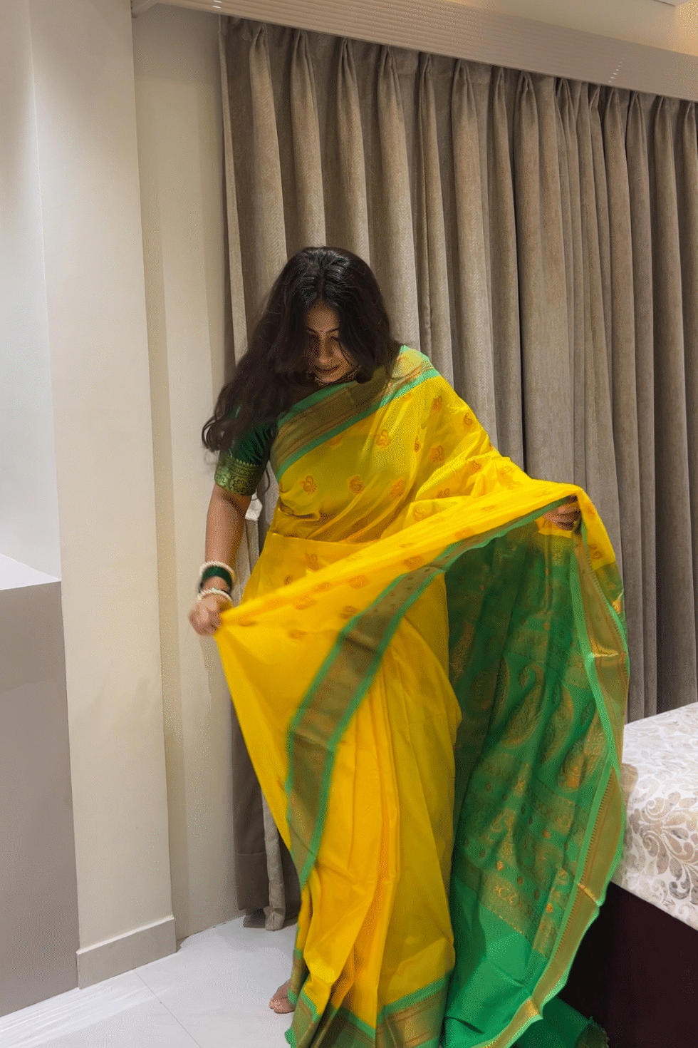 Bright marigold yellow body with a parrot green border and golden zari. The color palette symbolizes prosperity and joy.