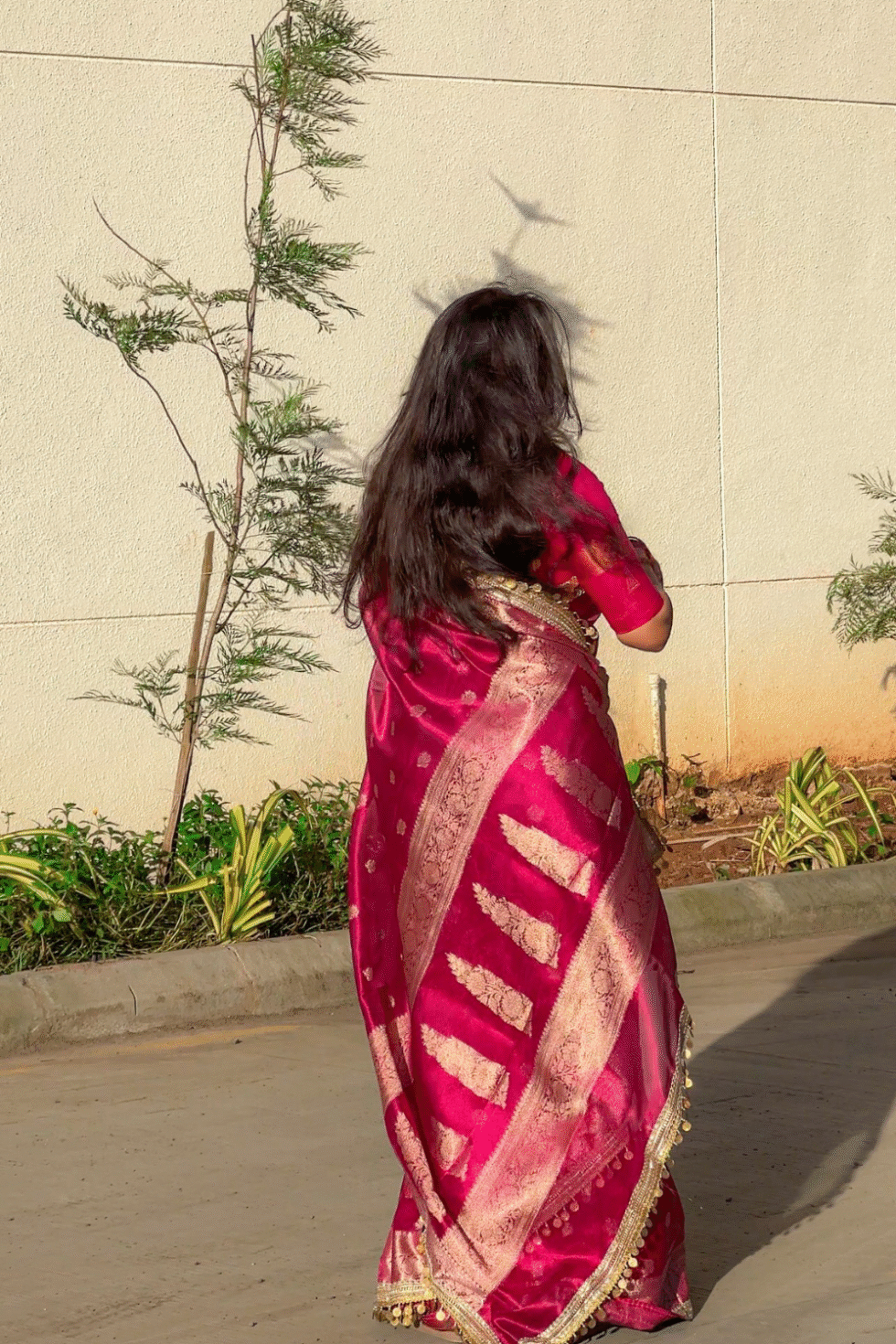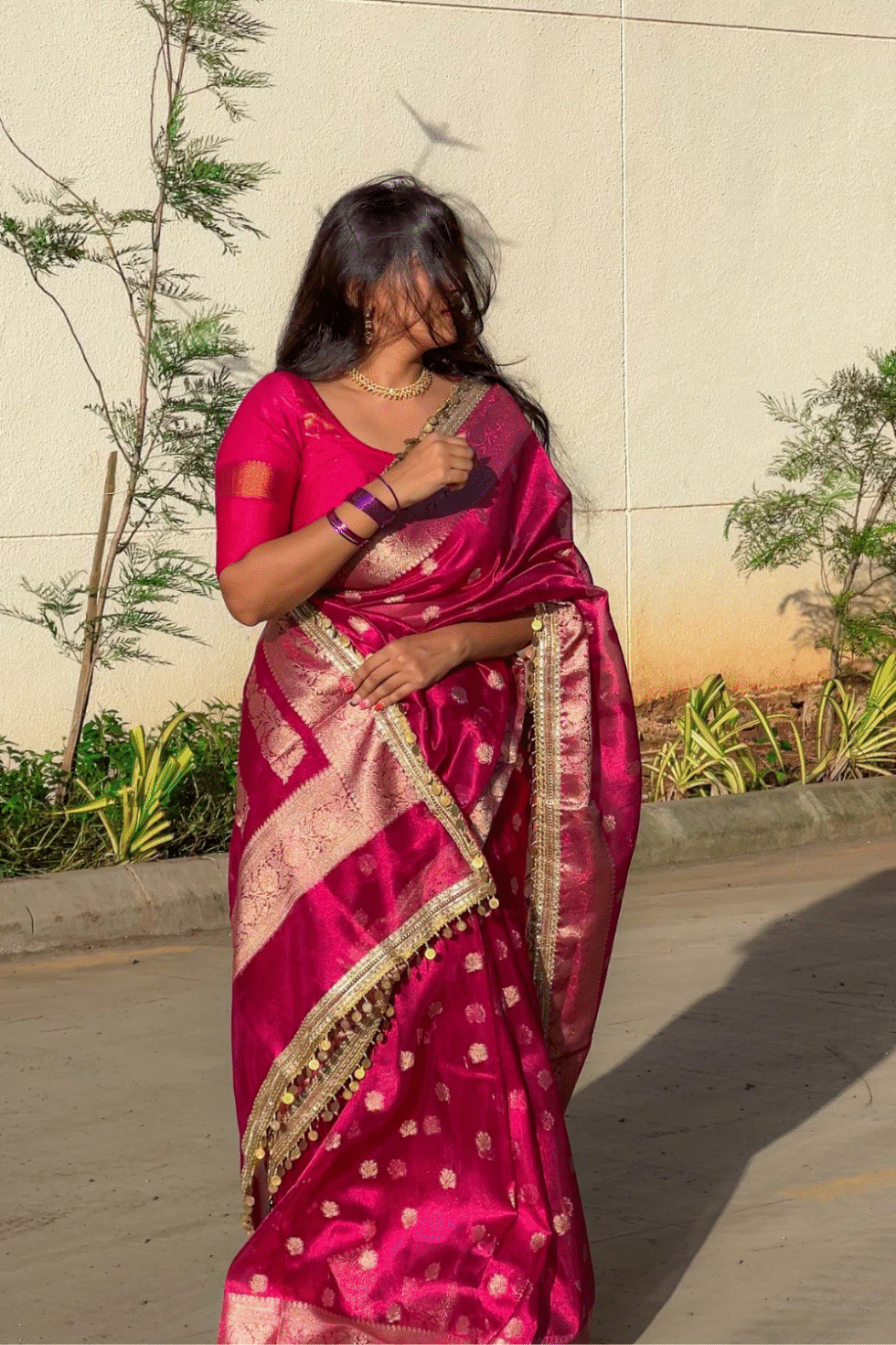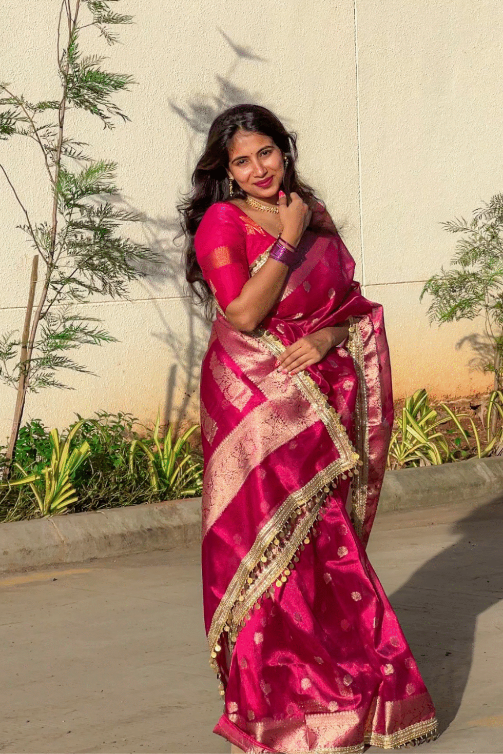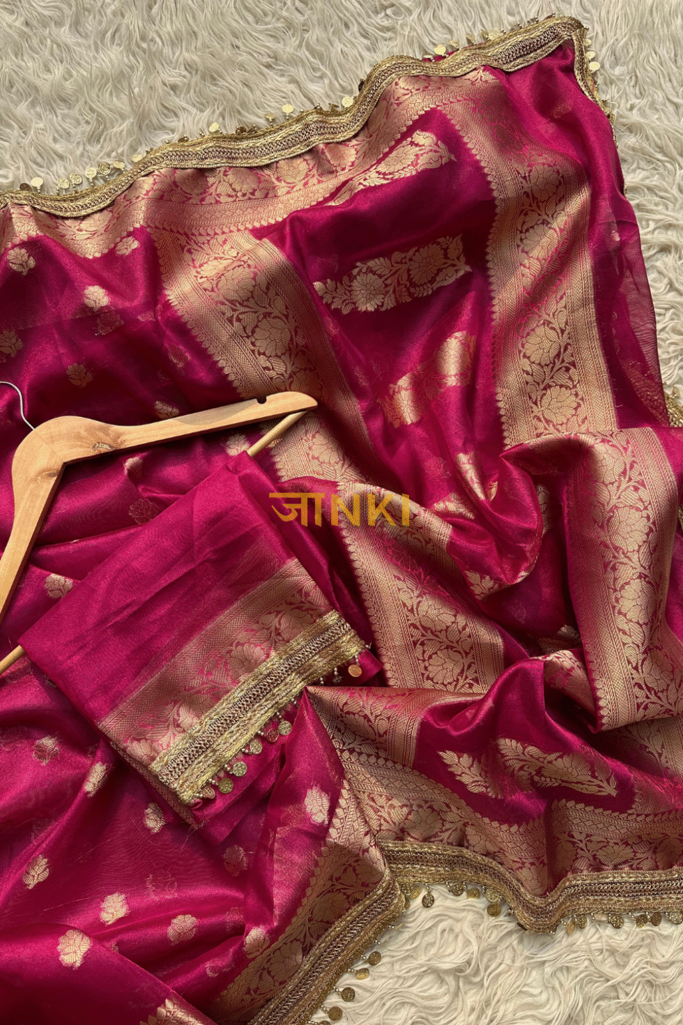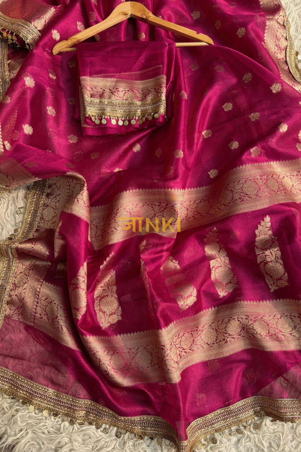 A rich rani pink base—symbolizing grace, charm, and festivity—paired with golden zari weaving. The combination radiates vibrancy and luxury, perfect for occasions that demand a touch of royalty.